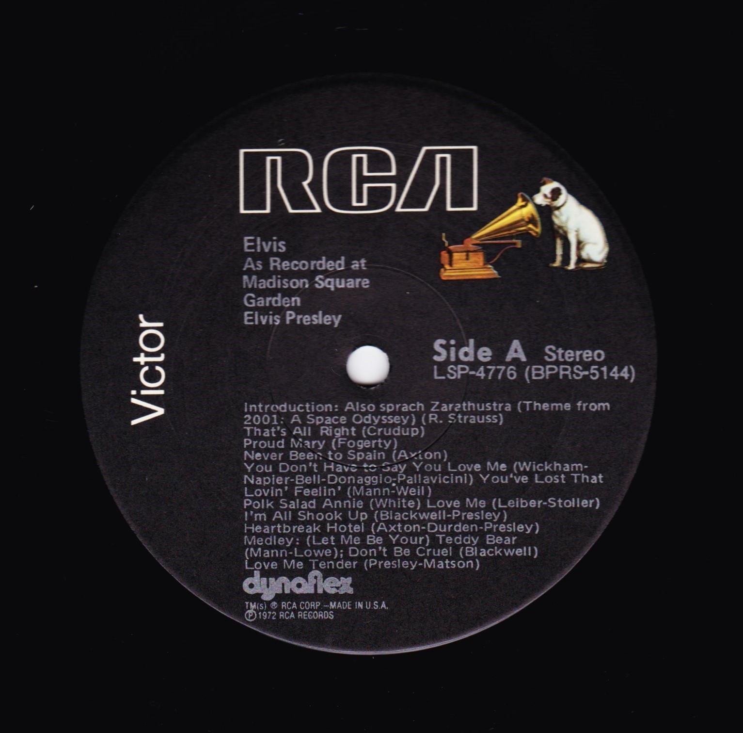 | ront Cover : Title on top. Catalogue number top right. Rear Cover : Advertising 2 Elvis Worldwide box sets. Catalogue number top right. Printed in U.S.A. bottom centre. Label : Orange. Dynaflex vinyl. Side 1 : Stereo at top. Side 2 : Stereo at top. Pressing Plant : Indianapolis Matrix Number Side 1 : APRS - 2007 - 5S A3 (Machine Stamped) Matrix Number Side 2 : APRS - 2008 - 5S A2 (Machine Stamped) *NOTE* Front cover sticker Promotional copy for DJ use "Not For Sale". |