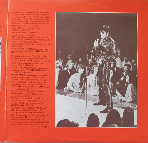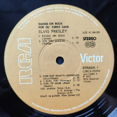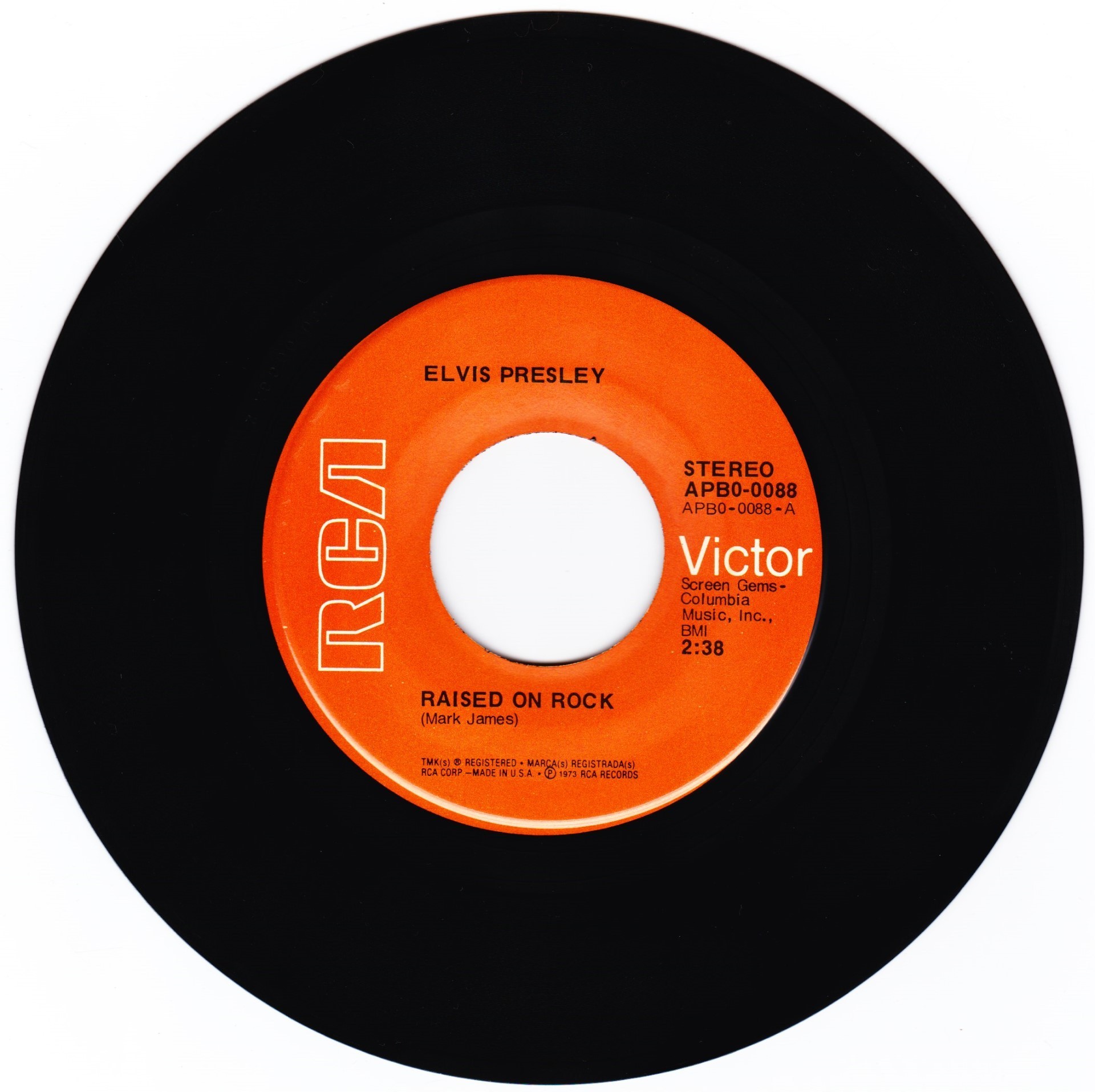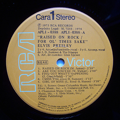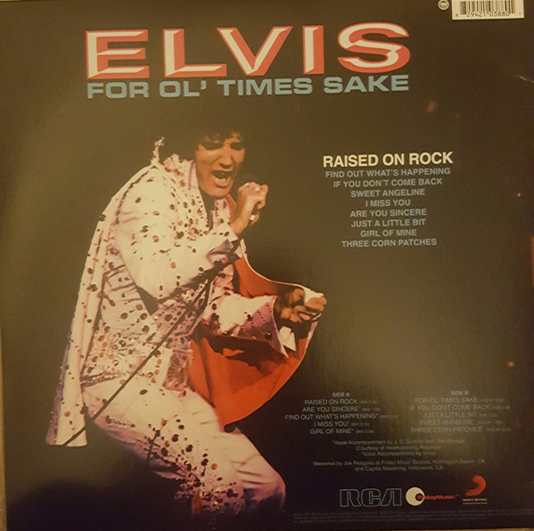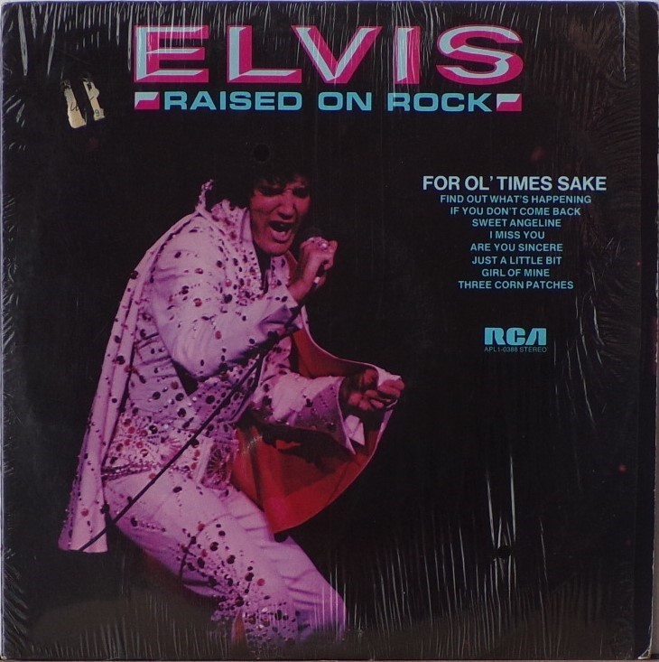 Stax Studio, Memphis, July 21, 1973 Brief History : Raised on Rock is a studio album by Elvis Presley released in 1973. It, along with the album Elvis, were both released after the massive success of Aloha From Hawaii (although the entire Elvis album contained material recorded before the 'Aloha' show). The record sold over 1 million copies worldwide. It was recorded at Stax Studios in Memphis in July 1973 and Presley's home in Palm Springs, California in September 1973. Two songs from these sessions would be retained for release on the Good Times album the following spring. The initial vocal tracks were recorded in July 1973. The album actually was one of the few that failed to chart in the UK, but the single "Raised on Rock"/"For Ol' Times Sake" did enter the British charts. The album had a very different sound about it, more funky and soul-like that many of the previous efforts and was certainly a change in direction. Some of the songs are well known covers like "Are You Sincere" which had been around for many years, but some new songs like the lead off single were actually written for Elvis, or written by writers Elvis trusted such as Mark James. Front Cover : Photo of Elvis. Title on top. Catalogue number right