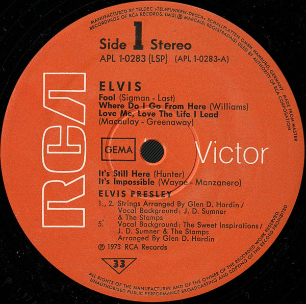 Lead - It's Still Here - It's Impossible Brief History : Elvis is Elvis Presley's self-titled 1973 album. This album is often called The Fool album after one of the songs included in it, in order to differentiate it from the 1956 album of the same title. The album sold over 1 million copies worldwide despite it being released soon after the much more successful Aloha from Hawaii album. Fool and Where Do I Go From Here were recorded in March 1972. It's Impossible is a live recording from the Hilton Hotel in Las Vegas from February 1972. Tracks 3, 4, 6-10 were leftovers from the March and May 1971 recording sessions at RCA's Studio B in Nashville. Three songs feature the King on piano: It's Still Here, I'll Take You Home Again, Kathleen and I Will Be True These three selections were all released together for a second time as part of the 1980 boxed set, Elvis Aron Presley. The song "Fool" was also released in this collection. Four other songs in this album were also reissued in other albums, as well; "It's Impossible" (Pure Gold, 1975), "Padre" (He Walks Beside Me, 1978), "(That's What You Get) For Lovin' Me" (A Canadian Tribute, 1978) and "Don't Think Twice, It's All Right" (Our Memories Of Elvis Volume 2, 1979). The title track "Fool" was issued as a single and managed to reach no 15 in the UK backed by a live version of "Steamroller Blues". On 12/1/2010 the album was certified 5 times Platinum by the RIAA. |