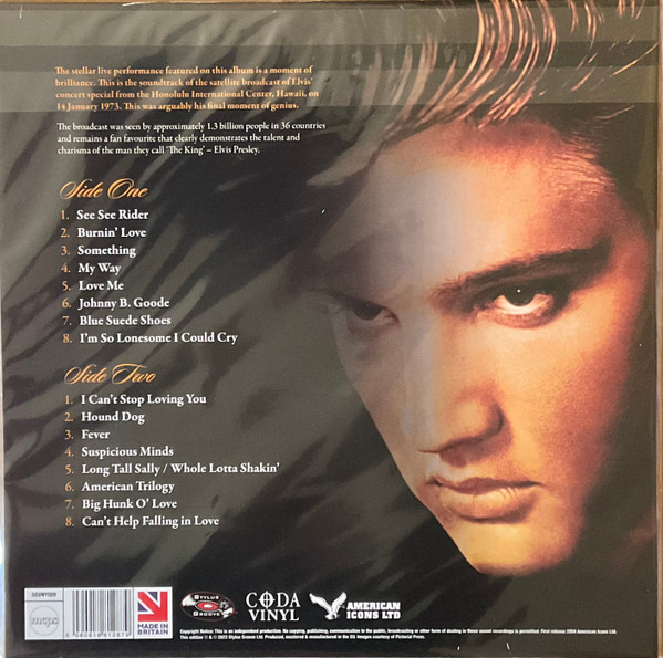 Icons Ltd. – SGVNY029 Format: Vinyl, LP, Limited Edition, Reissue, Unofficial Release, Stereo, Red Country: UK & Europe Released: 2023 Phonographic Copyright – Stylus Groove Ltd. First release 2004 American Icons Ltd. Produced, mastered & manufactured in the EU. Abridged reissue of the Aloha Via Satellite broadcast show. Barcode (Text): 5 060918 812879 |