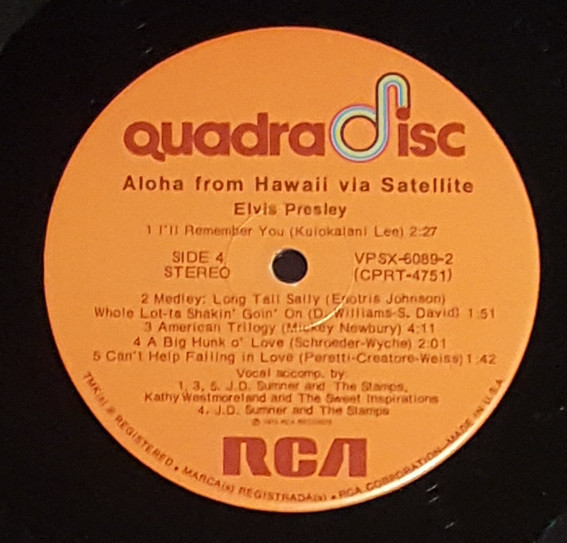 | Details : 1974 Gatefold Front Cover : Die cut. Title top right. Catalogue number bottom right. Quadradisc bottom right. Rear Cover : Advertises "Includes 8 songs never before recorded by Elvis" & song titles. "RE" bottom left. Printed in USA bottom. Label : Orange. Quadradisc vinyl. Side A : Record 1 Catalogue Number under Side A. Side B : Record 1 Catalogue Number under Side B. Side A : Record 2 Catalogue Number under Side A. Side B : Record 2 Catalogue Number under Side B. Pressing Plant : Indianapolis Matrix Number Side 1 : CPRT - 4748 - 24 A5 (Machine Stamped) I (Hand Etched) Matrix Number Side 2 : CPRT - 4749 - 27 A2 (Machine Stamped) N (Hand Etched) Matrix Number Side 3 : CPRT - 4750 - 23 A3 (Machine Stamped) I (Hand Etched) Matrix Number Side 4 : CPRT - 4751 - 20 Q A6 (Machine Stamped) LL (Hand Etched) *NOTE* Front cover has Quadradisc on the bottom right corner. Rear cover Saturn shape includes song titles & "RE" bottom left. No "STEREO" on vinyl labels. Catalogue number inside gatefold bottom left. Quadradisc sticker attached to shrink measures 3 inches x 2 inches. |