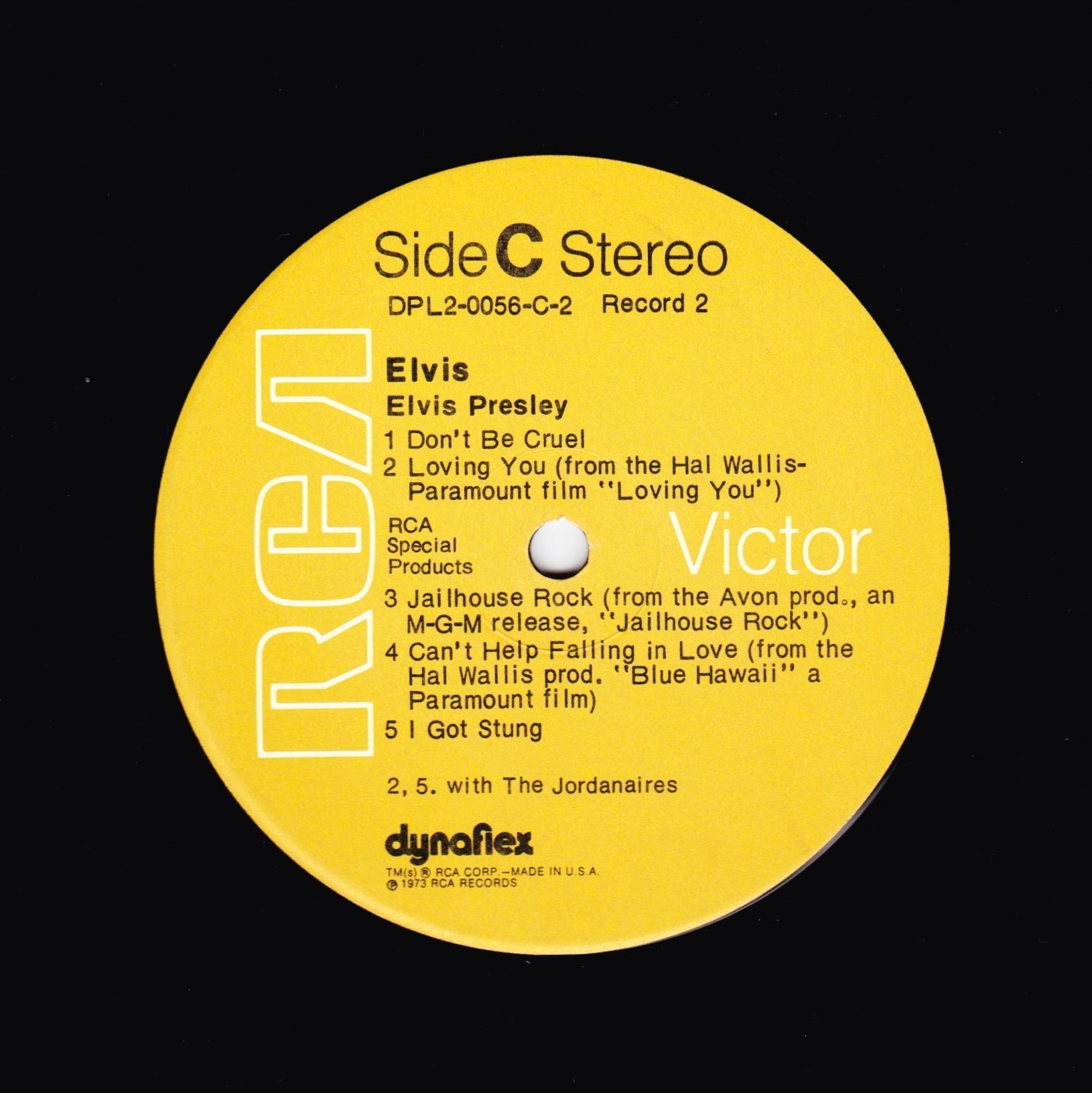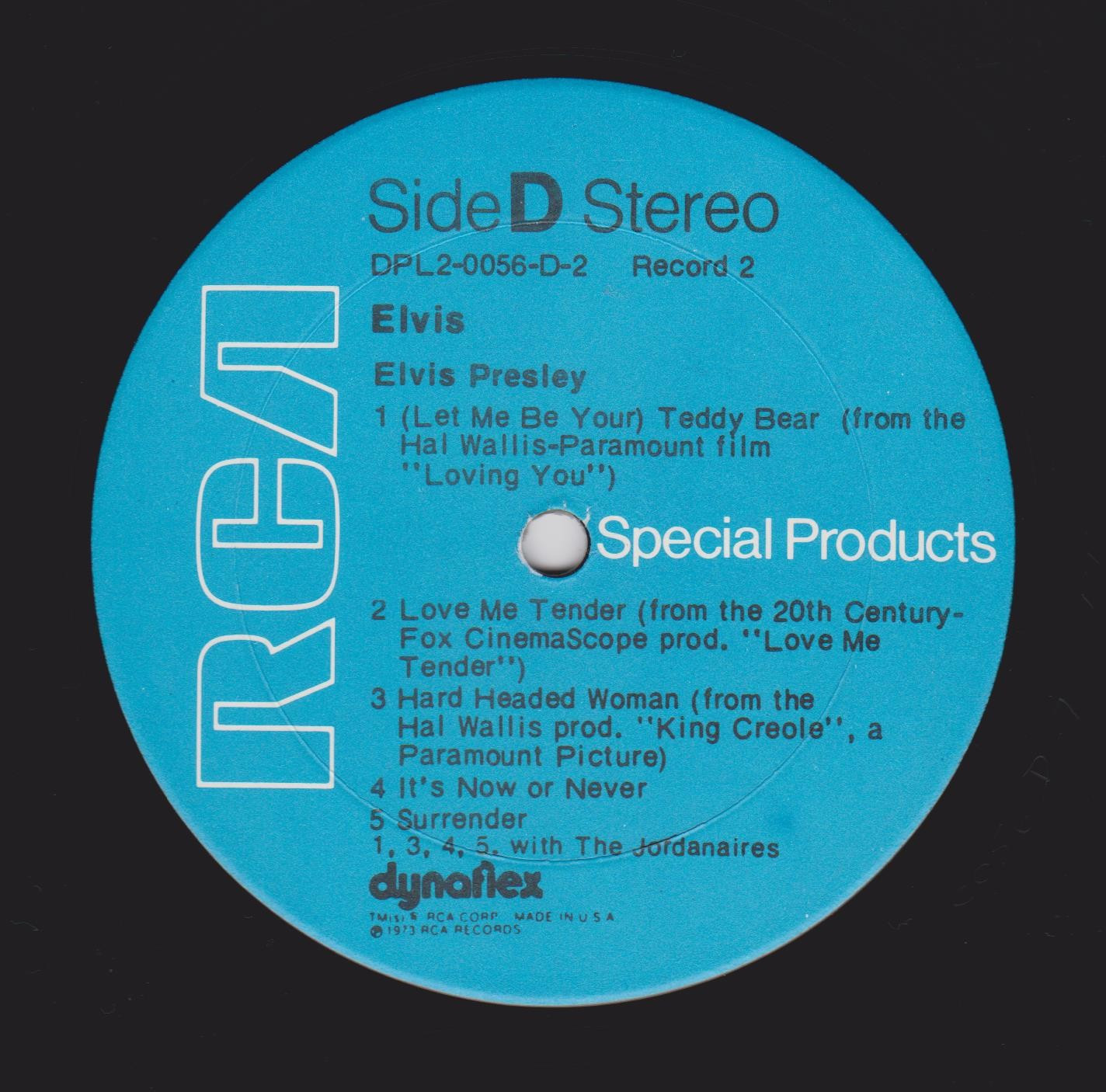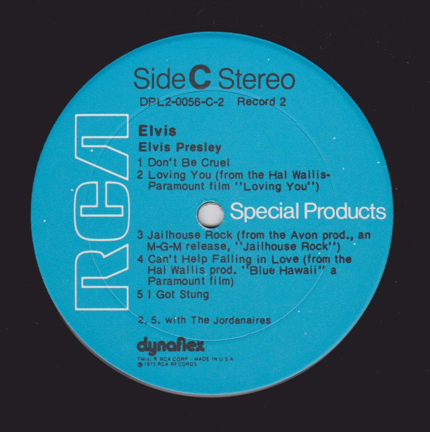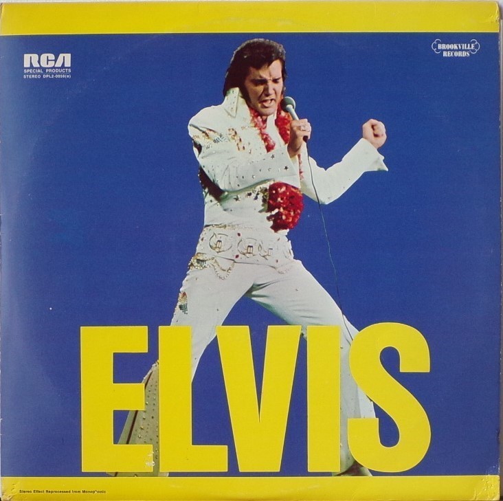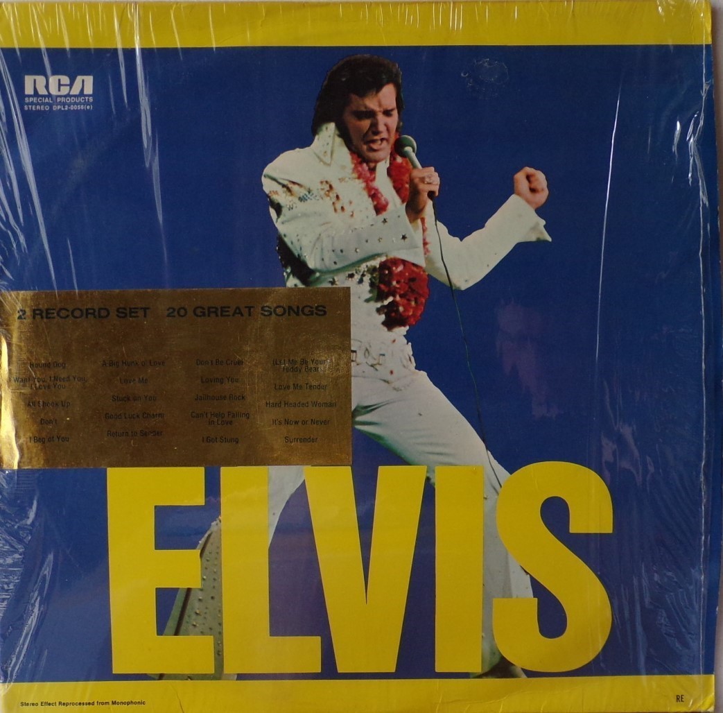 | Album Title : Elvis Catalogue Number : DPL2 - 0056 (e) Year Release : 02nd August 1973 Side 1 : Hound Dog I Want You, I Need You, I Love You All Shook Up Don't I Beg of You Side 2 : A Big Hunk o' Love Love Me Stuck On You Good Luck Charm Return To Sender Side 3 : Don't Be Cruel Loving You Jailhouse Rock Can't Help Falling In Love I Got Stung Side 4 : (Let Me Be Your) Teddy Bear Love Me Tender Hard Headed Woman It's Now Or Never Surrender Brief History : This was a single sleeve double album released on Brookville Records. The release is an RCA Special Products issue. Brookville Records logo is seen in the upper right hand corner of the front cover. The labels on this release were a mustard colour. Front Cover : Title bottom. Catalogue number top left under "Special