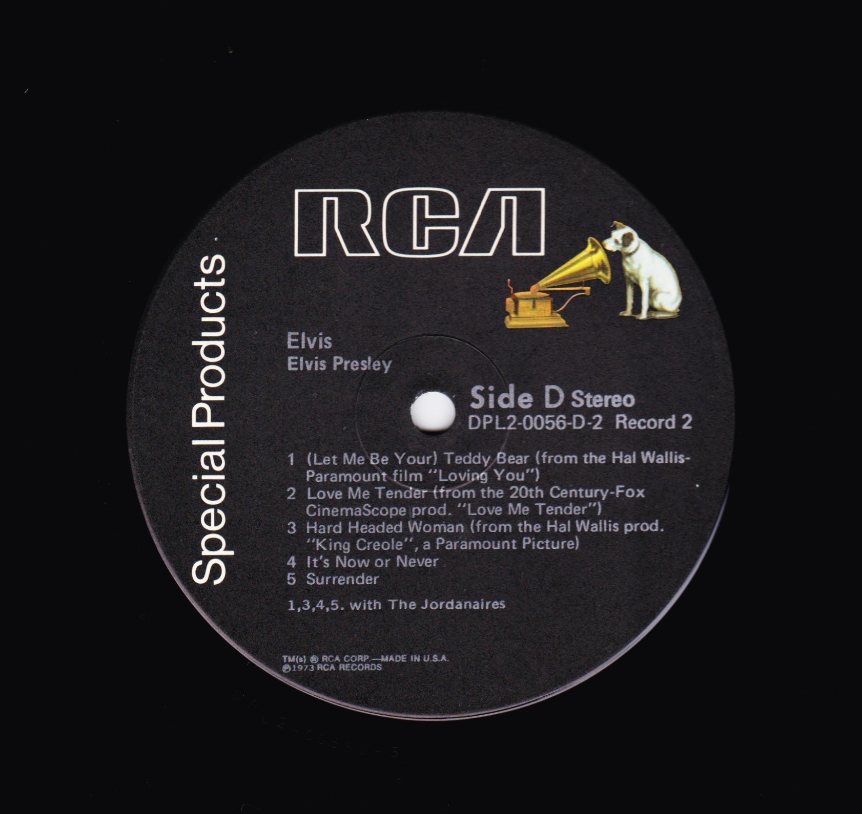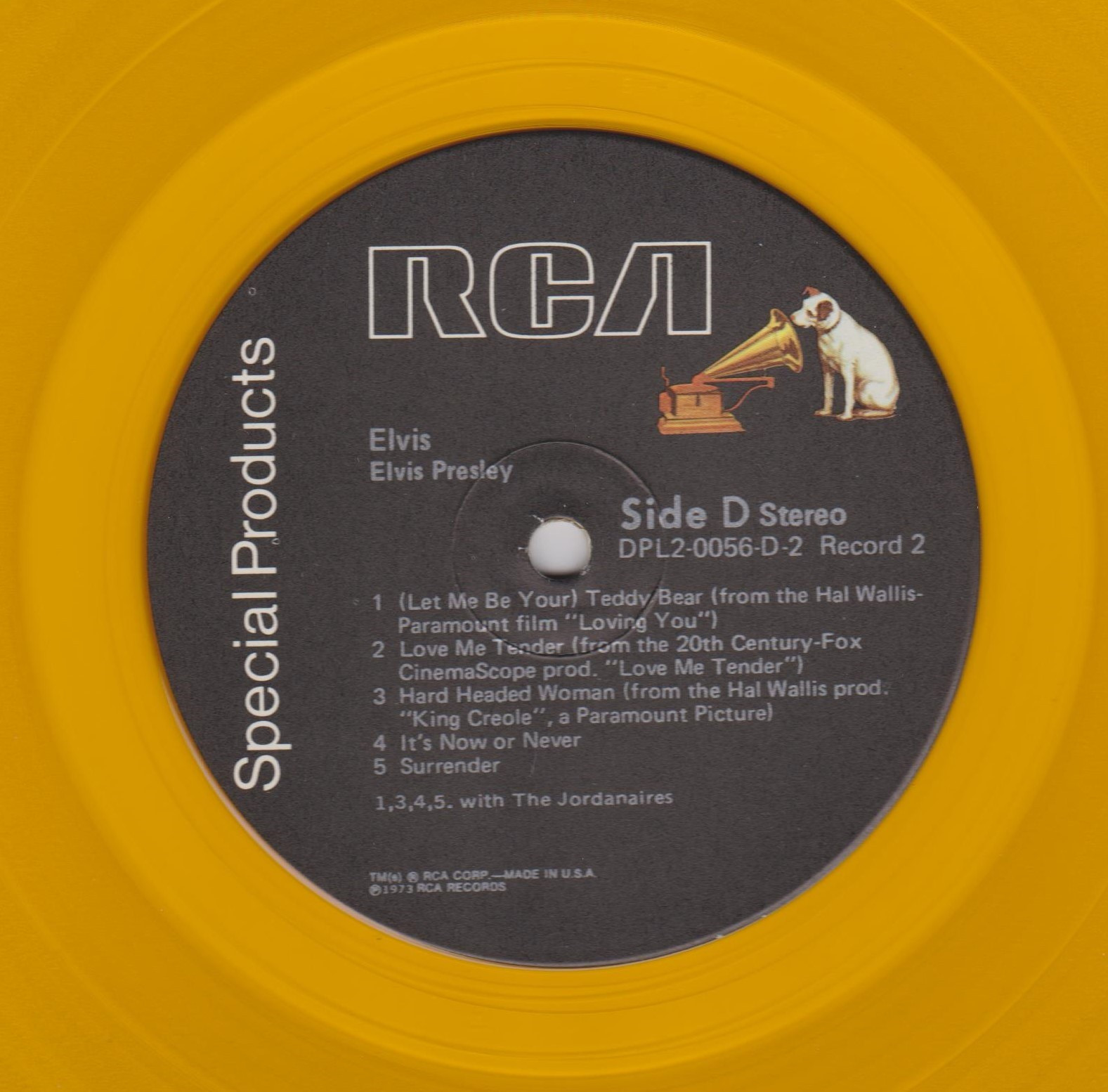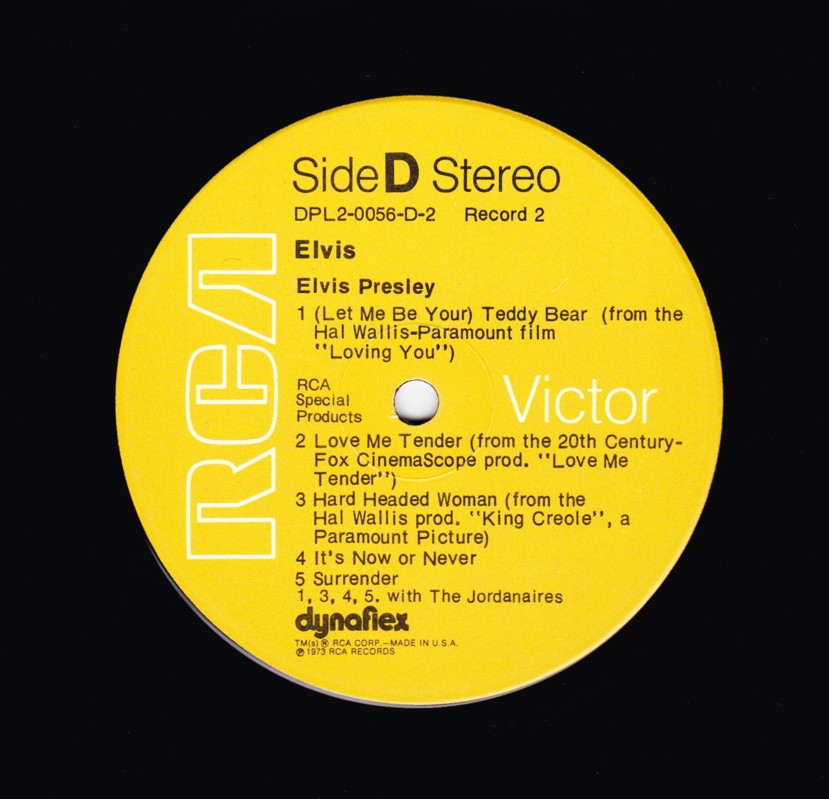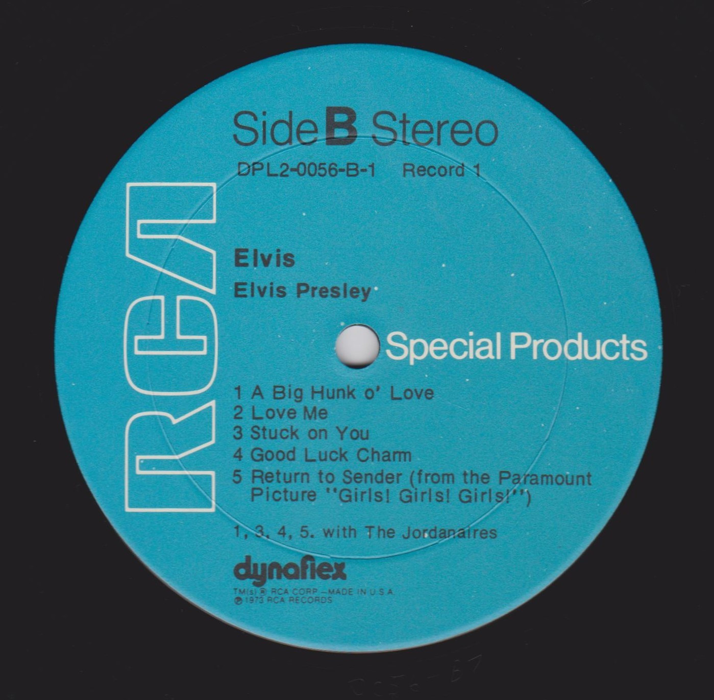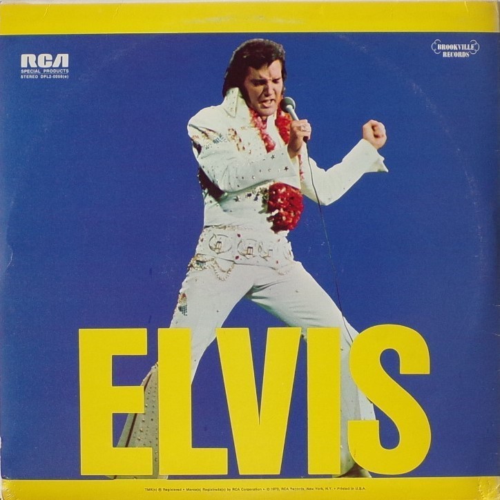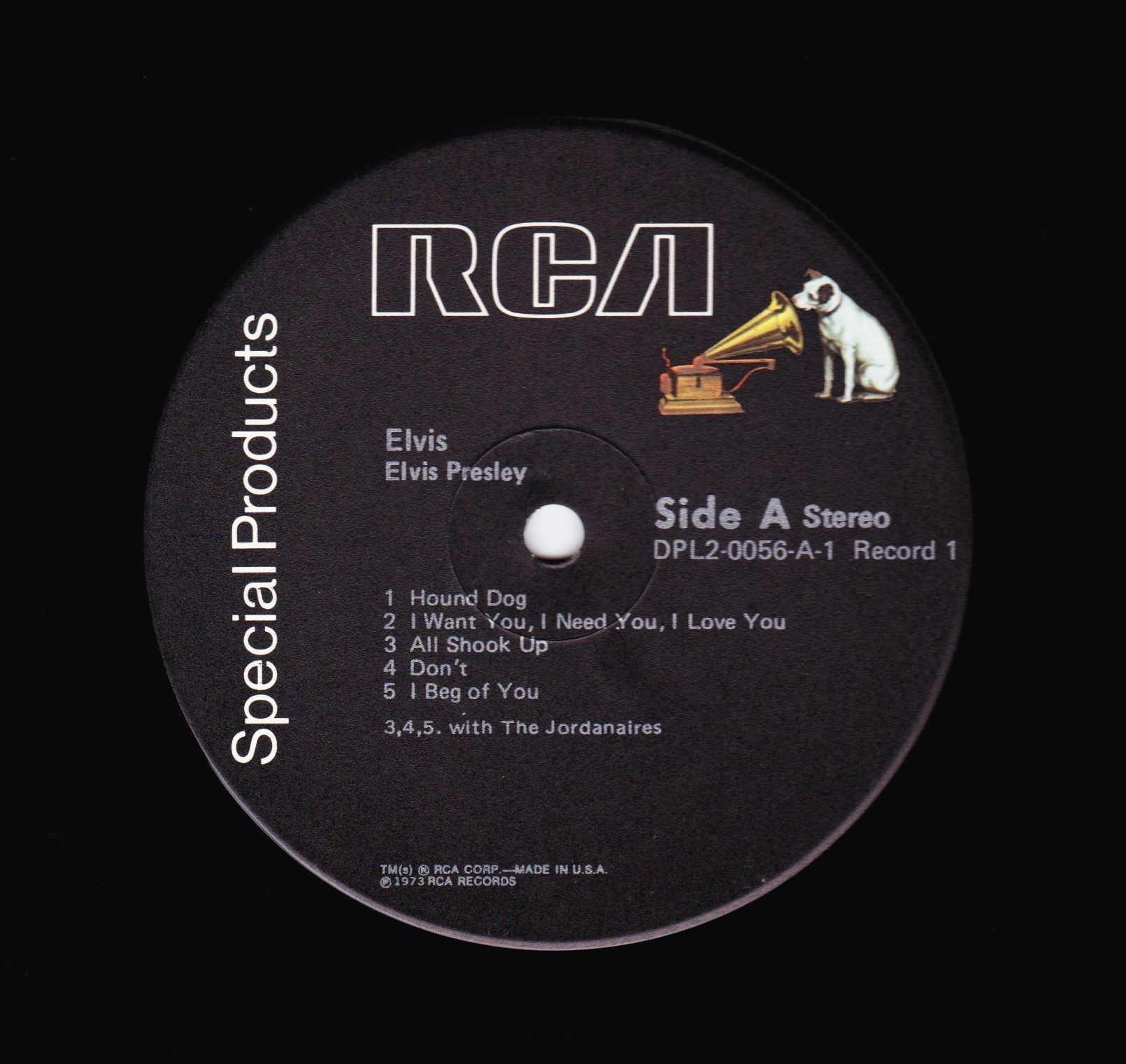 | Album Title : Elvis Catalogue Number : DPL2 - 0056 (e) Year Release : 02nd August 1973 Side 1 : Hound Dog I Want You, I Need You, I Love You All Shook Up Don't I Beg of You Side 2 : A Big Hunk o' Love Love Me Stuck On You Good Luck Charm Return To Sender Side 3 : Don't Be Cruel Loving You Jailhouse Rock Can't Help Falling In Love I Got Stung Side 4 : (Let Me Be Your) Teddy Bear Love Me Tender Hard Headed Woman It's Now Or Never Surrender Brief History : This was a single sleeve double album released on Brookville Records. The release is an RCA Special Products issue. Brookville Records logo is seen in the upper right hand corner of the front cover. The labels on this release were a mustard colour. Front Cover : Title bottom. Catalogue number top left under "Special