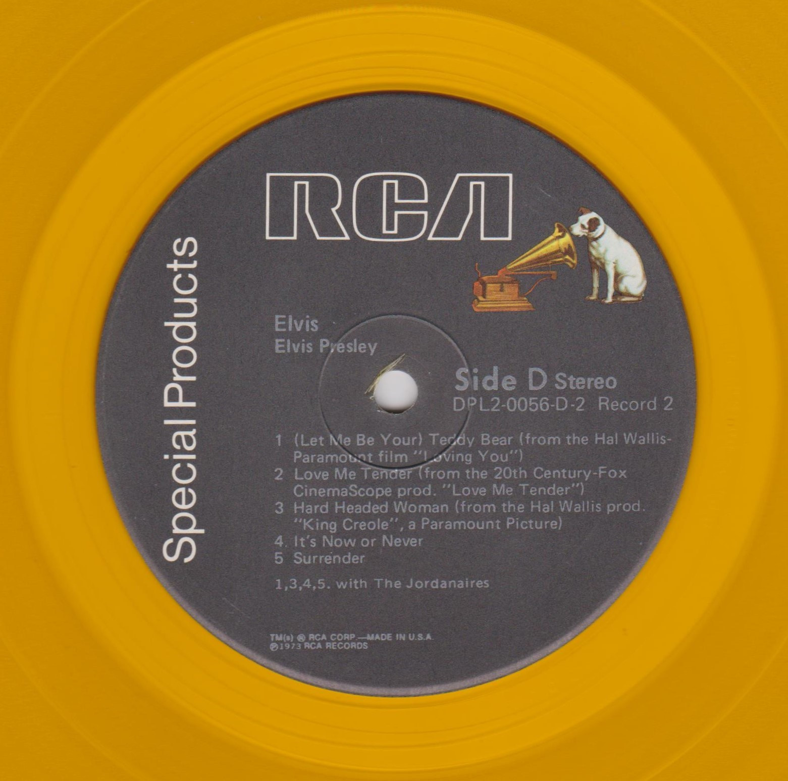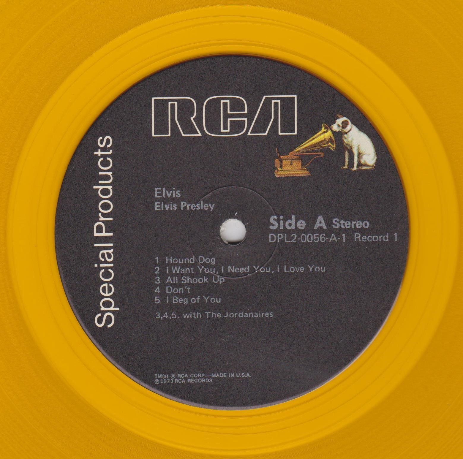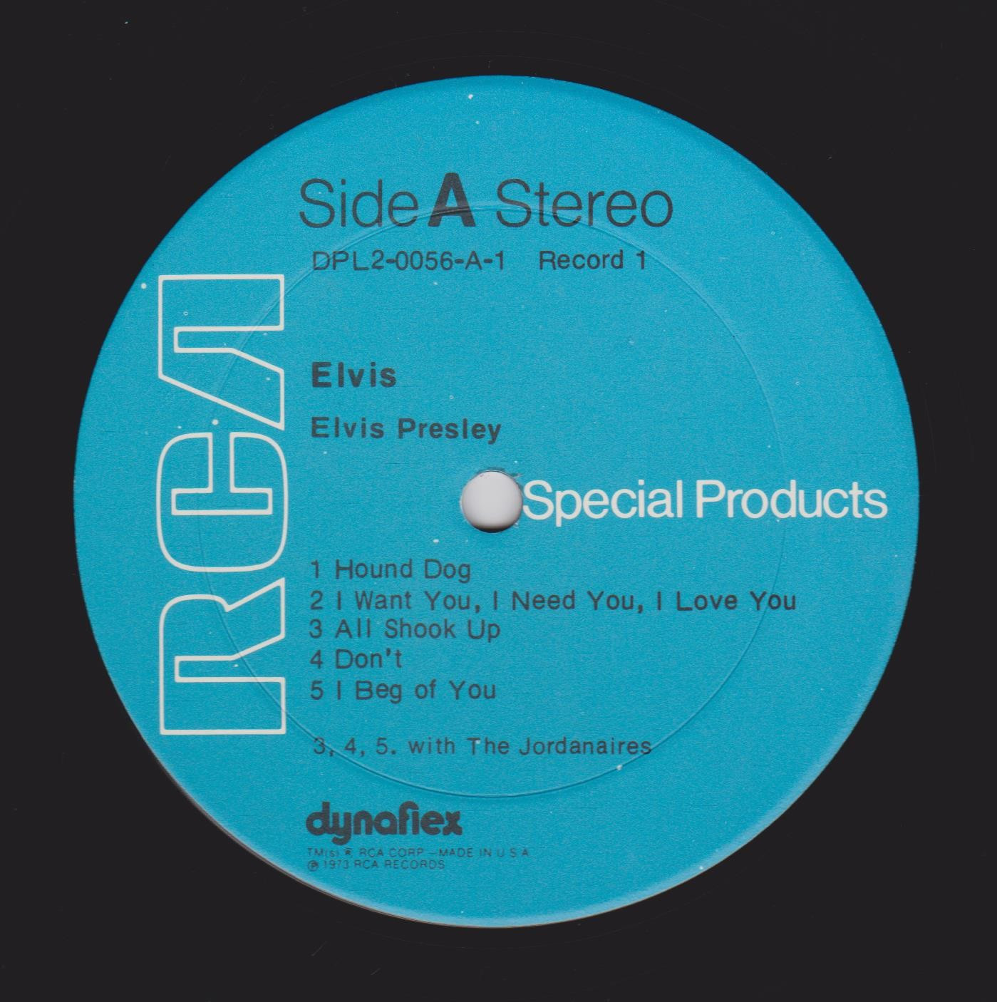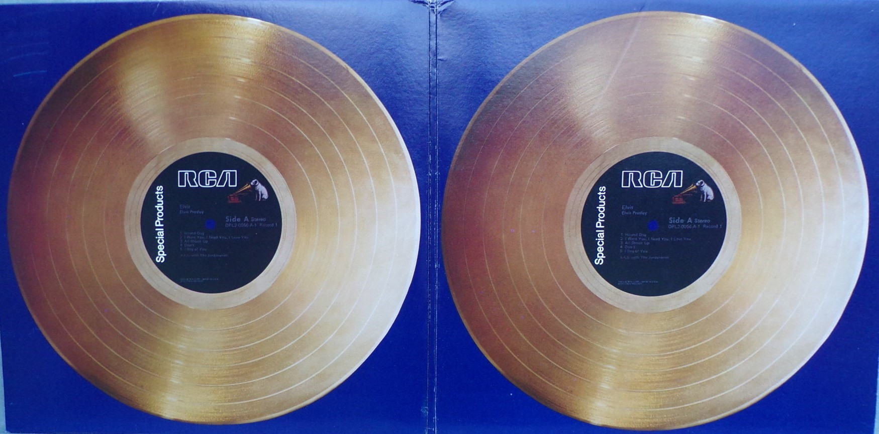 | Album Title : Elvis Catalogue Number : DPL2 - 0056 (e) Year Release : 02nd August 1973 Side 1 : Hound Dog I Want You, I Need You, I Love You All Shook Up Don't I Beg of You Side 2 : A Big Hunk o' Love Love Me Stuck On You Good Luck Charm Return To Sender Side 3 : Don't Be Cruel Loving You Jailhouse Rock Can't Help Falling In Love I Got Stung Side 4 : (Let Me Be Your) Teddy Bear Love Me Tender Hard Headed Woman It's Now Or Never Surrender Brief History : This was a single sleeve double album released on Brookville Records. The release is an RCA Special Products issue. Brookville Records logo is seen in the upper right hand corner of the front cover. The labels on this release were a mustard colour. Front Cover : Title bottom. Catalogue number top left under "Special