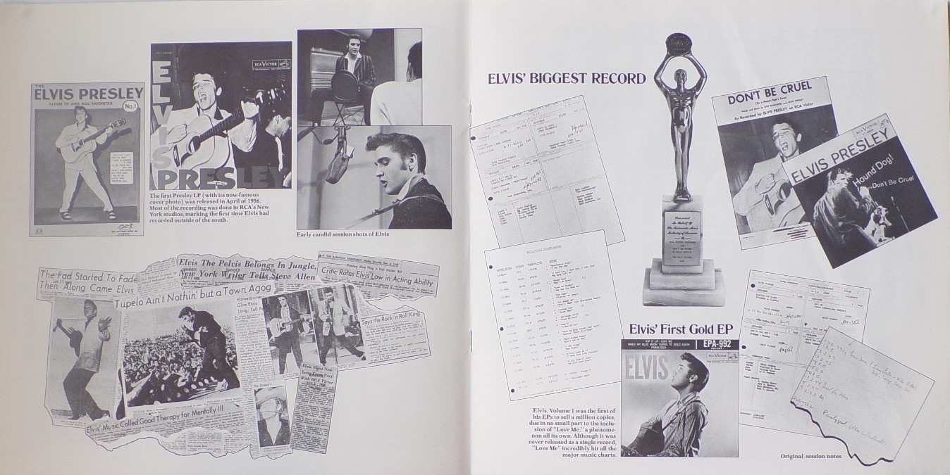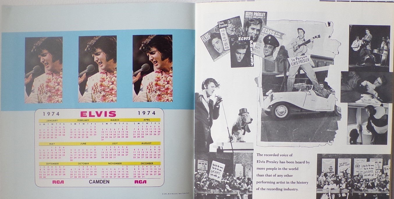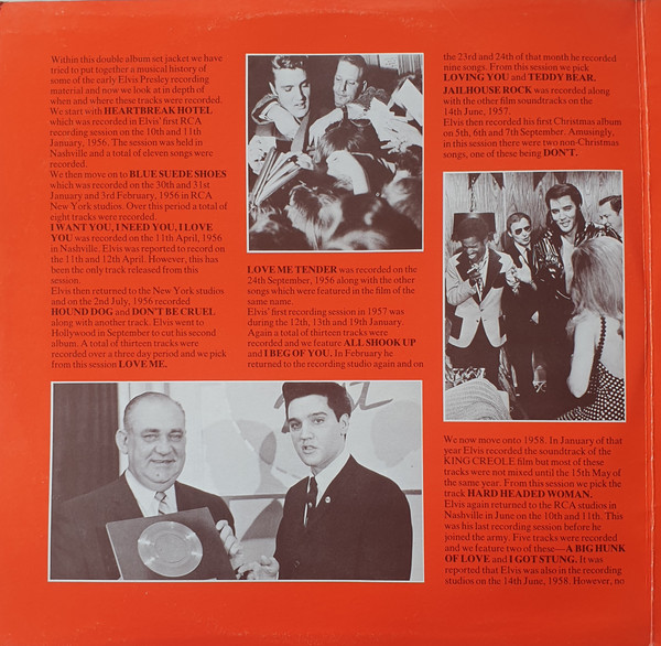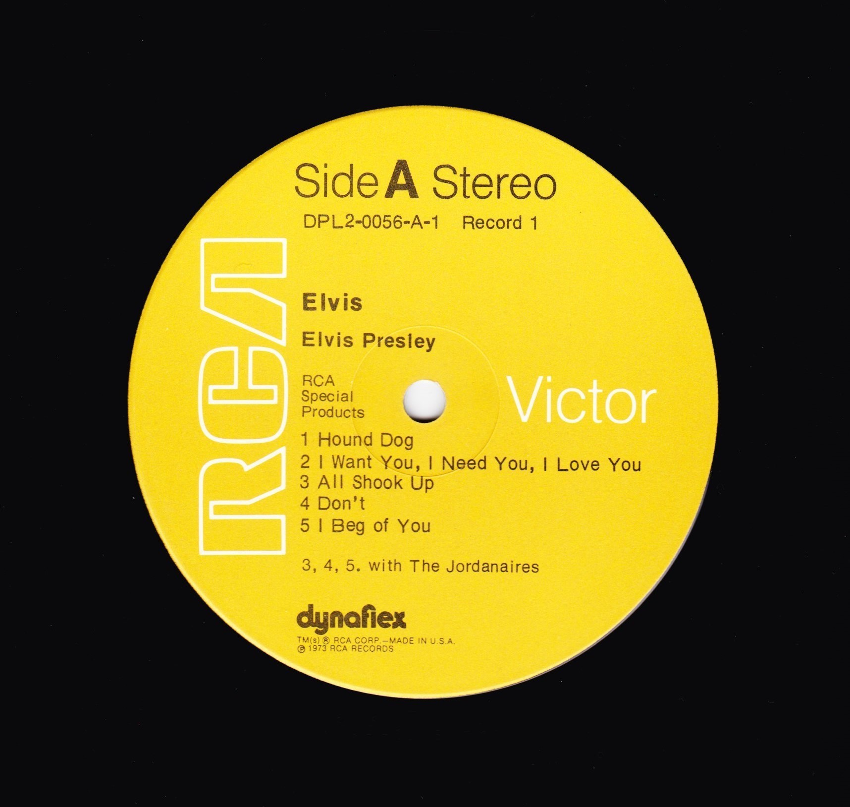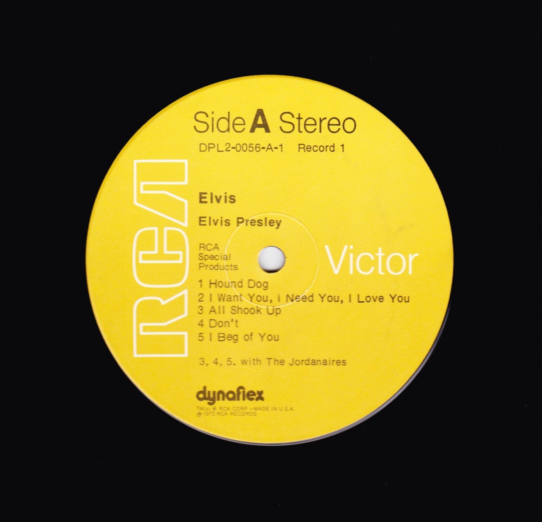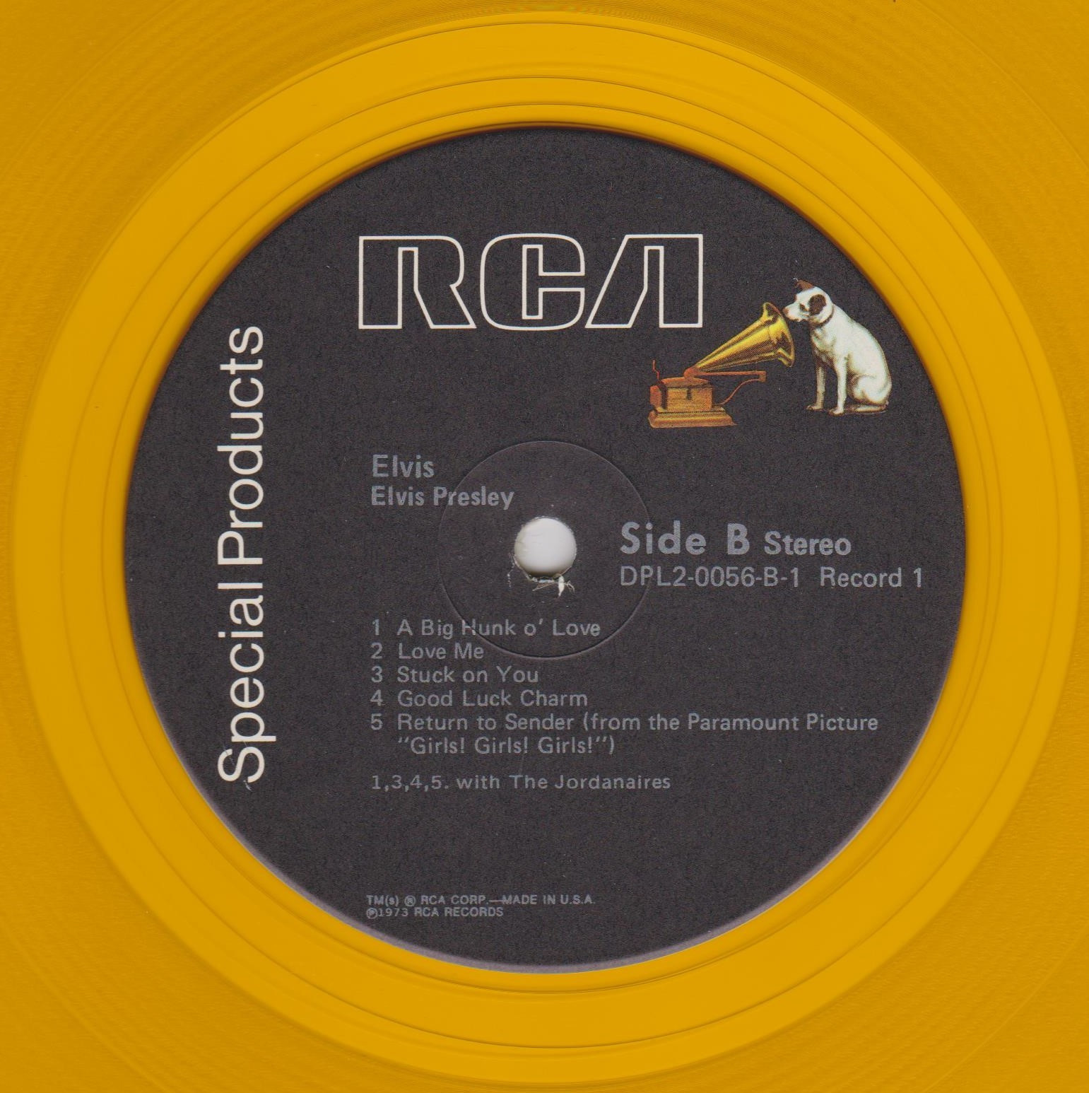 | Album Title : Elvis Catalogue Number : DPL2 - 0056 (e) Year Release : 02nd August 1973 Side 1 : Hound Dog I Want You, I Need You, I Love You All Shook Up Don't I Beg of You Side 2 : A Big Hunk o' Love Love Me Stuck On You Good Luck Charm Return To Sender Side 3 : Don't Be Cruel Loving You Jailhouse Rock Can't Help Falling In Love I Got Stung Side 4 : (Let Me Be Your) Teddy Bear Love Me Tender Hard Headed Woman It's Now Or Never Surrender Brief History : This was a single sleeve double album released on Brookville Records. The release is an RCA Special Products issue. Brookville Records logo is seen in the upper right hand corner of the front cover. The labels on this release were a mustard colour. Front Cover : Title bottom. Catalogue number top left under "Special