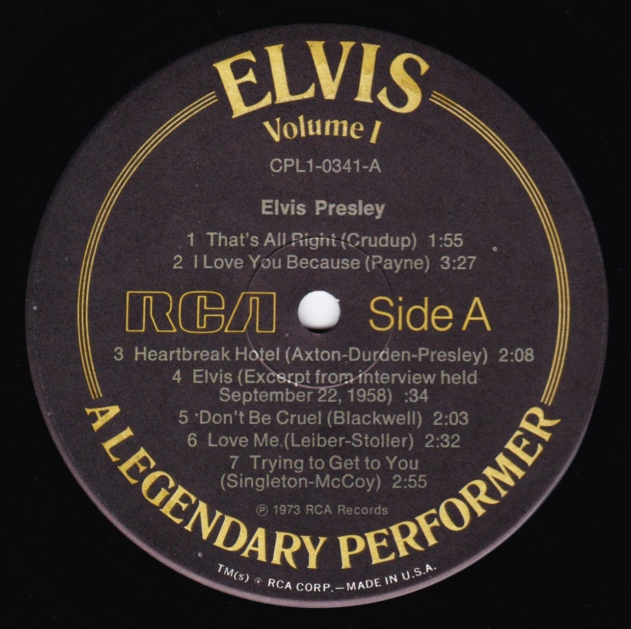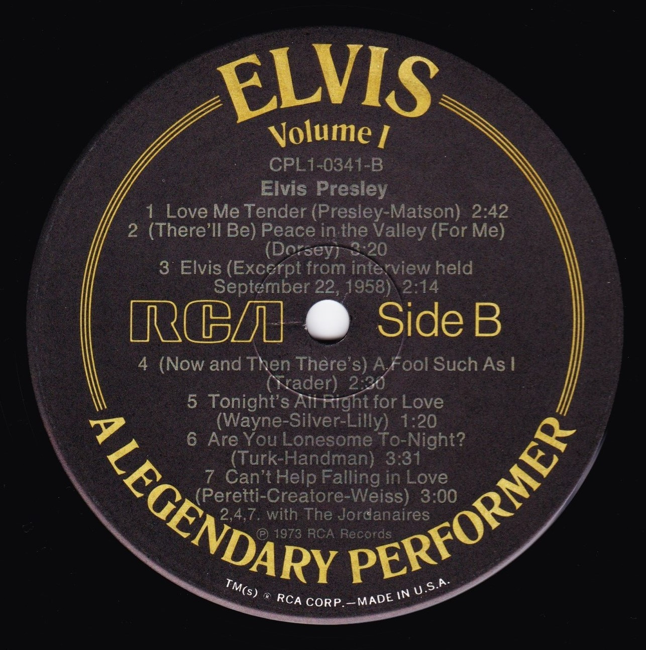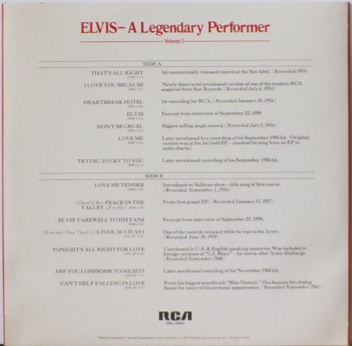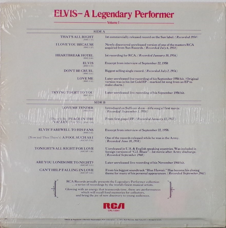 - A LEGENDARY PERFORMER, VOLUME 1 (LP) (US) RCA CPL1 0341 Released: November 1973 Side 1 That's All Right I Love You Because (Take 2) * Heartbreak Hotel Excerpt From "Elvis Sails" Don't Be Cruel Love Me *** Trying To Get To You *** Side 2 Love Me Tender Peace In The Valley Excerpt From "Elvis Sails" Fool Such As I Tonight's All Right For Love ** Are You Lonesome Tonight *** Can't Help Falling In Love *