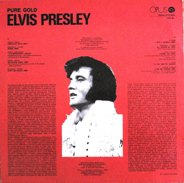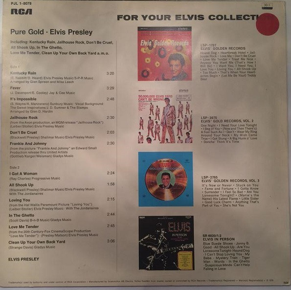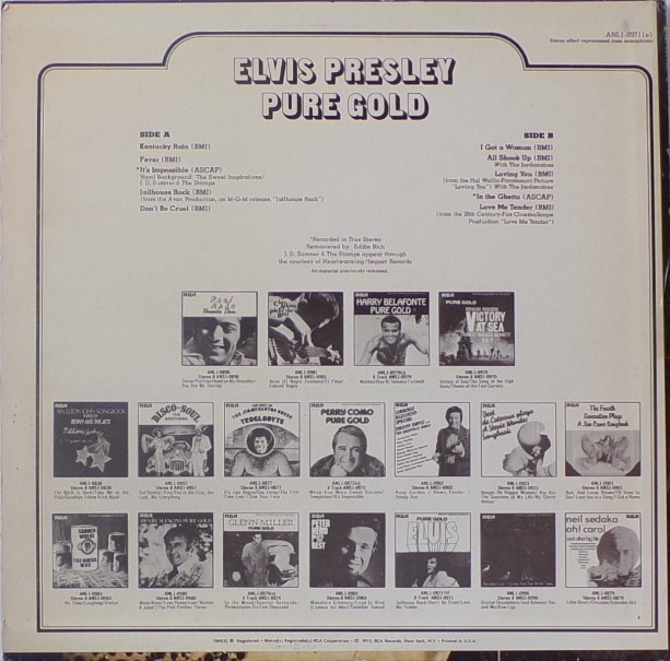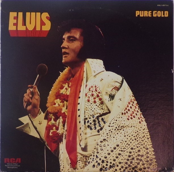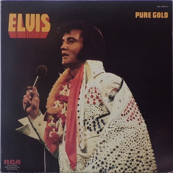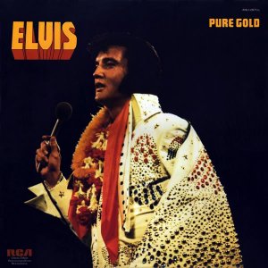 GOLD (LP) Brief History : Pure Gold is a 1975 compilation album by Elvis Presley released as part of RCA's budget "Pure Gold" series of albums. Though at this point in his career Presley was focused more on the country music market, where he had a string of chart-topping records in recent years, this compilation focuses more on earlier material than recent hits. "Kentucky Rain", "Fever", "It's Impossible", and "In The Ghetto" are true stereo mixes. All other tracks are in "electronically reprocessed" stereo. When this album was eventually issued on CD in the early 1990s, the 6 songs from the 50's were restored to original monaural sound. It was certified Gold on 9/12/1977, Platinum on 3/20/1988 and 2x Platinum on 3/27/1992 by the RIAA. The front cover photo features Elvis from his Aloha from Hawaii concert in 1973. Front Cover : Photo of Elvis. Title top right. Catalogue