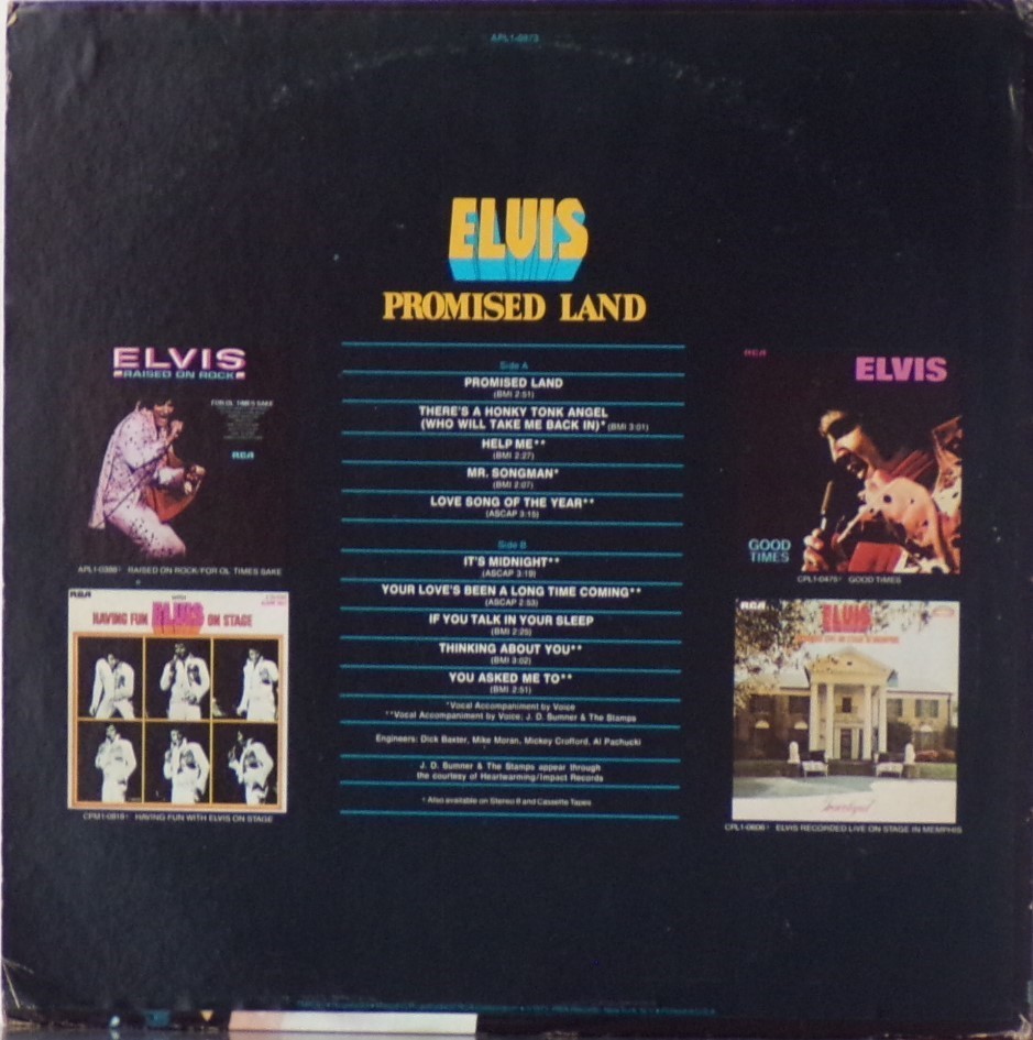 LAND (LP) (US) RCA APL1 0873 Released: January 1975 Side 1 Promised Land There's A Honky Tonk Angel (Who Will Take Me Back In) *** Help Me Mr Songman ** Love Song Of The Year ** Side 2 It's Midnight Your Love's Been A Long Time Coming *** If You Talk In Your Sleep Thinking About You ** You Asked Me To * * Recorded: Stax Studios, Memphis, December