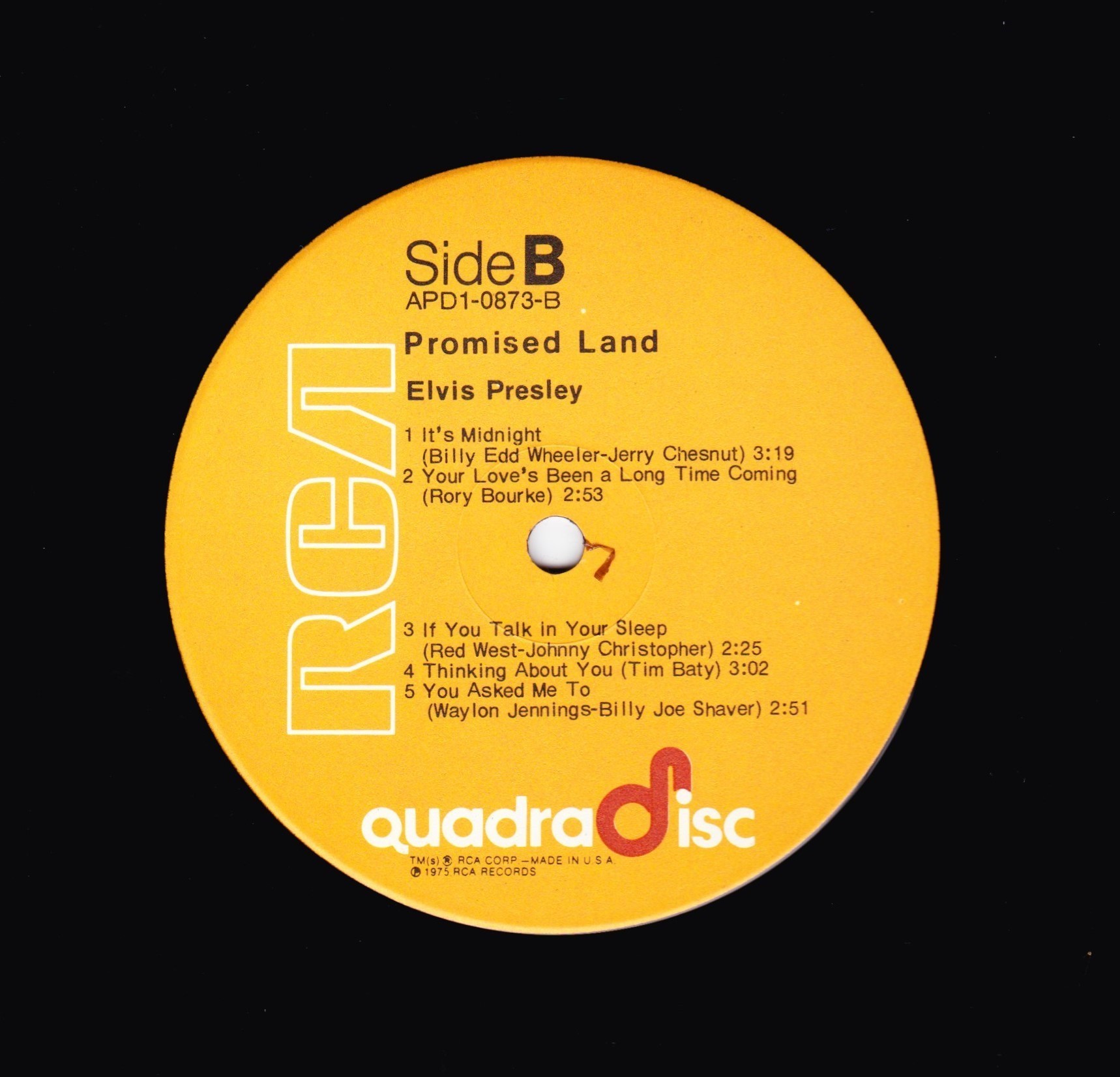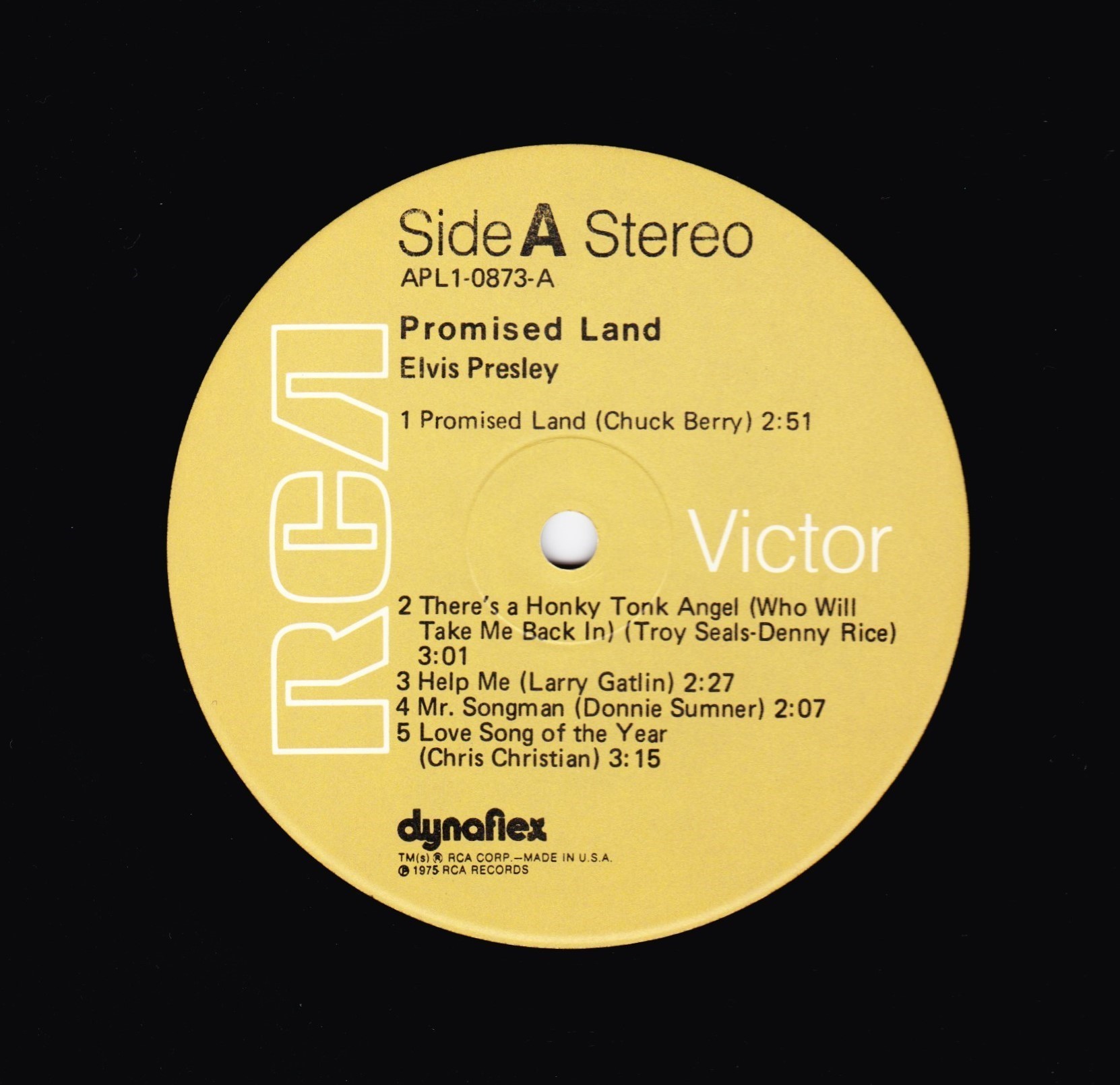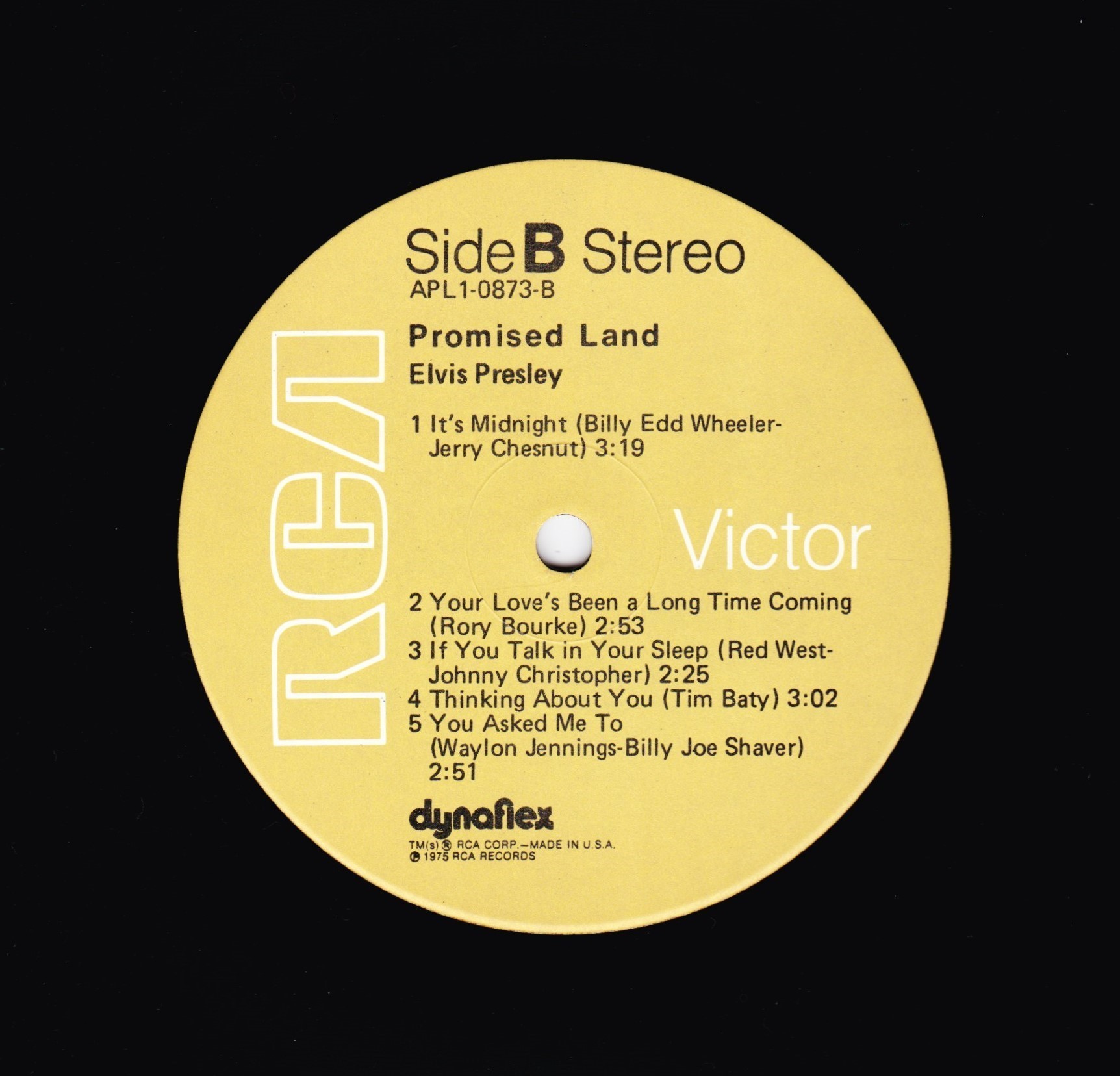 top right & bottom left. Rear Cover : Advert for 4 Elvis albums. Catalogue number top centre. Printed in U.S.A. bottom. Label : Tan. Dynaflex vinyl. Side A : Stereo at top. Side B : Stereo at top. Pressing Plant : Indianapolis Matrix Number Side A : APL1 - 0873 A - 1S (Machine Stamped) Matrix Number Side B : APL1 - 0873 B - 1S (Machine Stamped) *NOTE* Flat label. |