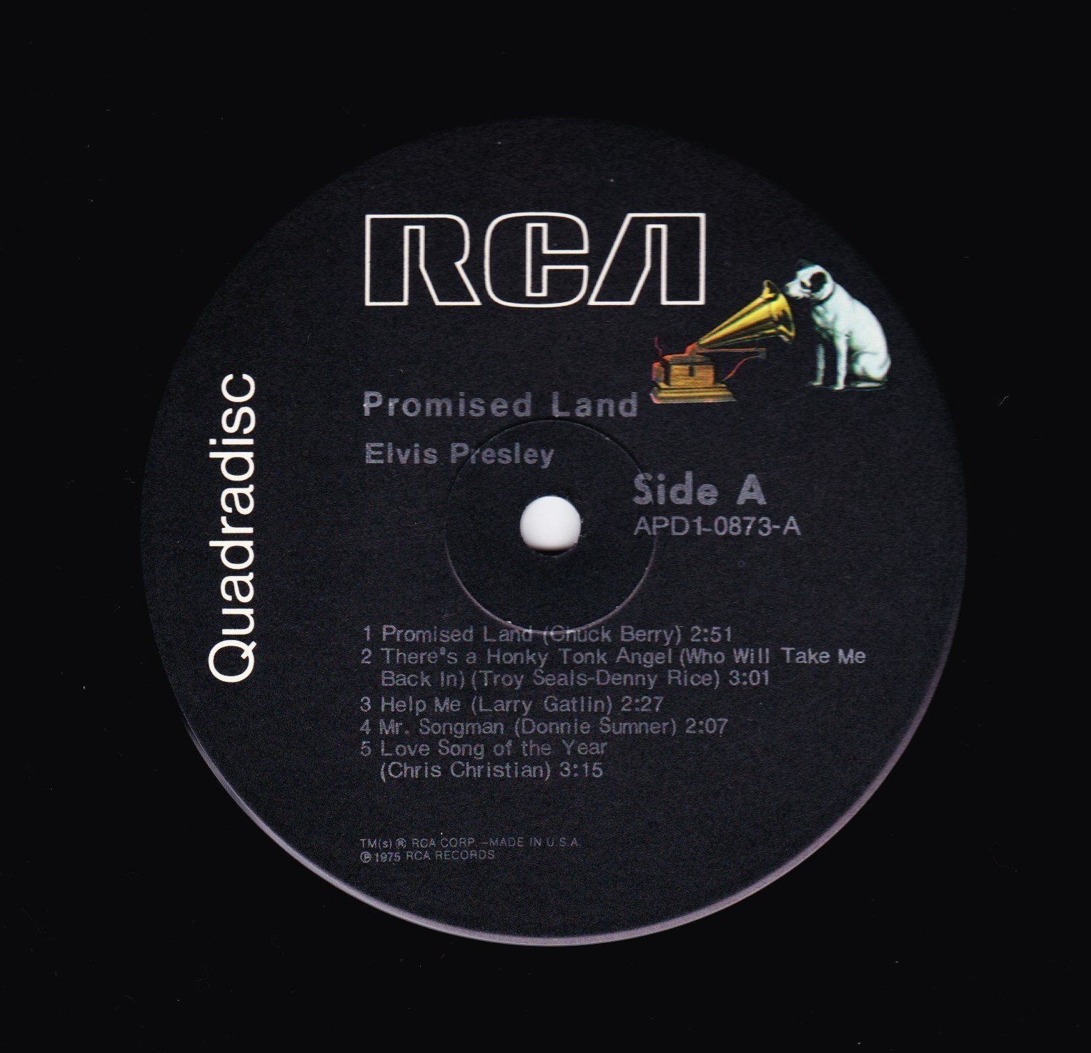 | Details : 1977 Reissue Front Cover : Photo of Elvis. Title top left under Quadradisc. Catalogue number top right & bottom left. Rear Cover : Advert for 4 Elvis albums. Catalogue number top centre. Printed in U.S.A. bottom. Label : Black. Quadradisc vinyl. Dog near top. Side A : RCA logo at top. Side B : RCA logo at top. Pressing Plant : Indianapolis Matrix Number Side A : ADL1 - 0873 A - 2 Q A1 (Machine Stamped) E (Hand Etched) Matrix Number Side B : APL1 - 0873 B - 1 Q A1 (Machine Stamped) D (Hand Etched) *NOTE* Quadradisc now on side of vinyl label. |
