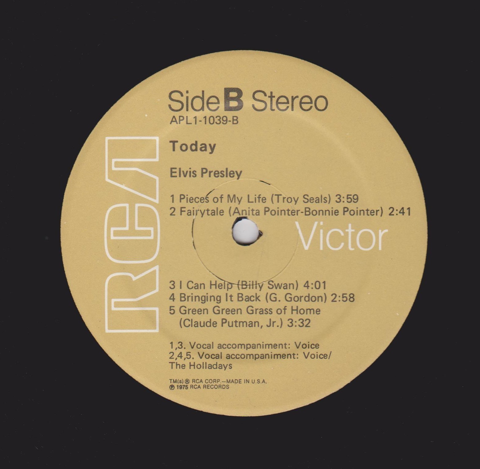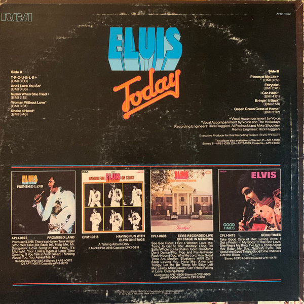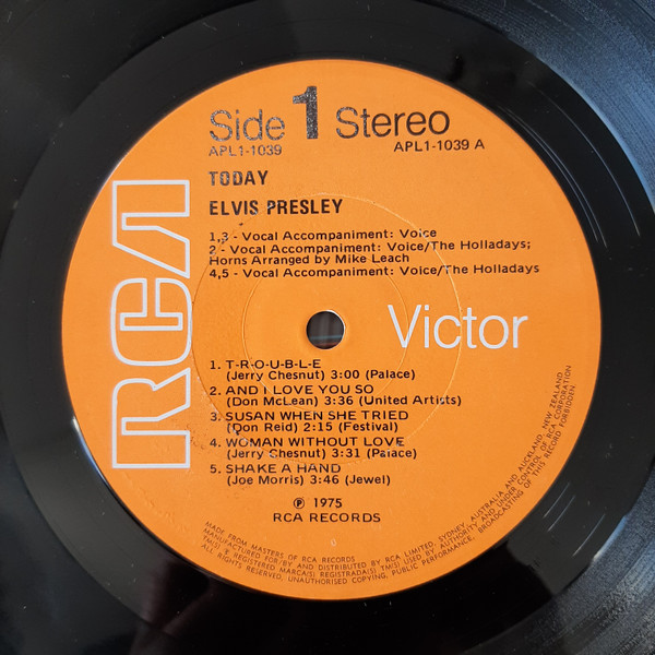 TODAY (LP) (US) RCA APL1 1039 Label: RCA Victor – APL1-1039 Format: Vinyl, LP, Album Country: US Released: 1975 Side 1 T-R-O-U-B-L-E And I Love You So ** Susan When She Tried ** Woman Without Love *** Shake A Hand *** Side 2 Pieces Of My Life **** Fairytale * I Can Help ** Bringin' It Back *** Green, Green Grass Of Home ** *