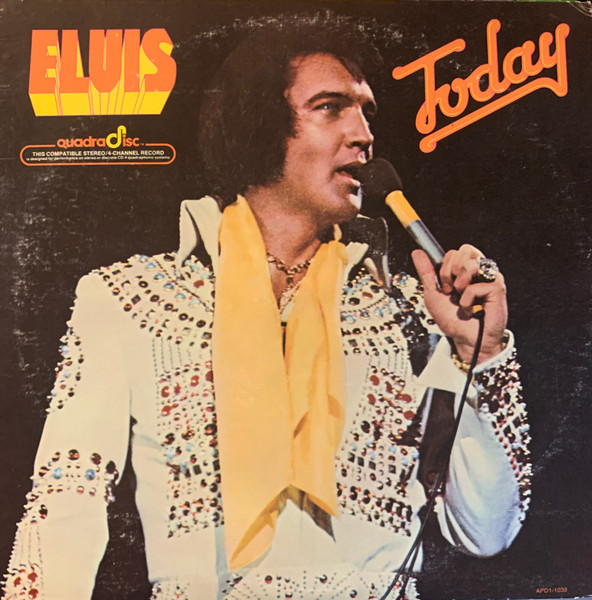 Catalogue Number : APD1 - 0873 Brief History : CD-4 (Compatible Discrete 4) / Quadradisc Compatible Discrete 4 (CD-4) or Quadradisc (not to be confused with compact disc) was introduced in May 1972 as a discrete quadraphonic system created by JVC and RCA. Record companies who adopted this format include Arista, Atlantic, Capricorn, Elektra, Fantasy, JVC, Nonesuch, A & M, Reprise and Warner. This was the only fully discrete quadraphonic phonograph record system to gain major industry acceptance. n the CD-4 system, the quadraphonic audio was divided into left and right channels, which were recorded orthogonally in the vertical plane of the disc groove, which is the case with normal stereo. The audio frequencies (20 Hz to 15 kHz), often referred to as the sum channel, would contain the sum of the left front plus left back signals in the left channel and the sum of the right front plus the right back signals in the right channel. In other words, when observing the audio frequencies only, the record appeared to have an ordinary stereo recording. Along with this audio, a separate 30 kHz carrier was recorded on each groove wall. The carrier on each side carried the difference signal for that side. This was the information that enabled a combined signal to be resolved into two separate signals. For the left carrier it would be left front minus left back, and for the right carrier it would be the right front minus the right back. These audio signals were modulated onto the carriers using a special FM-PM-SSBFM (frequency modulation-phase modulation-single sideband frequency modulation) technique. This created an extended carrier frequency range from 18 kHz to 45 kHz for the left and right channels. The algebraic addition and subtraction of the sum and difference signals would then yield compatible and discrete quadraphonic playback. CD-4 was responsible for major improvements in phonograph technology including better compliance, lower distortion levels, pick-up cartridges with a significantly higher frequency range, and new record compounds such as Q-540, which were highly anti-static. A typical CD-4 system would have a turntable with a CD-4 cartridge, a CD-4 demodulator, a discrete four-channel amplifier, and (ideally) four full-range loudspeakers. Some manufactures built the CD-4 demodulator into complete four-channel receivers. Simply put, CD-4 consists of four recorded signals (LF, LB, RB, RF) and the following coding matrix, similar to FM broadcast stereo multiplexing. The CD-4 encoding/decoding matrix: There was also a similar FM radio system called Quadracast. But CD-4 (and quadraphonic audio in general) failed due to late FCC approval of FM quadraphonic broadcasting, the improvements CD-4 engendered spilled over into, and substantially improved, the production of conventional stereo LP records. The CD-4 record track is broader than a conventional stereo track, so maximum the playing time is lower than a conventional stereo record. Quadradiscs/CD-4 records were seldom called quadraphonic. When a record was called quadraphonic it was almost always an SQ-encoded or an other matrixed record. But when a record was called quadradisc it was always a CD-4 record. Front Cover : Photo of Elvis. Title top left under Quadradisc.