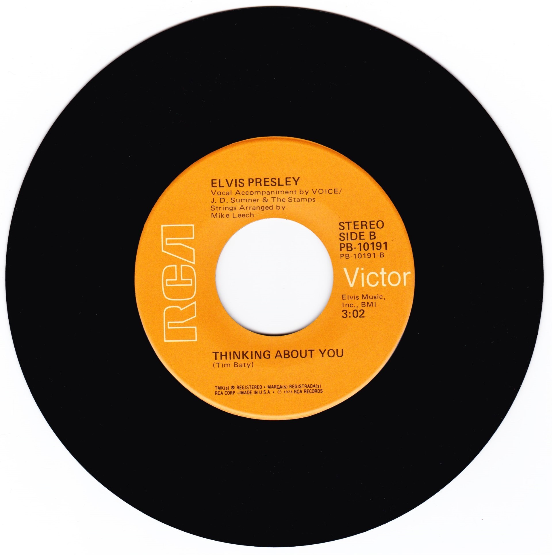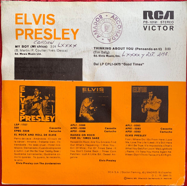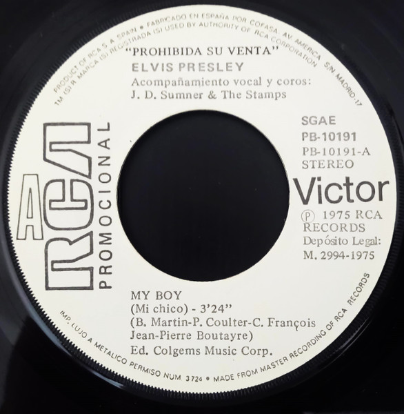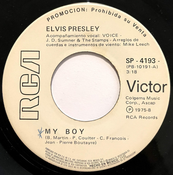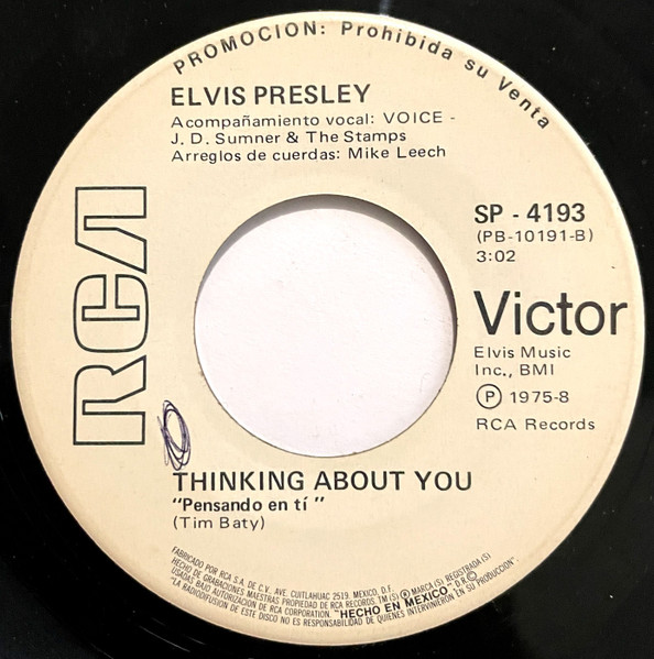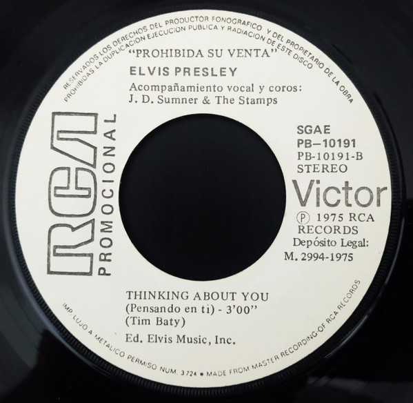 Elvis Presley Music, Inc. PROMOCION PROHIBIDA SU VENTA on white label Publishers ℗ 1975 - 8 RCA Records Matrix / Runout (Label side A): PB-10191-A |