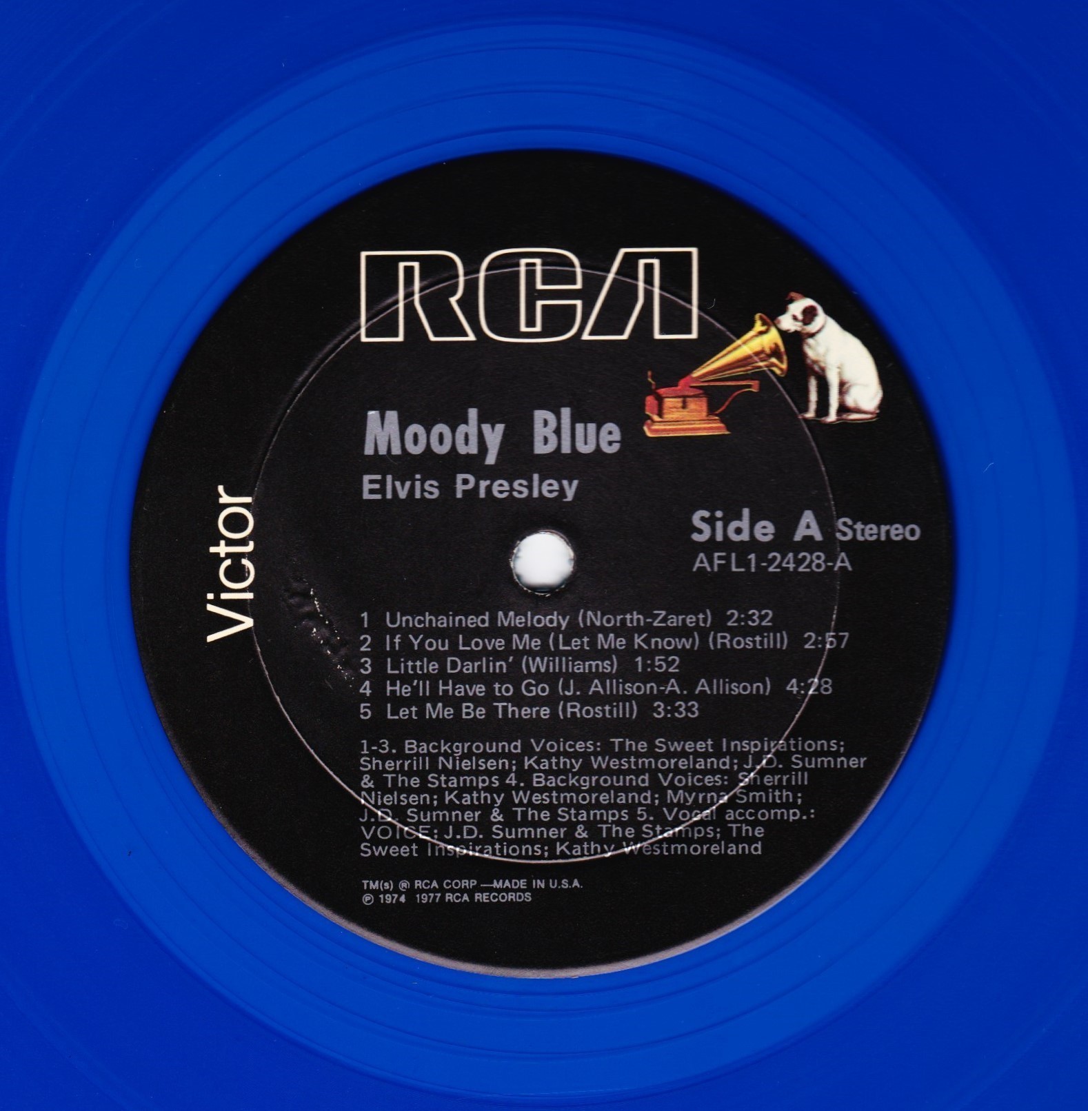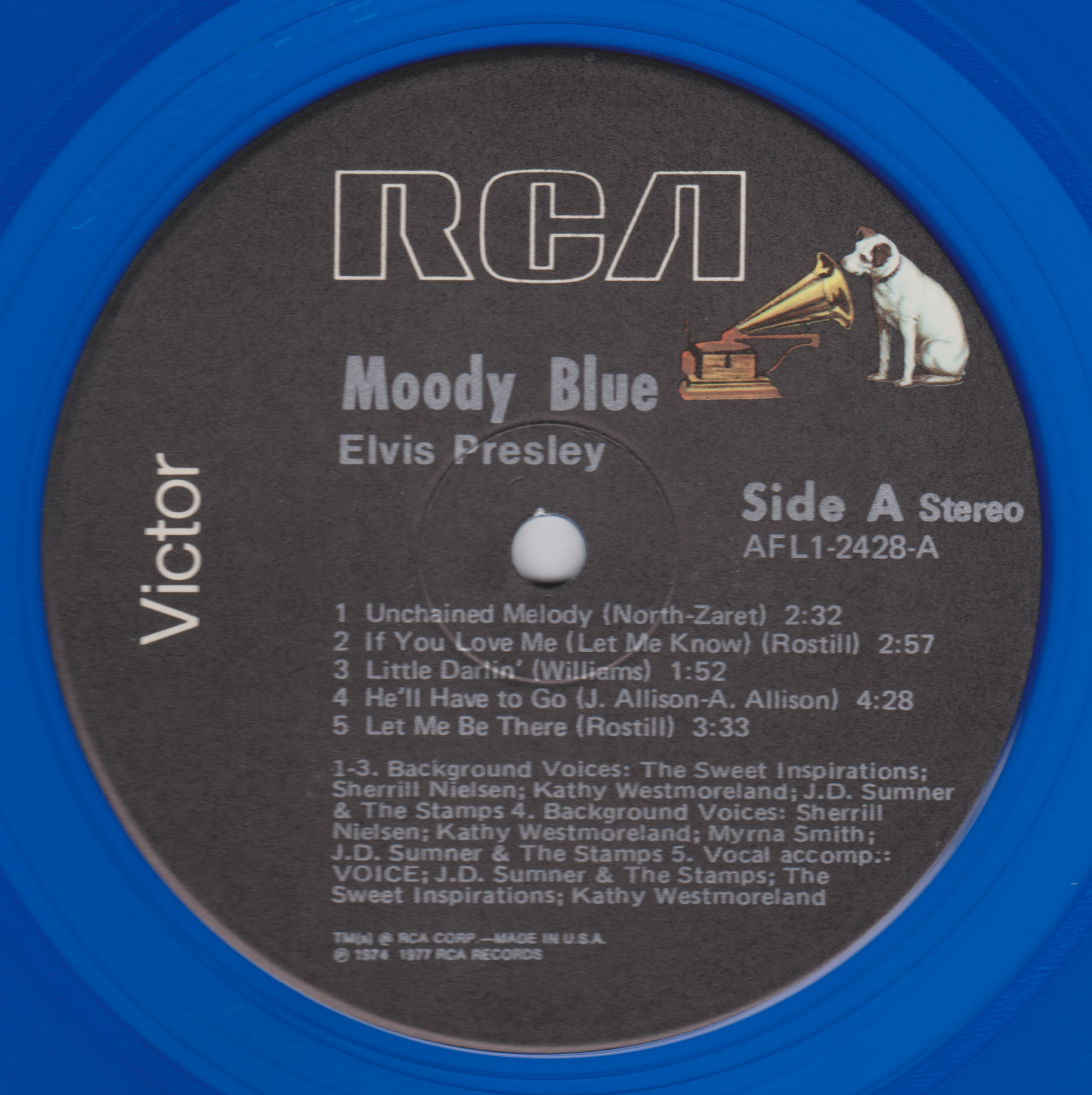 | Front Cover : Photo of Elvis. Title on top. Catalogue number top right. Rear Cover : Photo of Elvis. Catalogue number bottom right. Printed in U.S.A. bottom. Label : Black. Dog near top. Side A : RCA logo at top. Side B : RCA logo at top. Pressing Plant : Unknown Matrix Number Side 1 : AFL1 - 2428 - A 2S W JMKLES (Hand Etched) Matrix Number Side 2 : APL1 - 2428 - B 2S W JMKLES (Hand Etched) *NOTE* This issue released on blue vinyl. Rigid label but flexible vinyl. |