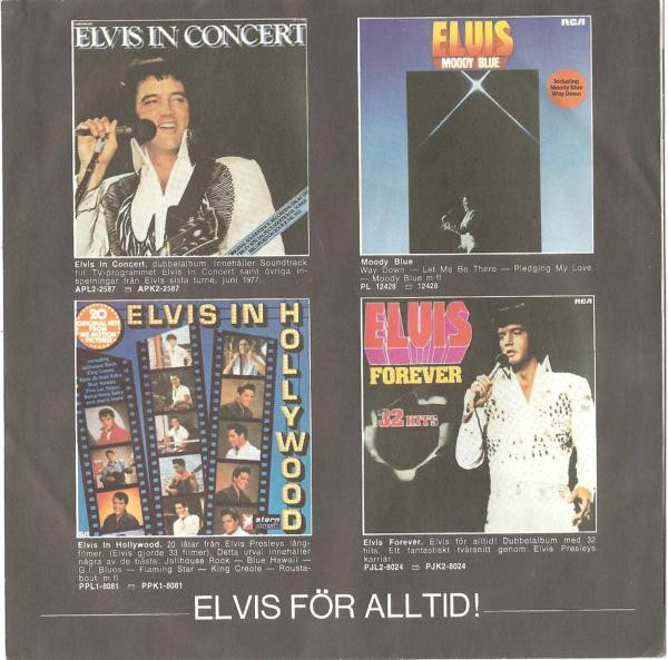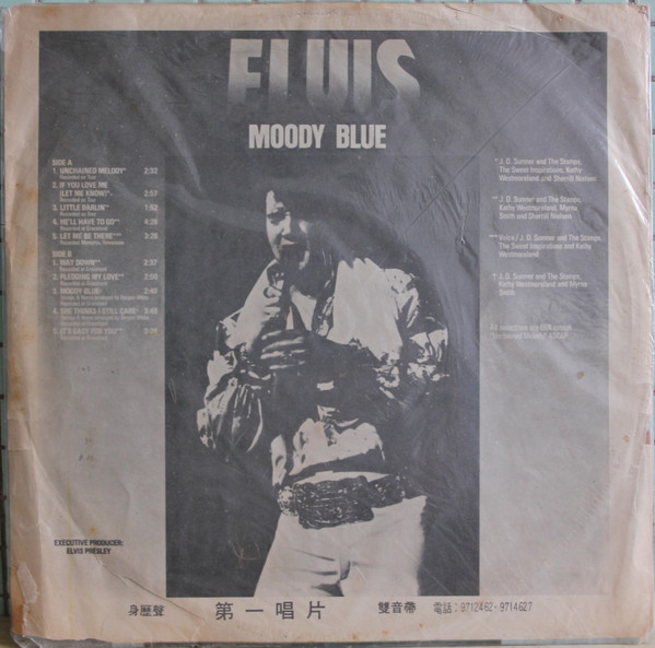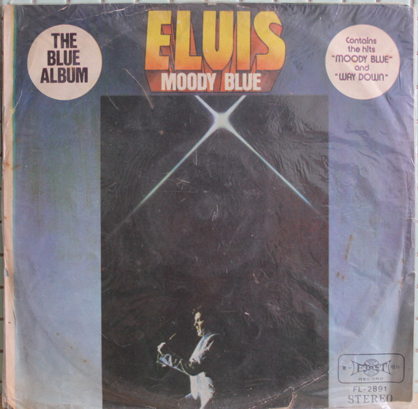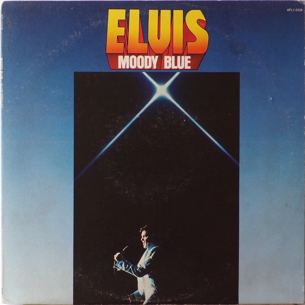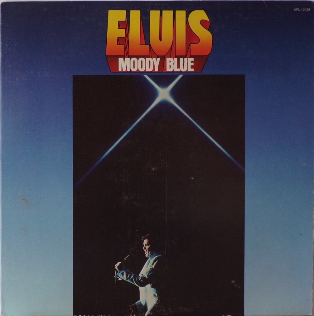 BLUE (LP) (US) RCA AFL1 2428 Released: July 1977 Side 1 Unchained Melody *** If You Love Me (Let Me Know) **** Little Darlin' *** He'll Have To Go ** Let Me Be There (From Live On Stage In Memphis 20/3/74) Side 2 Way Down Pledging My Love Moody Blue She Thinks I Still Care It's Easy For You * * Recorded: Graceland, Memphis, October 29, 1976 Brief History : As described in Elvis: The Illustrated Record, RCA was not able to obtain sufficient new studio material for a complete album, with all but six songs of Presley's studio recordings of 1976 having already been used in the previous album, From Elvis Presley Boulevard, Memphis, Tennessee. The company chose to augment the remaining available works with three live songs recorded in Ann Arbor, Michigan, on April 24 and 26, 1977, including his version of "Unchained Melody" which was the album's third single, released posthumously. RCA and the producer Felton Jarvis had booked a recording studio in Nashville, Tennessee, for January 1977, to record some new tracks for this album. Presley had chosen a few songs to record with the help of Jarvis, most of them were rather country and uptempo. Unfortunately, Presley never showed up at that session, claiming that he was sick and thus staying home (an excuse that Presley used rather frequently during the 1960s to avoid recording poor soundtracks for his motion pictures). Jarvis and RCA had nothing left to do but to fill the album with the live tracks mentioned above. Also included is a live performance of "Let Me Be There" which had already been released three years earlier on his album Elvis: As Recorded Live on Stage in Memphis. The song Moody Blue was released as a single in December 1976 and it reached number one on the Billboard Country Singles Chart, and #31 on the pop chart. "Way Down" was released as the album's next single during the early summer of 1977. It did not go very far up the chart, but it soared to #18 after Presley's death in August (jumping to number one in the U.K.) It was a bigger hit on the country charts, and it had risen to number one in the same week of the death of Presley. This album reached number three on the Billboard album charts after his death, although it had already entered the top 40 before he died. This was the last album by Presley to reach the TOP 40. Moody Blue was also a number one album on the Country Albums chart. Moody Blue was published on July 19, 1977, and it peaked on the album chart in August 1977. RCA pressed the album on blue vinyl, to match the title track. Since colored vinyl pressings were relatively rare, and they almost never occurred in a wide release, this has led to collectors mistakenly assuming that blue-vinyl albums of Moody Blue are collectors' items, when in fact the true collectables are pressings from immediately before Presley's death on standard black vinyl. (Immediately following his death, the production of Moody Blue was shifted back to blue vinyl. However, in some later years the album was produced using standard black vinyl). Following Presley's death, "Unchained Melody" was also released as a single, and it peaked at #6 on the country music charts. The original CD issue had the standard songs of the original. The CD reissue of the year 2000 revised the cover art including a different concert photo of Elvis, omitted the track "Let Me Be There", due to its presence on Elvis: As Recorded Live on Stage in Memphis, and it added the complete album From Elvis Presley Boulevard, Memphis, Tennessee as tracks 10-19 - in effect compiling the Graceland sessions rather than reissuing the album. It was certified Gold and Platinum on 9/12/1977 and 2x Platinum on 3/27/1992 by the RIAA. Front Cover : Photo of Elvis. Title on top. Catalogue number top