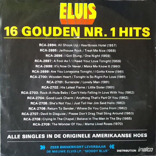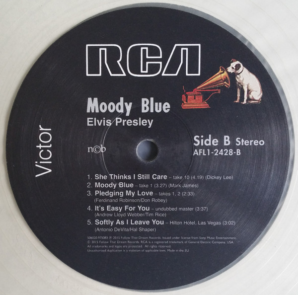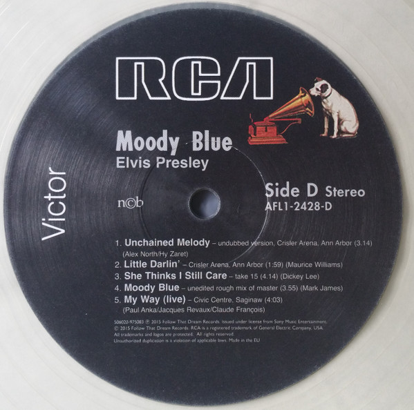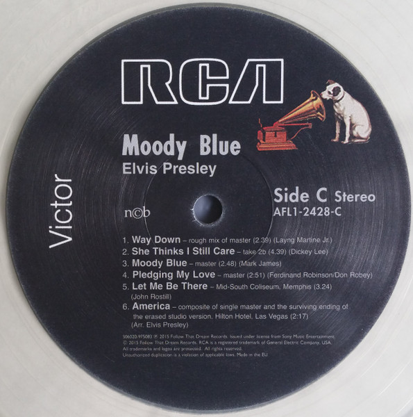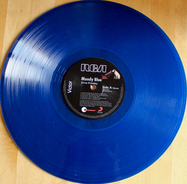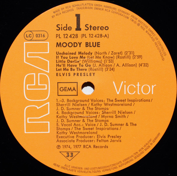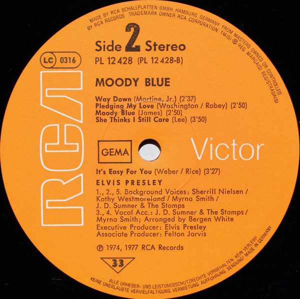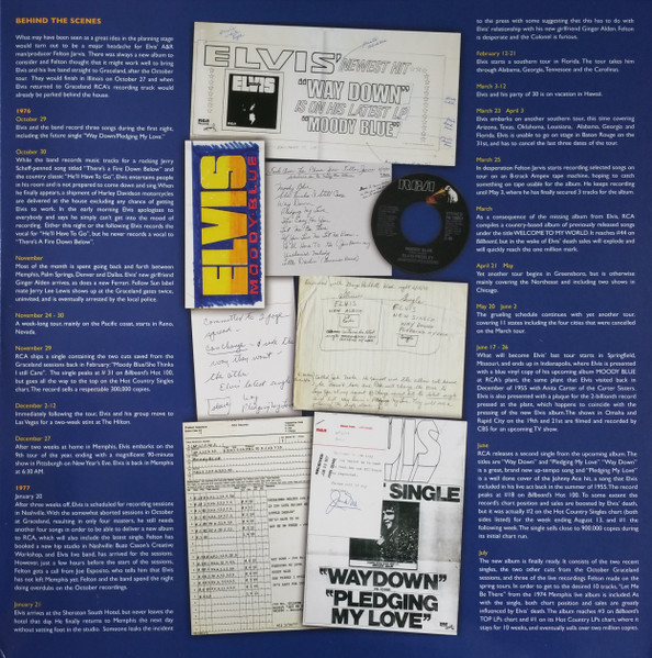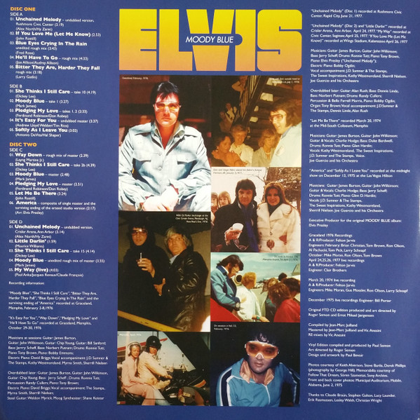 BLUE (LP) (US) RCA AFL1 2428 Released: July 1977 Side 1 Unchained Melody *** If You Love Me (Let Me Know) **** Little Darlin' *** He'll Have To Go ** Let Me Be There (From Live On Stage In Memphis 20/3/74) Side 2 Way Down Pledging My Love Moody Blue She Thinks I Still Care It's Easy For You * * Recorded: Graceland, Memphis, October 29, 1976 Brief History : As described in Elvis: The Illustrated Record, RCA was not able to obtain sufficient new studio material for a complete album, with all but six songs of Presley's studio recordings of 1976 having already been used in the previous album, From Elvis Presley Boulevard, Memphis, Tennessee. The company chose to augment the remaining available works with three live songs recorded in Ann Arbor, Michigan, on April 24 and 26, 1977, including his version of "Unchained Melody" which was the album's third single, released posthumously. RCA and the producer Felton Jarvis had booked a recording studio in Nashville, Tennessee, for January 1977, to record some new tracks for this album. Presley had chosen a few songs to record with the help of Jarvis, most of them were rather country and uptempo. Unfortunately, Presley never showed up at that session, claiming that he was sick and thus staying home (an excuse that Presley used rather frequently during the 1960s to avoid recording poor soundtracks for his motion pictures). Jarvis and RCA had nothing left to do but to fill the album with the live tracks mentioned above. Also included is a live performance of "Let Me Be There" which had already been released three years earlier on his album Elvis: As Recorded Live on Stage in Memphis. The song Moody Blue was released as a single in December 1976 and it reached number one on the Billboard Country Singles Chart, and #31 on the pop chart. "Way Down" was released as the album's next single during the early summer of 1977. It did not go very far up the chart, but it soared to #18 after Presley's death in August (jumping to number one in the U.K.) It was a bigger hit on the country charts, and it had risen to number one in the same week of the death of Presley. This album reached number three on the Billboard album charts after his death, although it had already entered the top 40 before he died. This was the last album by Presley to reach the TOP 40. Moody Blue was also a number one album on the Country Albums chart. Moody Blue was published on July 19, 1977, and it peaked on the album chart in August 1977. RCA pressed the album on blue vinyl, to match the title track. Since colored vinyl pressings were relatively rare, and they almost never occurred in a wide release, this has led to collectors mistakenly assuming that blue-vinyl albums of Moody Blue are collectors' items, when in fact the true collectables are pressings from immediately before Presley's death on standard black vinyl. (Immediately following his death, the production of Moody Blue was shifted back to blue vinyl. However, in some later years the album was produced using standard black vinyl). Following Presley's death, "Unchained Melody" was also released as a single, and it peaked at #6 on the country music charts. The original CD issue had the standard songs of the original. The CD reissue of the year 2000 revised the cover art including a different concert photo of Elvis, omitted the track "Let Me Be There", due to its presence on Elvis: As Recorded Live on Stage in Memphis, and it added the complete album From Elvis Presley Boulevard, Memphis, Tennessee as tracks 10-19 - in effect compiling the Graceland sessions rather than reissuing the album. It was certified Gold and Platinum on 9/12/1977 and 2x Platinum on 3/27/1992 by the RIAA. Front Cover : Photo of Elvis. Title on top. Catalogue number top