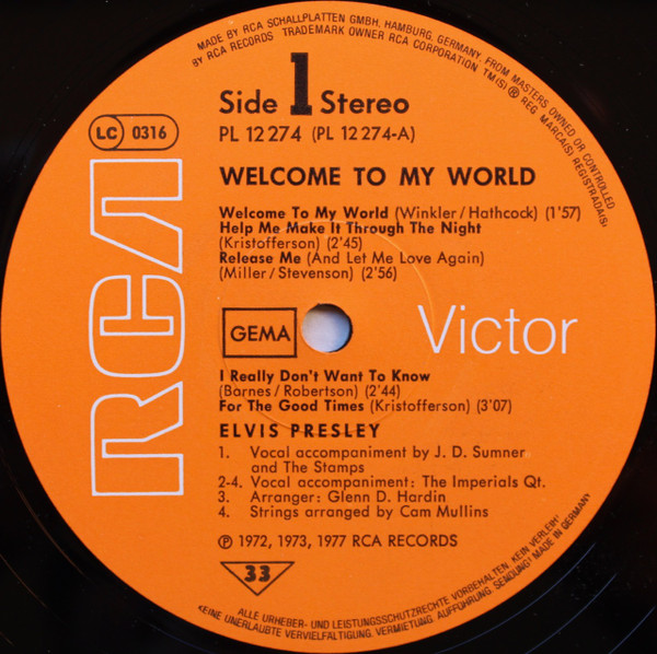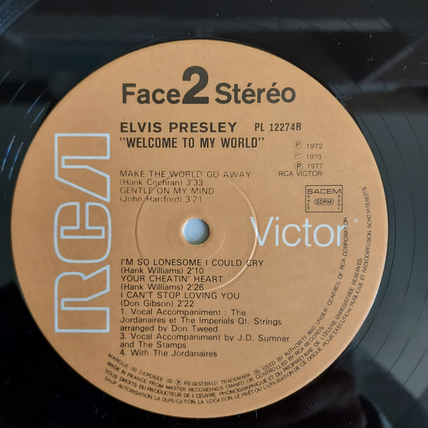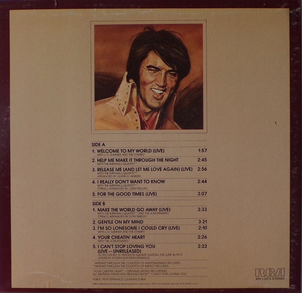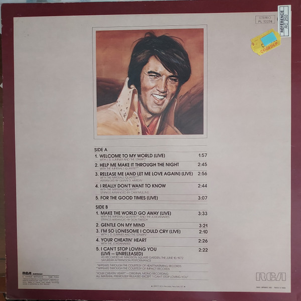 TO MY WORLD (LP) Brief History : Welcome to My World was the title of a compilation album by Elvis Presley that was released by RCA Records in early 1977, just months before his death. According to Elvis: The Illustrated Record by Roy Carr and Mick Farren, all but one track on this album had been previously released (one track, "Your Cheatin' Heart", dated back 20 years). The only previously unissued recording is "I Can't Stop Loving You" which was taken from a 1972 performance in New York City that as of 1977 had not yet been released. (It later appeared on CD as An Afternoon in the Garden.) It was certified gold on September 30, 1977 and platinum on January 14, 1983 by the RIAA. Front Cover : Photo of Elvis. Title on top. Catalogue number top