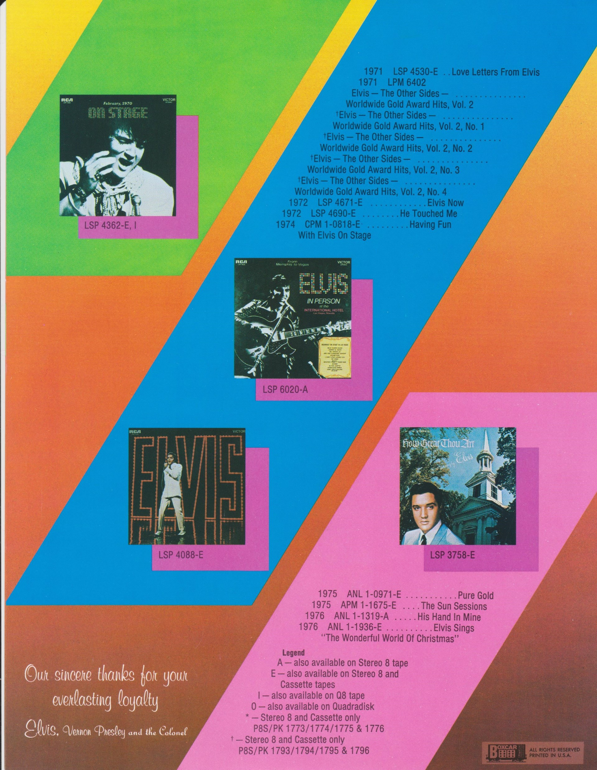 Civic Auditorium Arena, Omaha, Nebraska, June 19, 1977 Brief History : Elvis in Concert is the title of the soundtrack album released in conjunction with the television special of the same name which featured some of the final performances of Elvis Presley. Videotaped and recorded in June 1977, both the special and album were broadcast and released on October 3, 1977, (the single "My Way"/"America the Beautiful" was also released that day too) two months after Presley's death. The album peaked to #5 on the Billboard chart in the fall of 1977. It was certified Gold and Platinum on 10/14/1977 and 3x Platinum on 8/1/2002 by the RIAA. The show was recorded over two days at concerts in Omaha on June 19 and Rapid City, South Dakota on the 21st. Longtime RCA/Elvis producer Felton Jarvis produced the recordings, which were done to 4-track multitrack. According to Elvis: The Illustrated Record by Roy Carr and Mick Farren, the shows were taped with the intent of producing a television special, but Presley's deteriorating physical condition put the project on hold. After his death, they write, it was decided to go ahead with the special as a tribute. Although both the June 19th and 21st concerts are the last official live professional one's ever recorded of Presley alive, Vernon Presley, Elvis' father, recorded a message that was broadcast at the end of the special and included on the soundtrack album, in which he erroneously states that the performance featured was his son's last appearance; in fact Elvis made five more concert appearances after the filming of the special. Elvis' last concert was in fact on Sunday, June 26, 1977 at the Market Square Arena in Indianapolis, Indiana. No professional recording of this last performance has ever been issued, but bootlegs of amateur recordings have. During the special, Presley performs a selection of his hits, along with songs not normally associated with him. Although it was a regular part of his repertoire for years, Presley requires a lyric sheet when he performs Paul Anka's "My Way" (noted for its opening lyric, "And now the end is near/And so I face the final curtain"). He also loses his train of thought during "Are You Lonesome Tonight?", although Darrin Memmer's book "Elvis Presley - The 1977 CBS Television Special," published in 2001 by Morris Publishing, makes a strong case that Elvis regularly played around with the words during the spoken portion of the song when performing it on stage, rather than it being a case of poor memory. Indeed a concert recording of Presley similarly joking around during the monologue section of "Are You Lonesome Tonight?" dating from 1969 has been issued by RCA on numerous occasions (dubbed the "Laughing Version", it even made the UK charts after Presley's death), and he also poked fun at the song during his 1968 Comeback Special. The soundtrack album was issued as a 2-LP package, including a second disc of performances that were not included in the TV special. It was also released on 8-track. On May 22, 1992, the special saw its first release on a single-disc CD. Unfortunately the CD barely improved on the somewhat muffled sound quality of the original album. Front Cover : Photo of Elvis Title top. Catalogue number top right. *NOTE* 4 Page Boxcar insert advertising the LP catalogue of Elvis Presley. This was inside this sealed copy. |