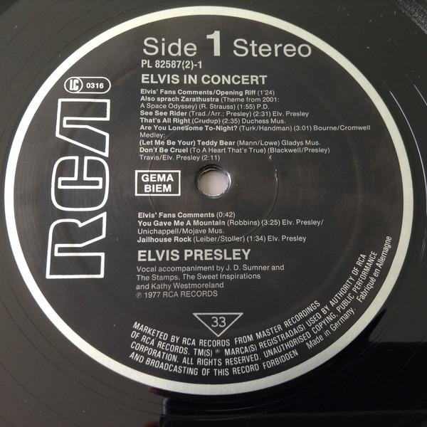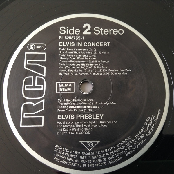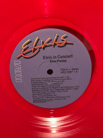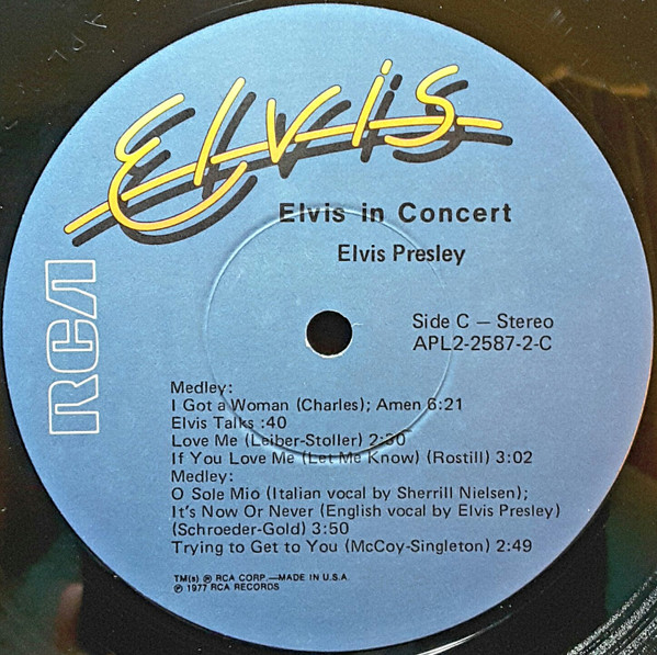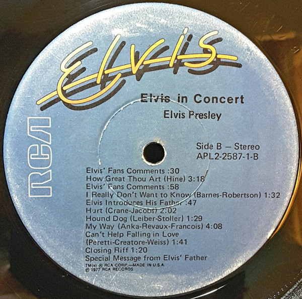 IN CONCERT (LP) (US) RCA APL2 2587 Released: October 3, 1977 Side 1 Elvis Fans Comments / Opening Riff / Also Sprach Zarathustra ** See See Rider ** That's All Right ** Are You Lonesome Tonight ** Teddy Bear / Don't Be Cruel * Elvis Fans Comments You Gave Me A Mountain ** Jailhouse Rock ** Side 2 Elvis Fans Comments How Great Thou Art * Elvis Fans Comments I Really Don't Want To Know ** Elvis Introduces His Father ** Hurt ** Hound Dog ** My Way ** Can't Help Falling In Love * Closing Riff * Special Message From Elvis' Father Side 3 I Got A Woman / Amen ** Elvis Talks ** Love Me ** If You Love Me (Let Me Know) ** It's Now Or Never ** Trying To Get To You ** Side 4 Hawaiian Wedding Song ** Fairytale * Little Sister * Early Mornin' Rain ** What'd I Say ** Johnny B Goode ** And I Love You So * * Recorded: