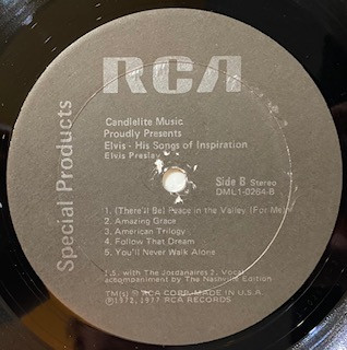 Label: Candlelite Music – 726771XS Tracks: Manufactured By – Eva-Tone Soundsheets. One-sided demonstration flexi-disc promoting "The Elvis Story" album. Matrix / Runout: EV-726771XST1 Black label. Flexible plastic. This is a one sided record. No text on the back side. 6″ in size. The label reads Candlelite Music presents … “The Elvis Presley Story” Sampler. Demonstration Record 33-1/3 RPM Stereo. featuring excerpts from: Don’t’ Be Cruel, One Night, Jailhouse Rock, All Shook up, It’s Now or Never, Are You Lonesome Tonight, Suspicious Minds, In the Ghetto, Burning Love, Don’t Cry Daddy, The Wonder of You. 39 hits from the 40’s, 60’s & 70’s. To order: Return the enclosed postpaid order from today. 726771XS. Product of Eva-Tone Corp., Deerfield, Ill. Made in U.S.A. |