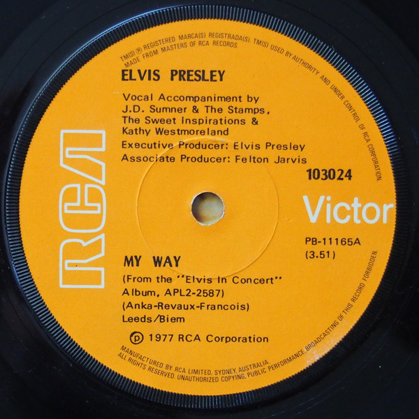 | Label: RCA Victor – 103024 Format: Vinyl, 7", 45 RPM, Single Country: Australia Released: 1977 Published By – Leeds Side A : From the "Elvis In Concert" Album APL2-2587 Publishers: Rights Society: BIEM |