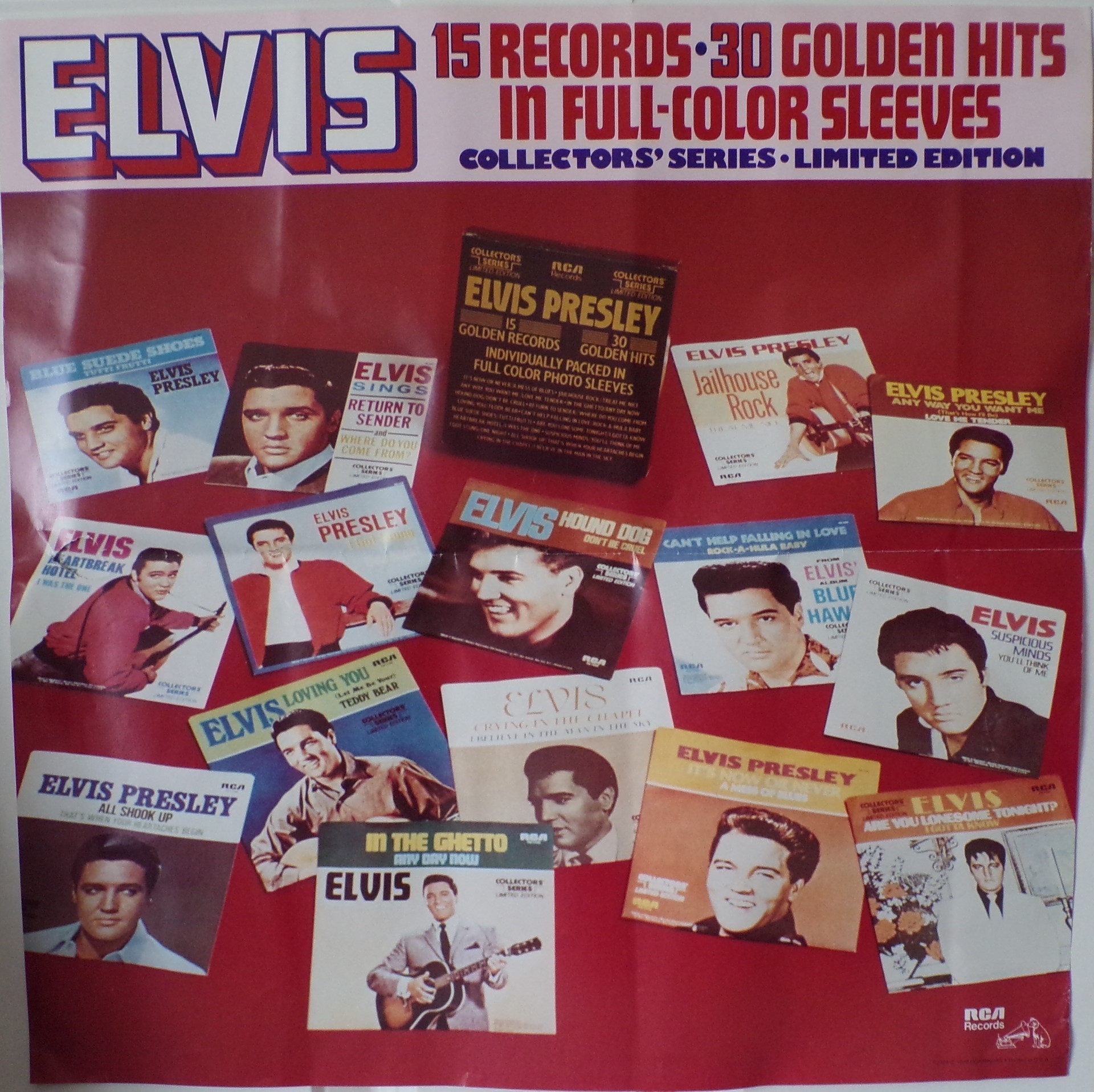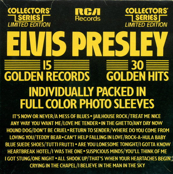 15 Golden Records - 30 Golden Hits Label: RCA – PP-11301 Collectors' Series Limited Edition Box Set Box: Black box, yellowish golden letters. The dimensions is a square 7 1/4" and 1 3/8" wide. Each side features a list of the contents contained inside the box. On the top and bottom flap is PP-11301. Inside each flap is 21-107-15 PT1. A sealed example exists that contains a PROMO-COPY NOT FOR SALE sticker affixed to the box. Box contains 15 individually packaged records each in a full color picture sleeve. Brief History : This was a 15 x 45 set of singles released in a box set. It is a "Collectors' Series" Limited Edition. They were all released with picture sleeves. Each record was pressed on black vinyl with the dog near the top. They were all released previous on the "Gold Standard Series". Of the 15 records in this set, 10 of them were also issued in a 10 record set called RCA PP-11340 20 Golden Hits in Full Color Sleeves. All records in this COLLECTORS’ SERIES LIMITED EDITION are issued in the GOLD STANDARD SERIES. Corresponding reference numbers for each title are listed above. These titles are listed individually as some may have access to only one title of this set. RCA PB-11099 released on Gold Standard label as RCA 447-0608) |