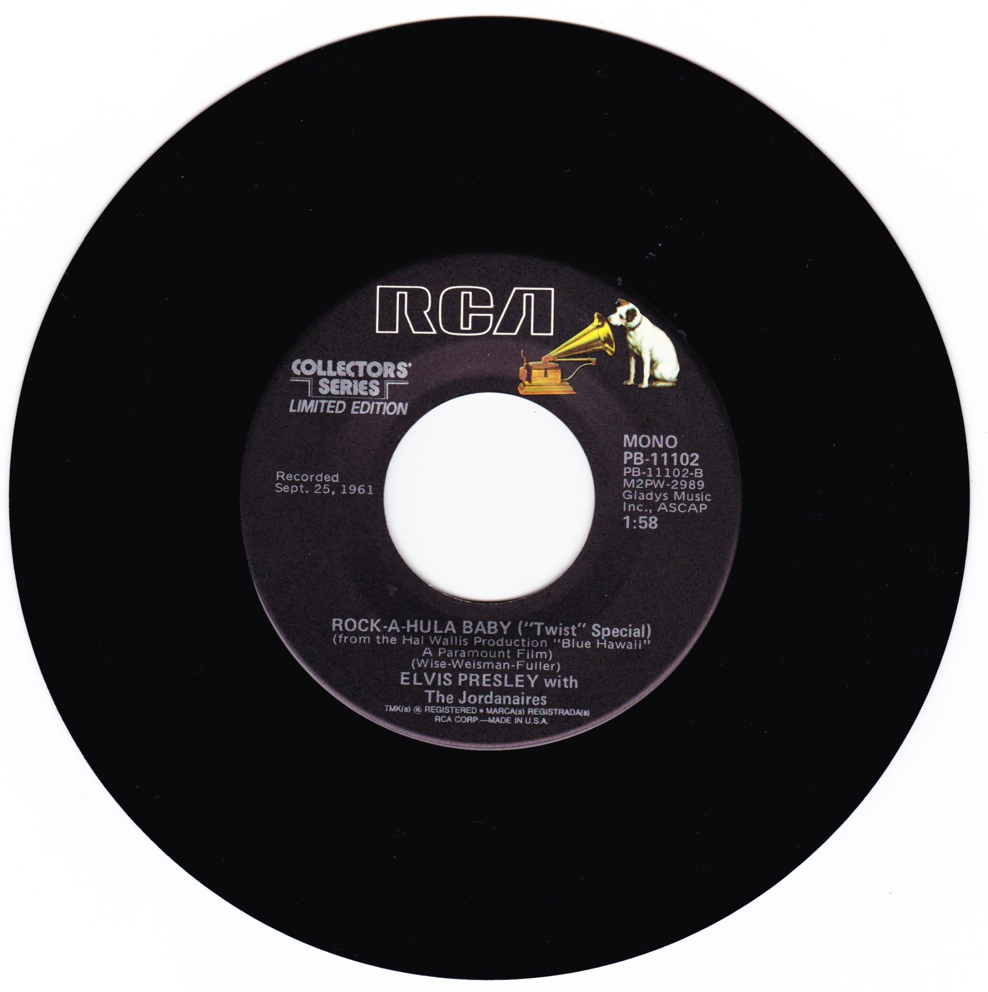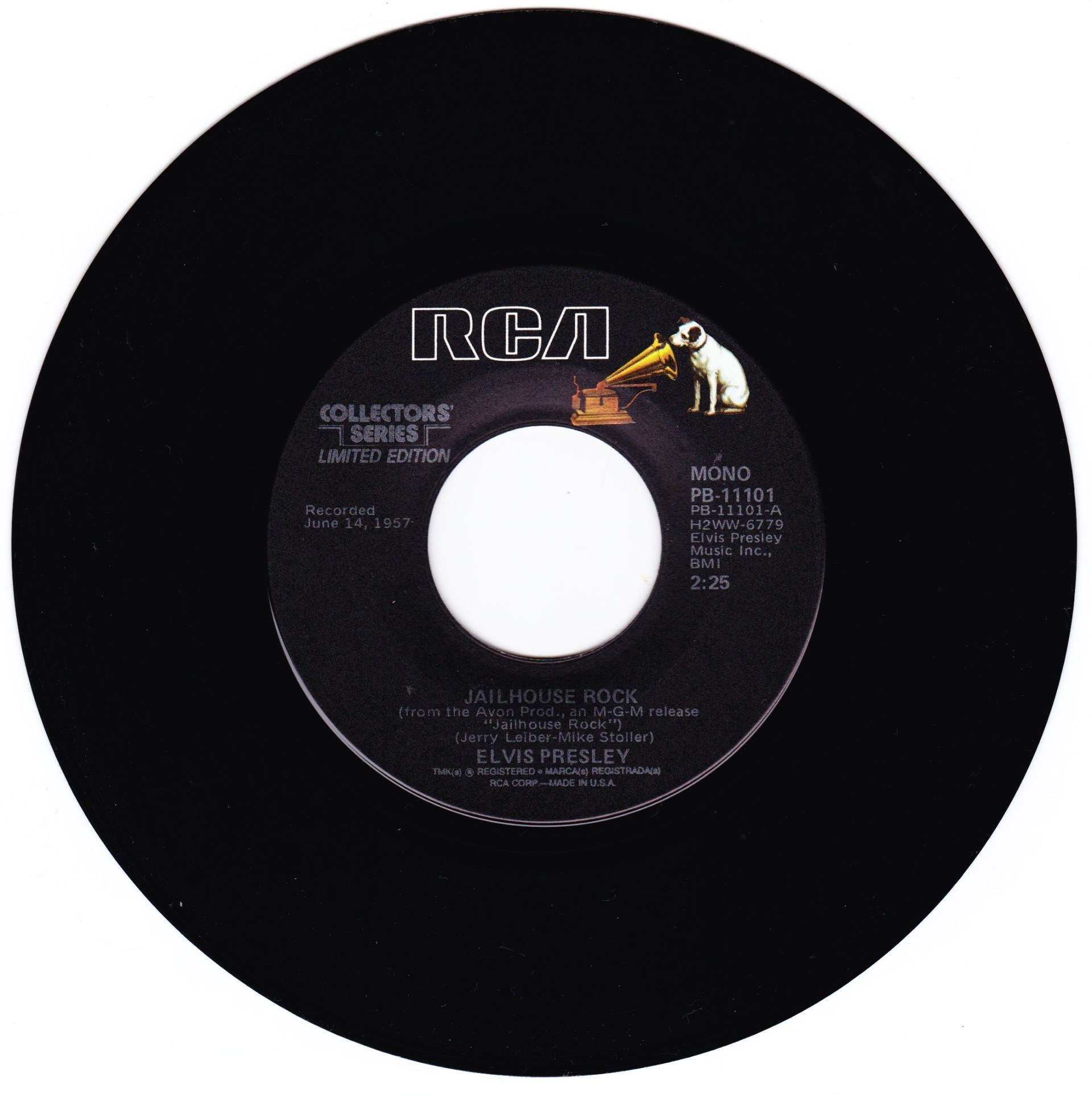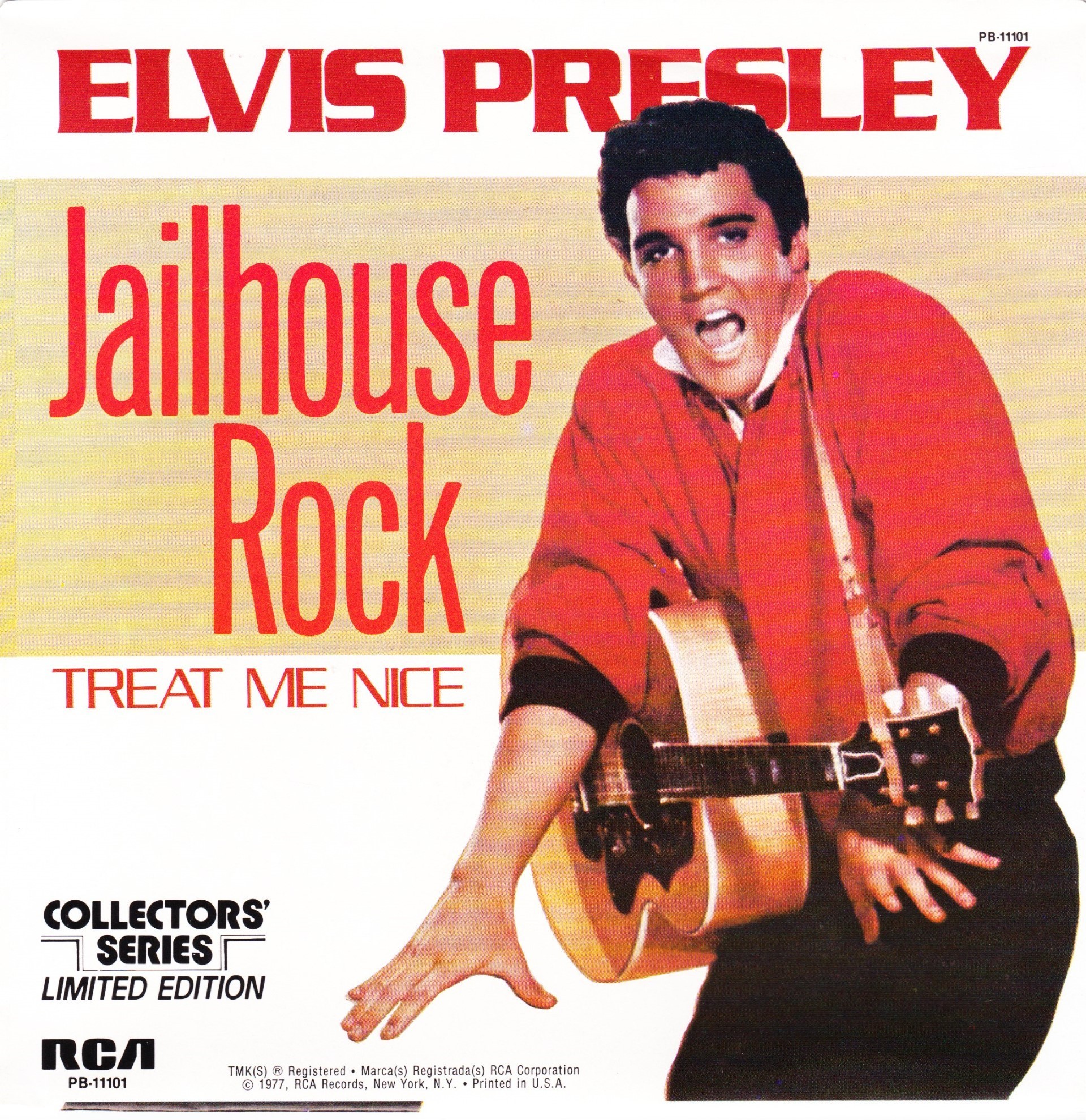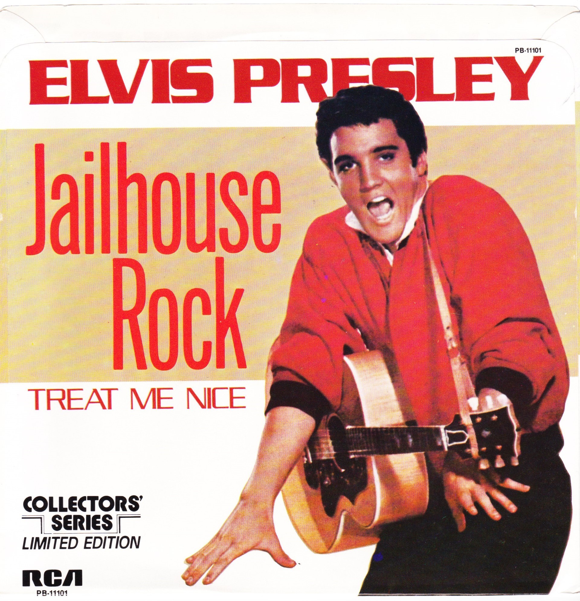 | Details : Reissue with new catalogue number Side A : Jailhouse Rock Side B : Treat Me Nice Front Cover : Picture Sleeve Rear Cover : Picture Sleeve Label : Black Pressing Plant : Indianapolis Matrix Number Side 1 : H2 - WW 6779 - 19S (Machine Stamped) A14 PB - 11101 - A (Hand Etched) Matrix Number Side 2 : H2 - WW 6778 - 18S A3 PB - 11101 - B 1D (Machine Stamped) *NOTE* PB - 11101 |