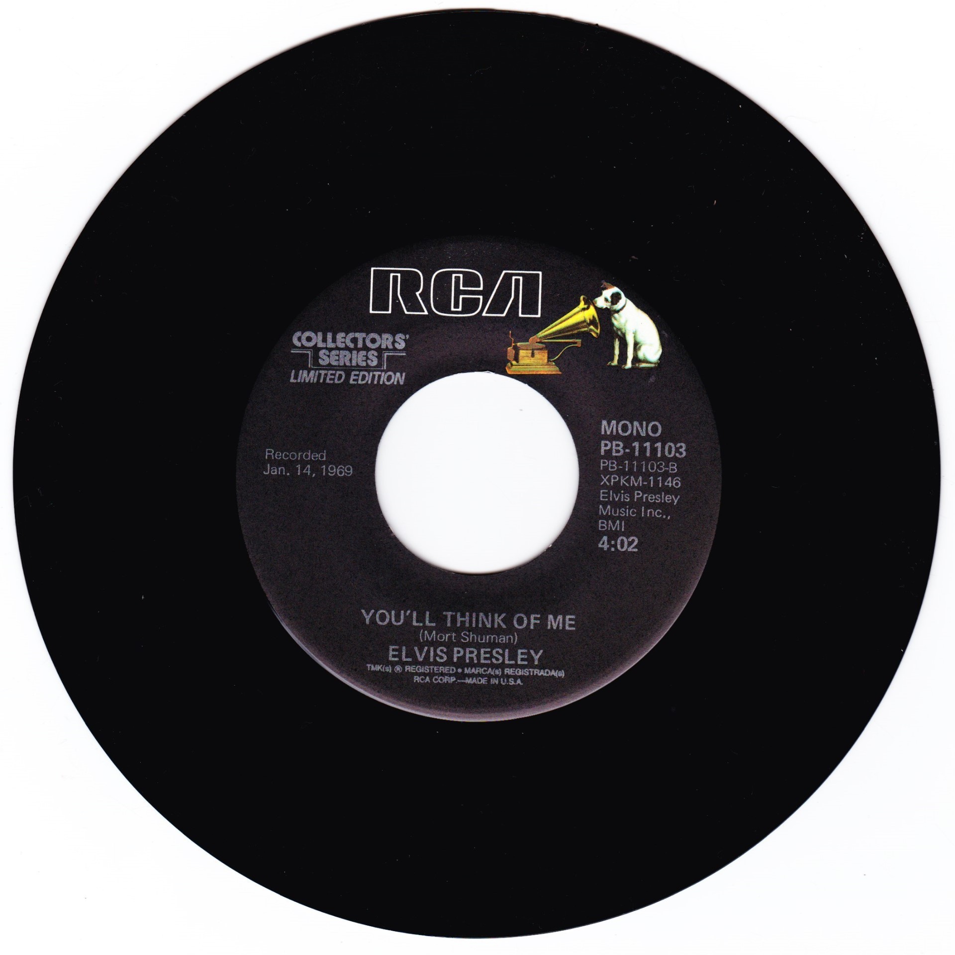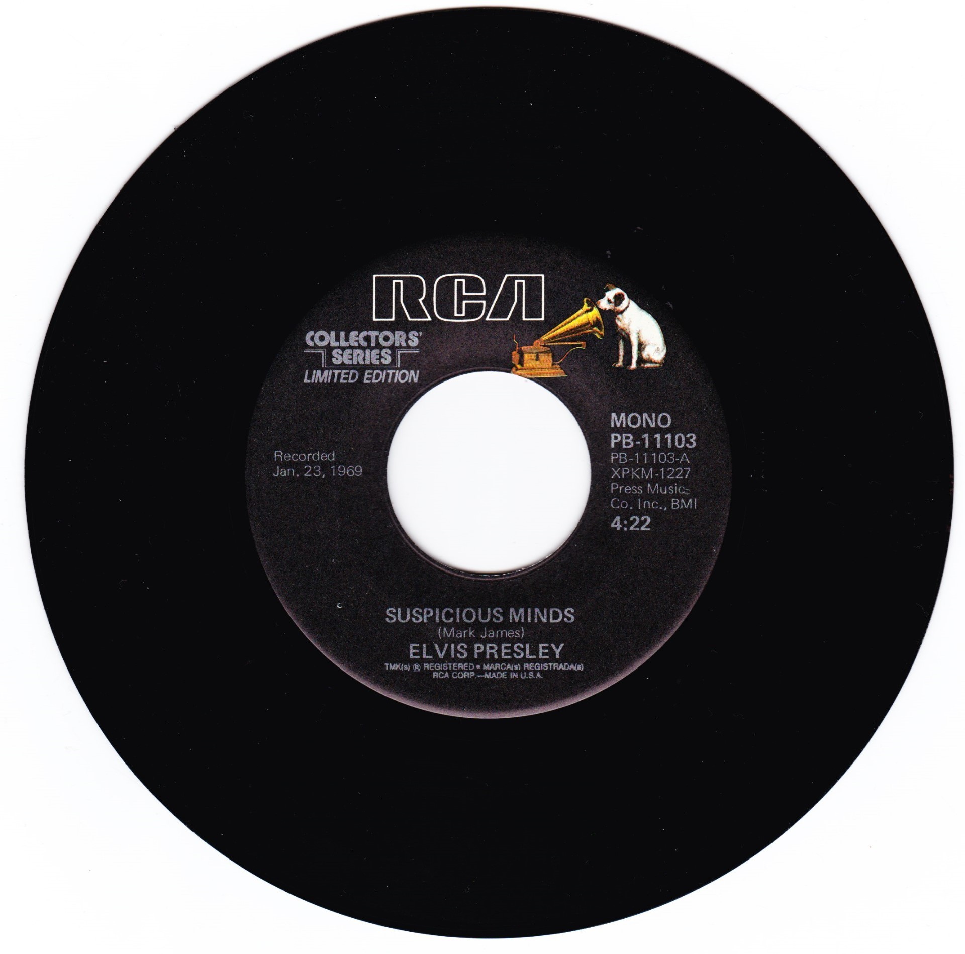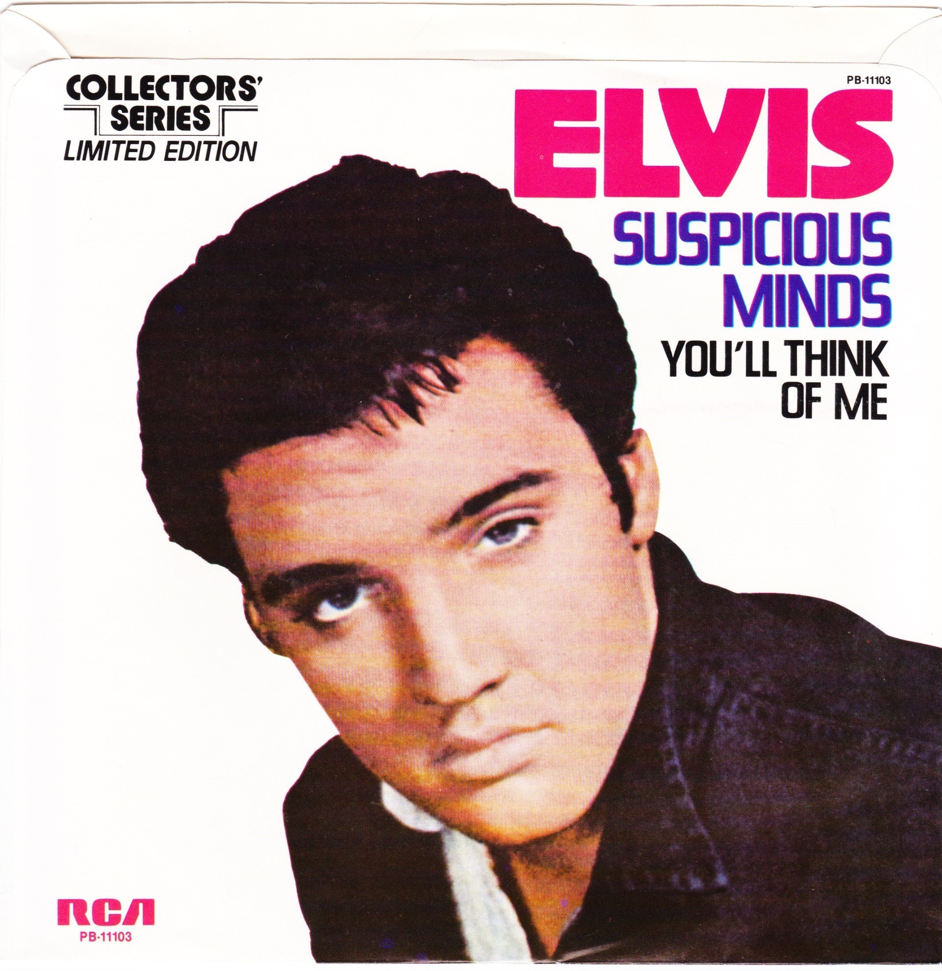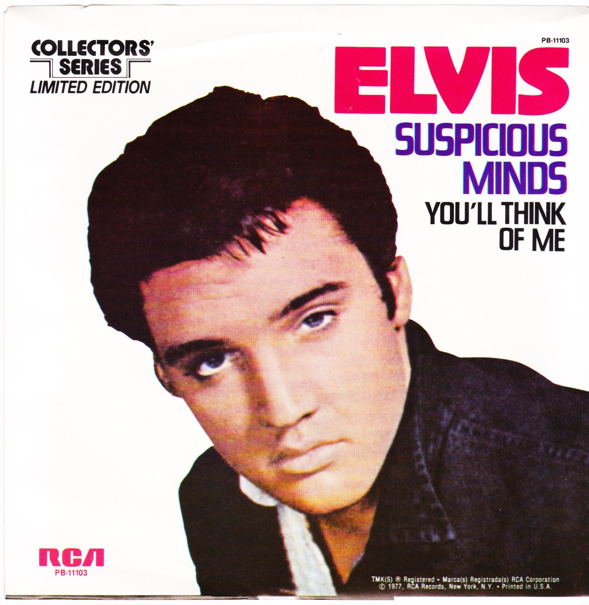 | Details : Reissue with new catalogue number Side A : Suspicious Minds Side B : You'll Think Of Me Front Cover : Picture Sleeve Rear Cover : Picture Sleeve Label : Black Pressing Plant : Indianapolis Matrix Number Side 1 : XP - KM 1227 - 31S A7 PB - 11103 - A (Machine Stamped) Matrix Number Side 2 : XP - KM 1146 - 32 A4 PB - 11103 - B (Machine Stamped) *NOTE* PB - 11103 |