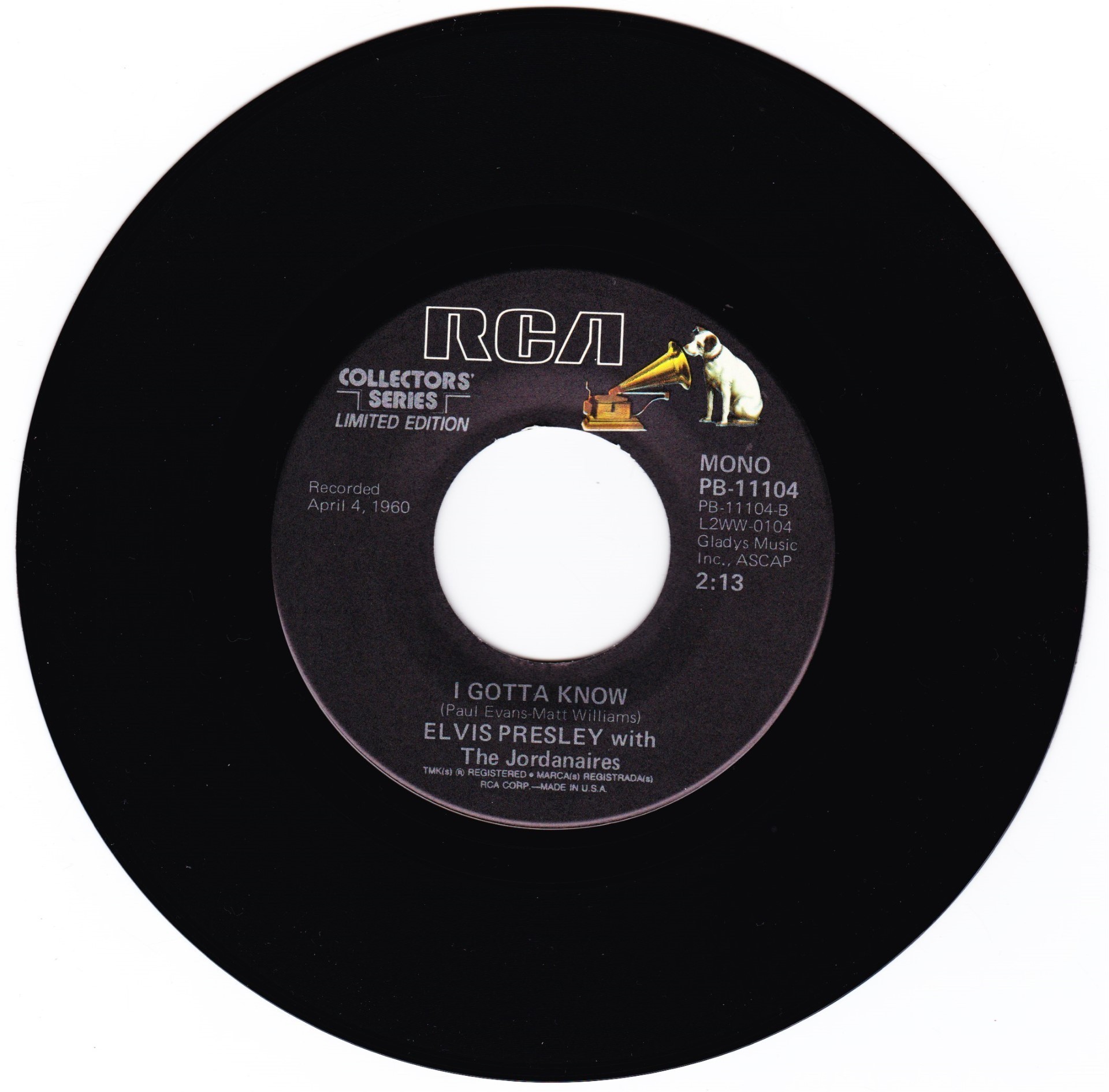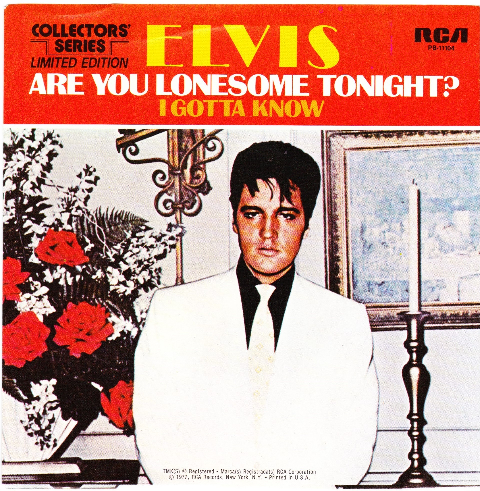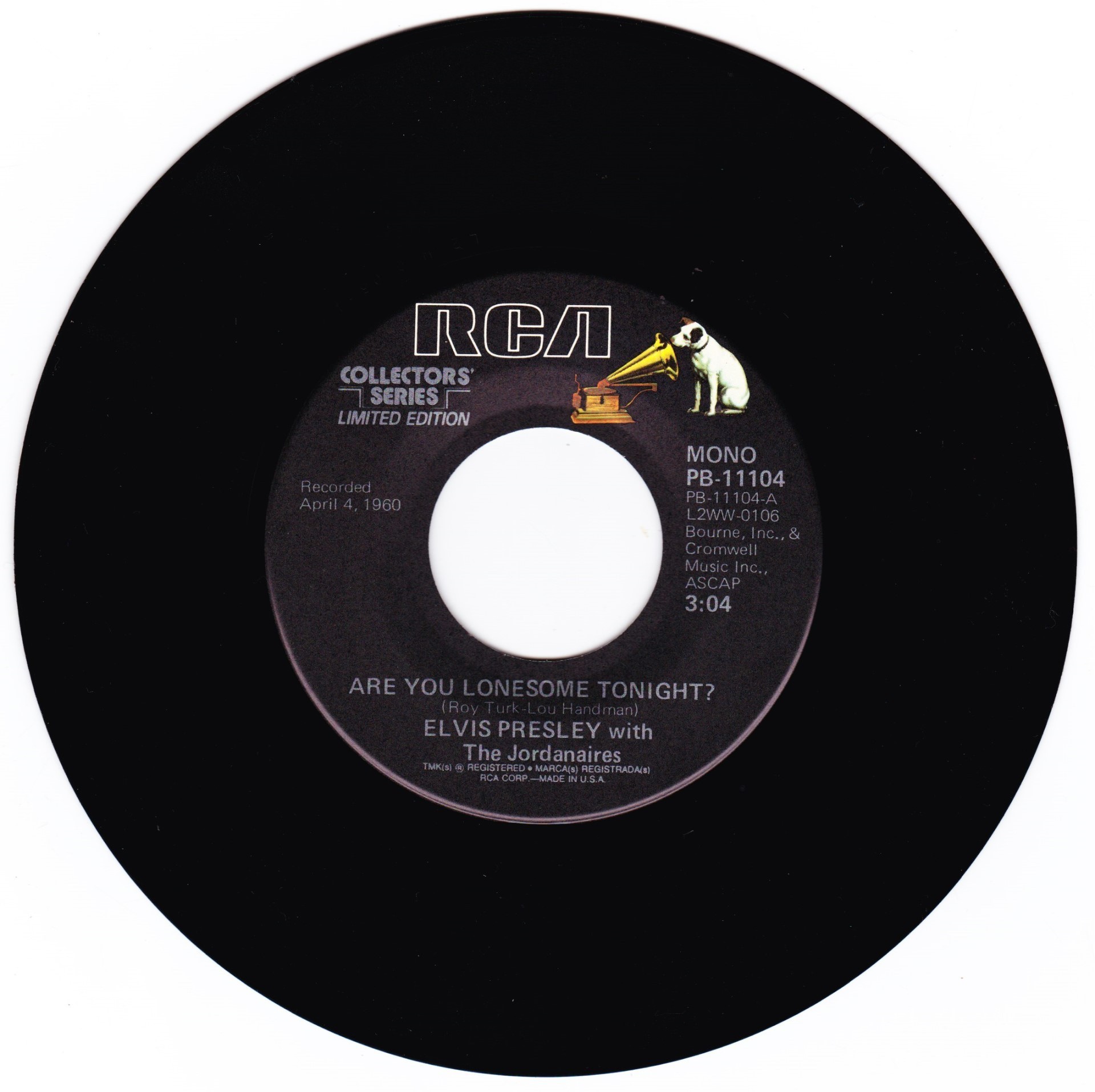 | Details : Reissue with new catalogue number Side A : Are You Lonesome Tonight Side B : I Gotta Know Front Cover : Picture Sleeve Rear Cover : Picture Sleeve Label : Black Pressing Plant : Indianapolis Matrix Number Side 1 : L2 - WW 0106 - 14 A4 PB - 11104 - A (Machine Stamped) Matrix Number Side 2 : L2 - WW 0104 - 10S A4 PB - 11104 - B (Machine Stamped) *NOTE* PB - 11104 |
