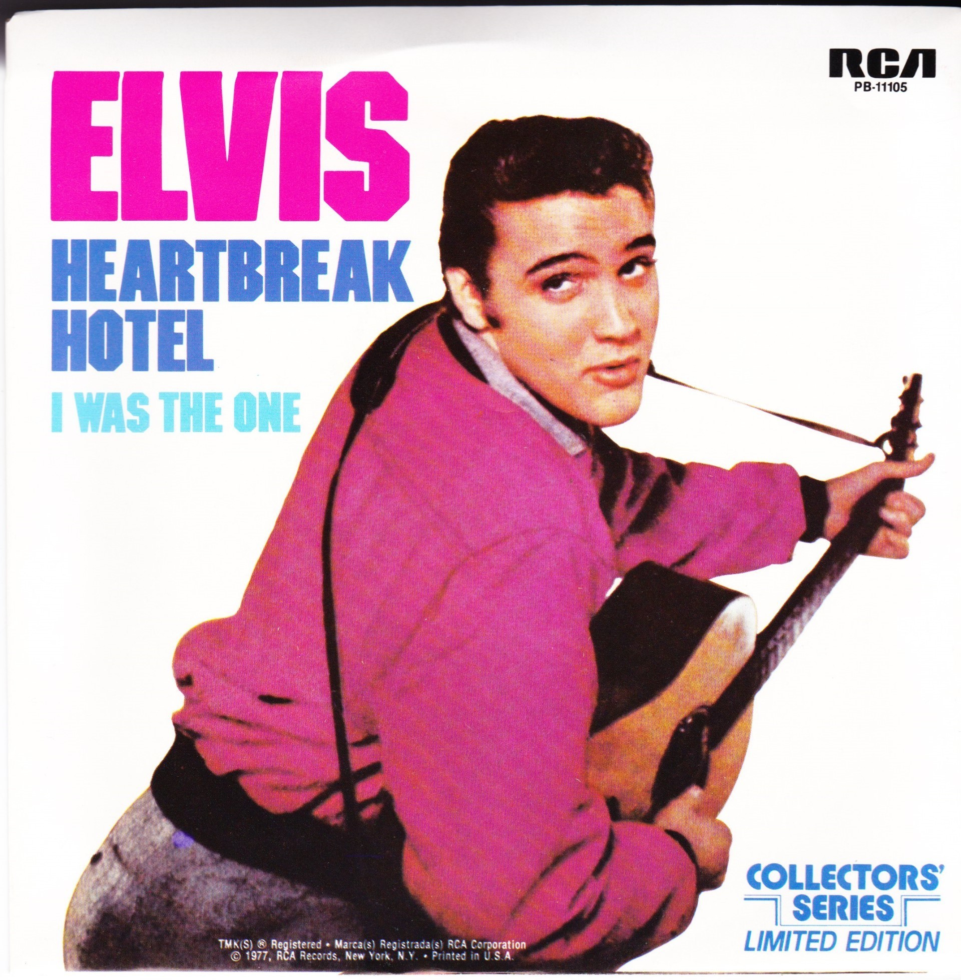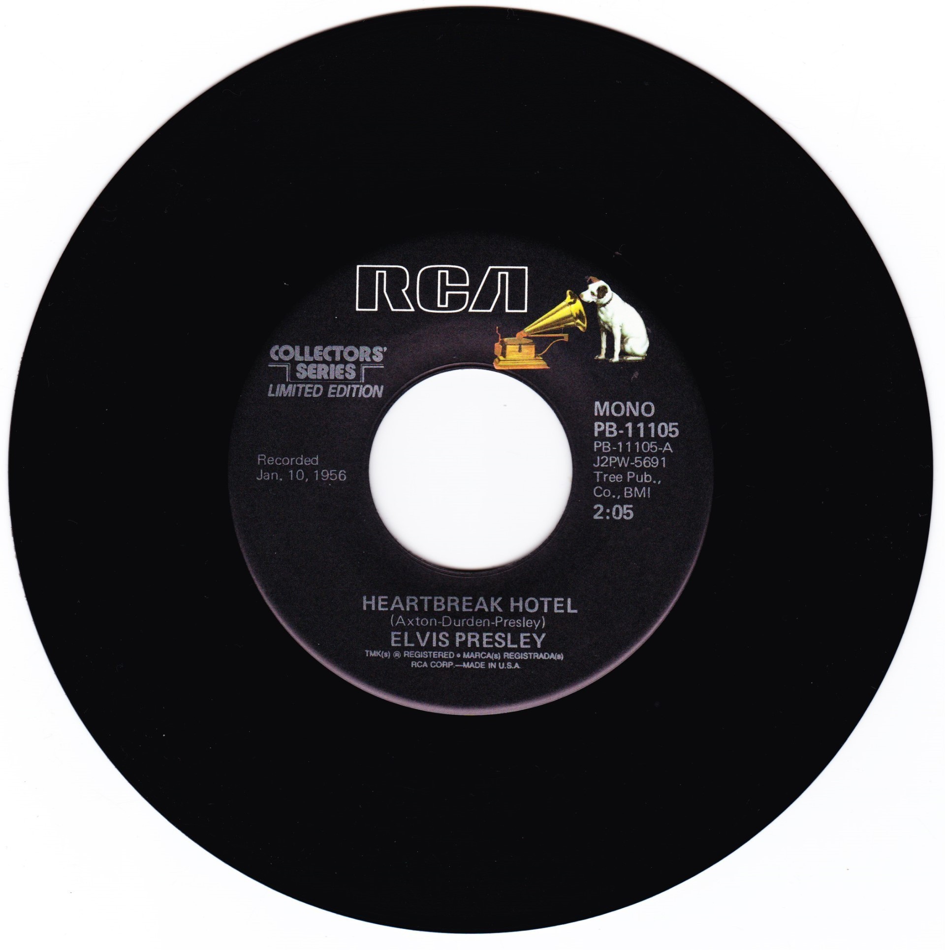 | Details : Reissue with new catalogue number Side A : Heartbreak Hotel Side B : I Was The One Front Cover : Picture Sleeve Rear Cover : Picture Sleeve Label : Black Pressing Plant : Indianapolis Matrix Number Side 1 : J2 - PW 5691 - 9S A2 PB - 11105 - A (Machine Stamped) Matrix Number Side 2 : J2 - PW 5692 - 5S B1 PB - 11105 - B (Machine Stamped) *NOTE* PB - 11105 |