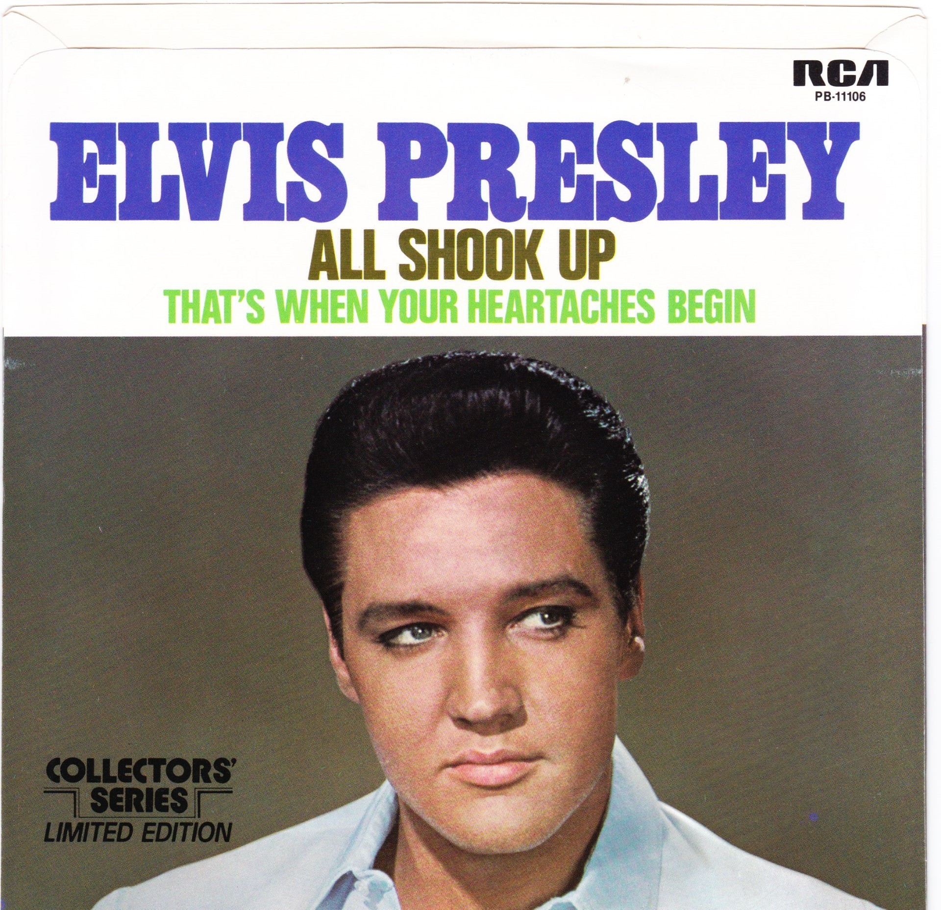 | Details : Reissue with new catalogue number Side A : All Shook Up Side B : That's When Your Heartaches Begin Front Cover : Picture Sleeve Rear Cover : Picture Sleeve Label : Black Pressing Plant : Indianapolis Matrix Number Side 1 : J2 - PW 6015 - 6S A1 PB - 11106 - A (Machine Stamped) Matrix Number Side 2 : J2 - PW 6016 - 7S A3 PB - 11106 - B (Machine Stamped) *NOTE* PB - 11106 |