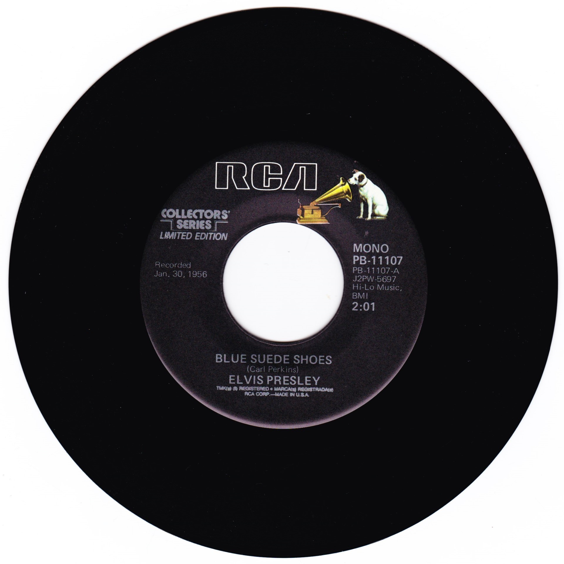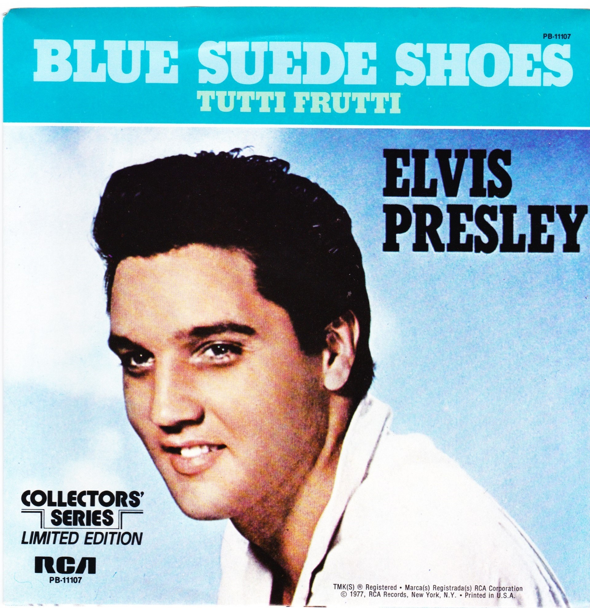 | Details : Reissue with new catalogue number Side A : Blue Suede Shoes Side B : Tutti Frutti Front Cover : Picture Sleeve Rear Cover : Picture Sleeve Label : Black Pressing Plant : Indianapolis Matrix Number Side 1 : J2 - PW 5697 - 5S AC (Machine Stamped) PB - 11107 - A (Hand Etched) Matrix Number Side 2 : J2 - PW 5698 - 6S A1 PB - 11107 - B (Machine Stamped) *NOTE* PB - 11107 |