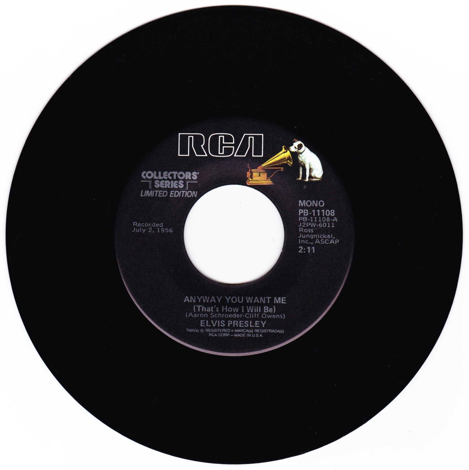 | Details : Reissue with new catalogue number Side A : Any Way You Want Me (That's How I'll Be) Side B : Love Me Tender Front Cover : Picture Sleeve Rear Cover : Picture Sleeve Label : Black Pressing Plant : Indianapolis Matrix Number Side 1 : J2 - PW 6011 - 7S B2 PB - 11108 - A (Machine Stamped) Matrix Number Side 2 : J2 - PW 6012 - 7 A5 PB - 11108 - B (Machine Stamped) *NOTE* PB - 11108 |