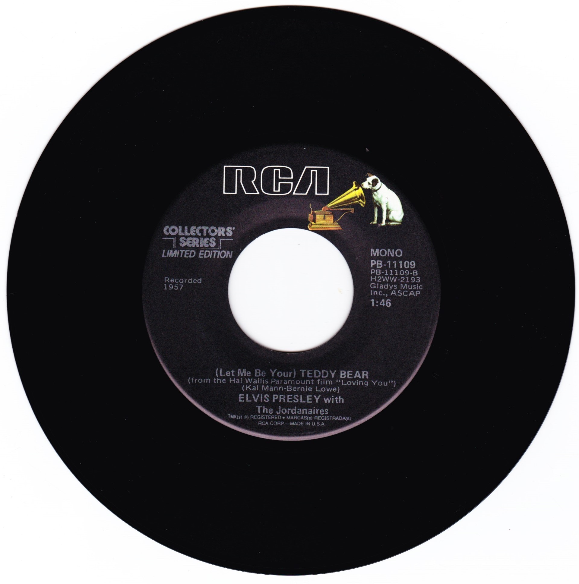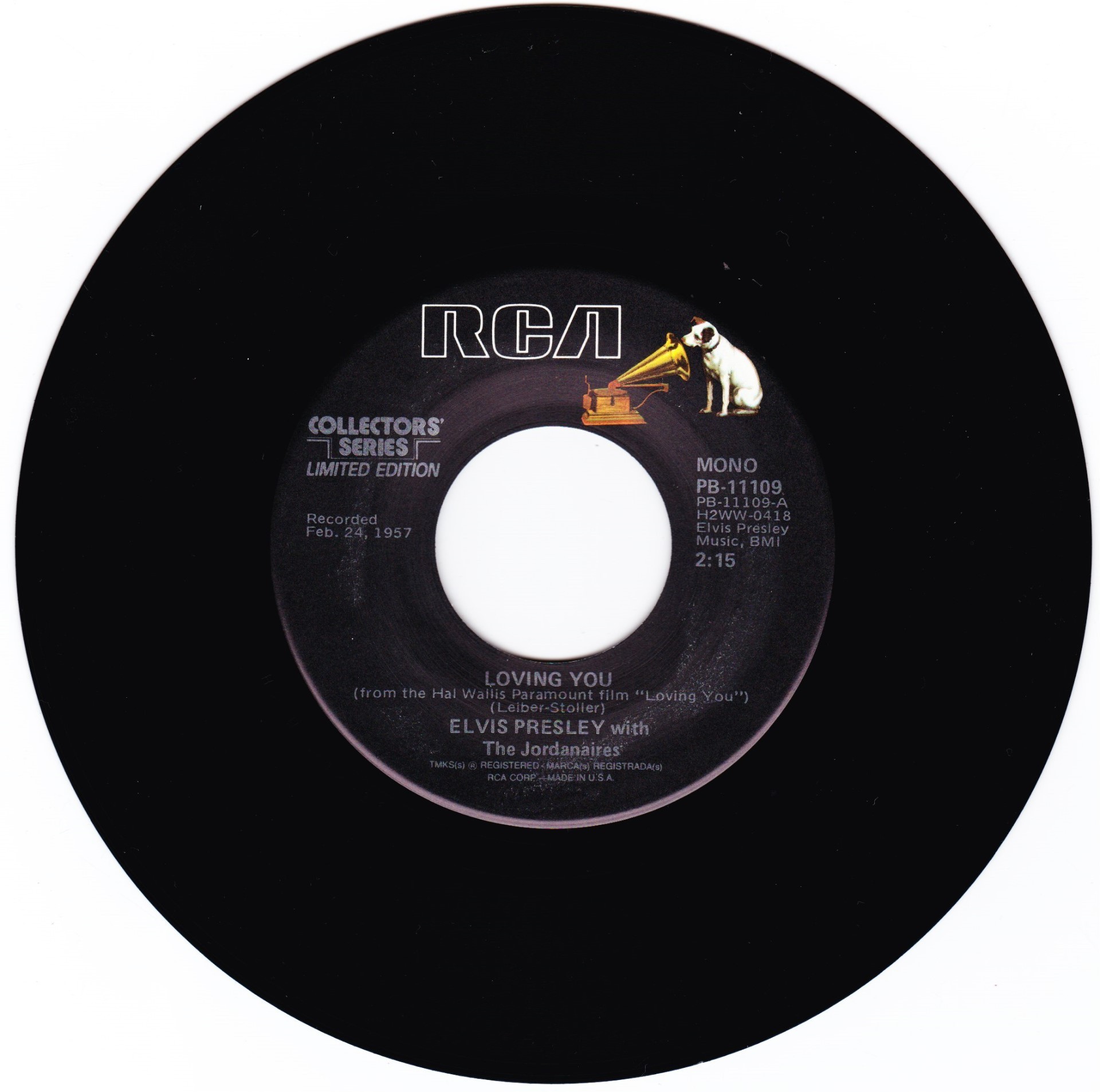 | Details : Reissue with new catalogue number Side A : Loving You Side B : (Let Me Be Your) Teddy Bear Front Cover : Picture Sleeve Rear Cover : Picture Sleeve Label : Black Pressing Plant : Indianapolis Matrix Number Side 1 : H2 - WW 0418 - 16 A6 PB - 11109 - A (Machine Stamped) Matrix Number Side 2 : H2 - WW 2193 - 14 A5 PB - 11109 - B (Machine Stamped) *NOTE* PB - 11109 |