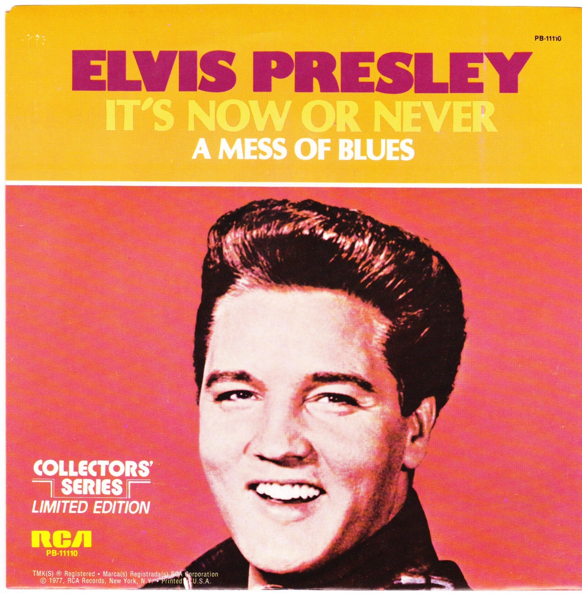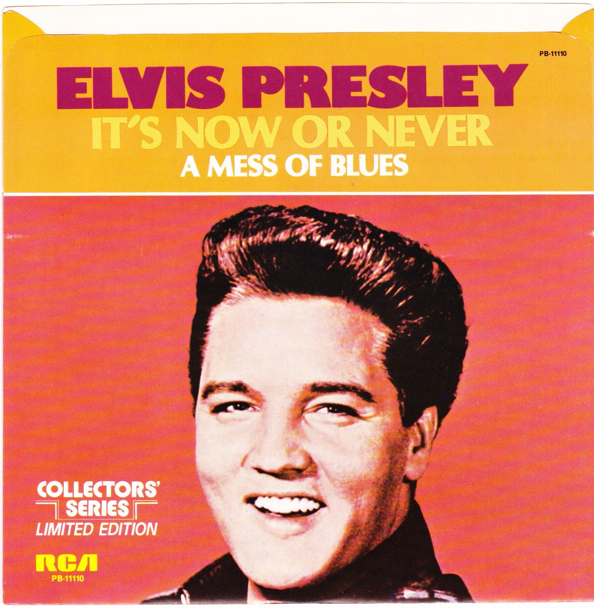 | Details : Reissue with new catalogue number Side A : It's Now Or Never Side B : A Mess Of Blues Front Cover : Picture Sleeve Rear Cover : Picture Sleeve Label : Black Pressing Plant : Indianapolis Matrix Number Side 1 : L2 - WW 0100 - 32S A1 PB - 11110 - A (Machine Stamped) Matrix Number Side 2 : L2 - WW 0085 - 13S A2 PB - 11110 - B (Machine Stamped) *NOTE* PB - 11110 |