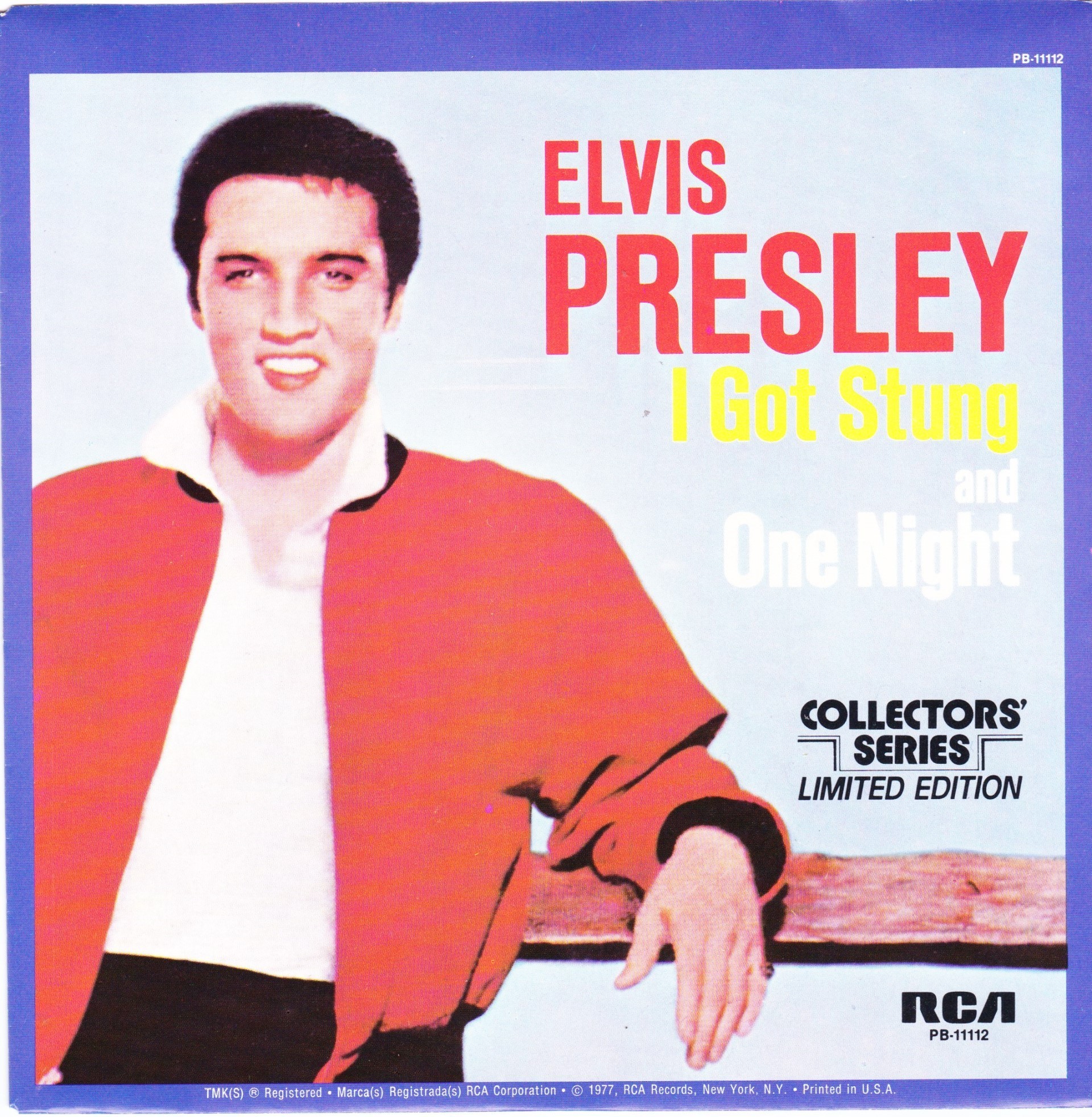 | Details : Reissue with new catalogue number Side A : I Got Stung Side B : One Night Front Cover : Picture Sleeve Rear Cover : Picture Sleeve Label : Black Pressing Plant : Indianapolis Matrix Number Side 1 : J2 - WW 3257 - 13S AC A (Machine Stamped) PB - 11112 - A (Hand Etched) Matrix Number Side 2 : H2 - WW 0415 - 13S A2 PB - 11112 - B (Machine Stamped) *NOTE* PB - 11112 |