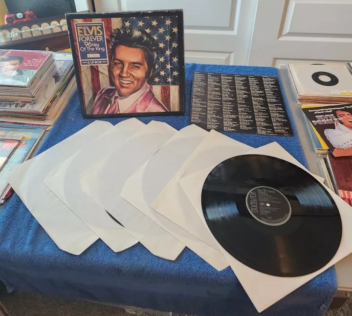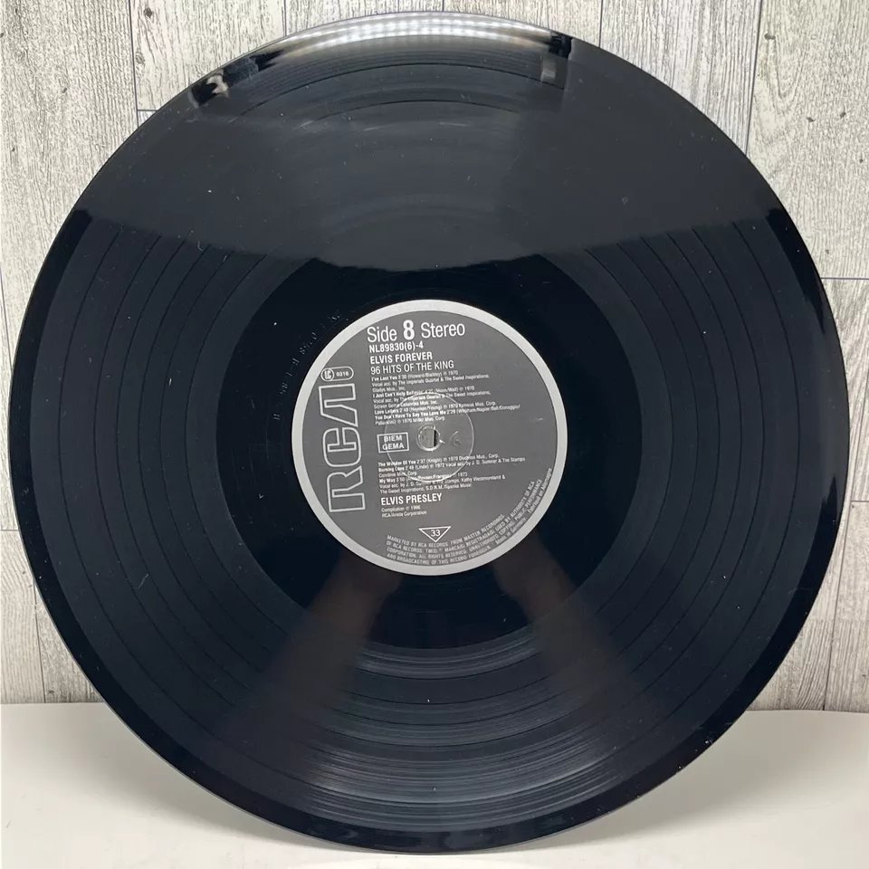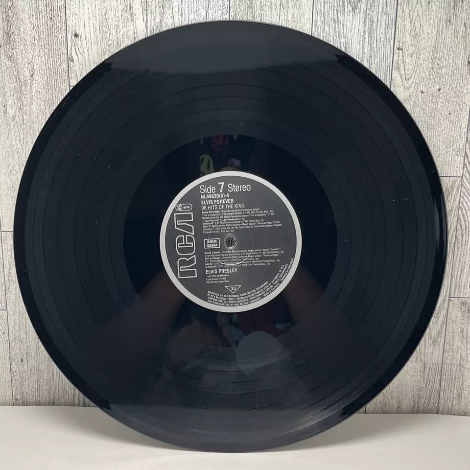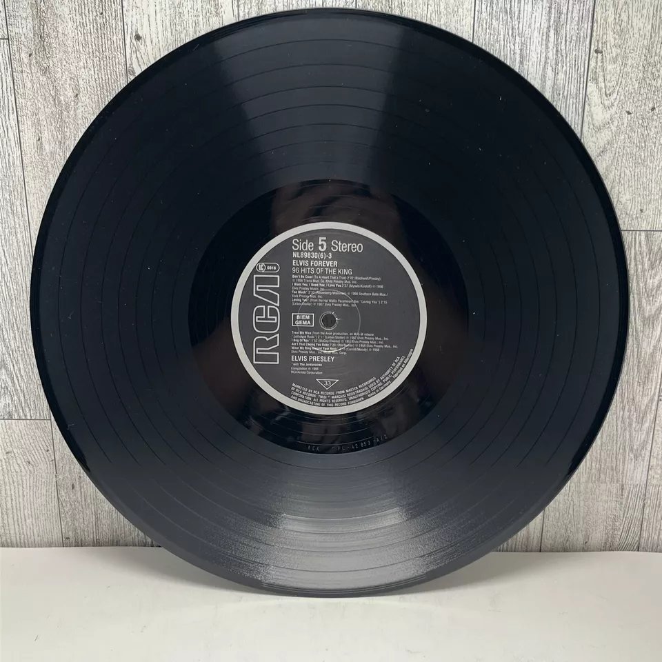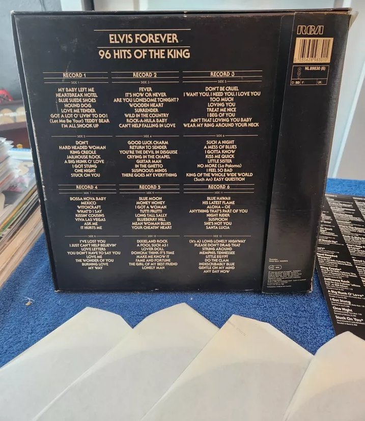 RCA – NL 89 830 (6) 01: My Baby Left Me 02: Heartbreak Hotel 03: Blue Suede Shoes 04: Hound Dog 05: Love Me Tender 06: Got A Lot O' Livin' To Do! 07: (Let Me Be Your) Teddy Bear 08: I'm All Shook Up Side 2: 01: Don't 02: Hard Headed Woman 03: King Creole 04: Jailhouse Rock 05: A Big Hunk O' Love 06: I Got Stung 07: One Night 08: Stuck On You Side 3: 01: Fever 02: It's Now Or Never 03: Are You Lonesome Tonight? 04: Wooden Heart 05: Surrender 06: Wild In The Country 07: Rock-A-Hula Baby 08: Can't Help Falling In Love Side 4: 01: Good Luck Charm 02: Return To Sender 03: You're The Devil In Disguise 04: Crying In The Chapel 05: Guitar Man 06: In The Ghetto 07: Suspicious Minds 08: There Goes My Everything Side 5: 01: Don't Be Cruel (To A Heart That's True) 02: I Want You, I Need You, I Love You 03: Too Much 04: Loving You 05: Treat Me Nice 06: I Beg Of You 07: Ain't That Loving You Baby 08: Wear My Ring Around Your Neck Side 6: 01: Such A Night 02: A Mess Of Blues 03: I Gotta Know 04: Kiss Me Quick 05: Little Sister 06: No More (La Paloma) 07: I Feel So Bad 08: King Of The Whole Wide World 09: (Such An) Easy Question Side 7: 01: Bossa Nova Baby 02: Mexico 03: Witchcraft 04: What'd I Say 05: Kissin' Cousins 06: Viva Las Vegas 07: Ask Me 08: It Hurts Me Side 8: 01: I've Lost You 02: I Just Can't Help Believin' 03: Love Letters 04: You Don't Have To Say You Love Me 05: The Wonder Of You 06: Burning Love 07: My Way Side 9: 01: Blue Moon 02: Money Honey 03: I Got A Woman 04: Tutti Frutti 05: Long Tall Sally 06: Blueberry Hill 07: Mean Woman Blues 08: Your Cheatin' Heart Side 10: 01: Dixieland Rock 02: (Now And Then There's) A Fool Such As I 03: Lover Doll 04: Doncha' Think It's Time 05: Make Me Know It 06: Fame And Fortune 07: The Girl Of My Best Friend 08: Lonely Man Side 11: 01: Blue Hawaii 02: (Marie's The Name) His Latest Flame 03: Aloha - Oe 04: Anything That's Part Of You 05: Night Rider 06: Suspicion 07: She's Not You 08: Santa Lucia Side 12: 01: (It's A) Long Lonely Highway 02: Please Don't Drag That String Around 03: Memphis, Tennessee 04: Little Egypt 05: Do The Clam 06: Indescribably Blue 07: Gentle On My Mind 08: Any Day Now Distributed By – RCA, Ariola Phonographic Copyright ℗ – RCA Schallplatten GmbH Copyright © – RCA Schallplatten GmbH Comes with a plastic "3D-Poster".Rights Society: BIEM and GEMA Label Code: LC 0316Elvis Forever 96 Hits Of The King NL 89 830 (6) |