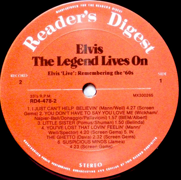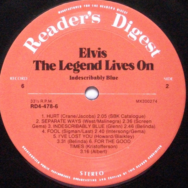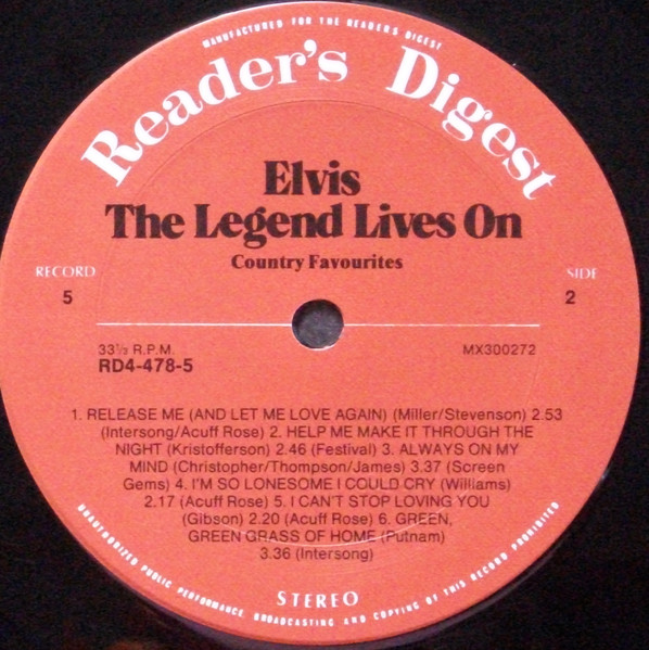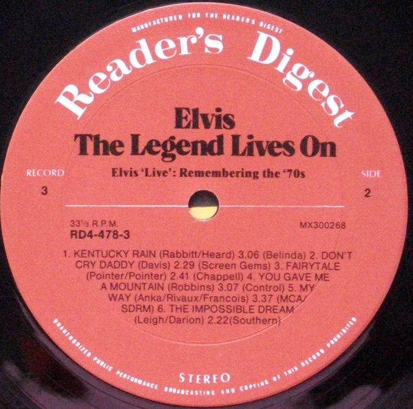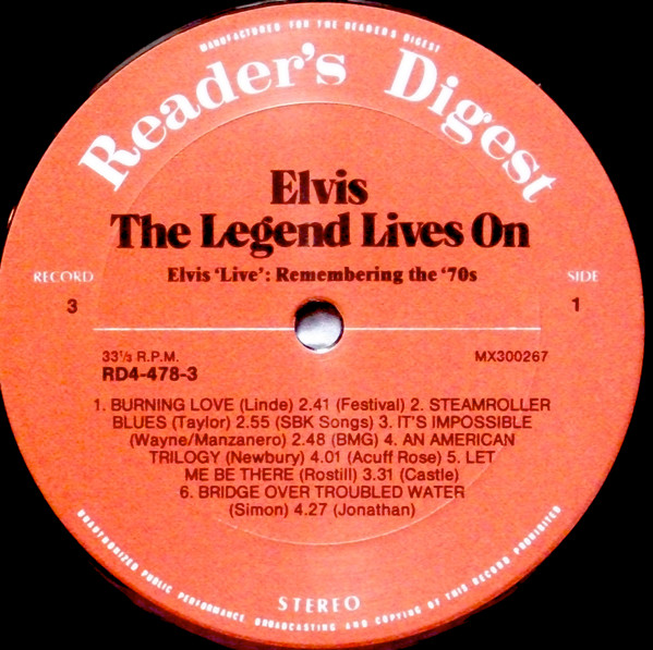 Elvis – The Legend Lives On Reader's Digest – RD4-478-1, Matrix / Runout (A side run-out Etched): |
