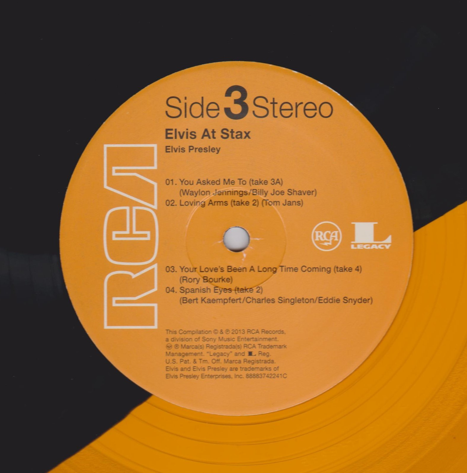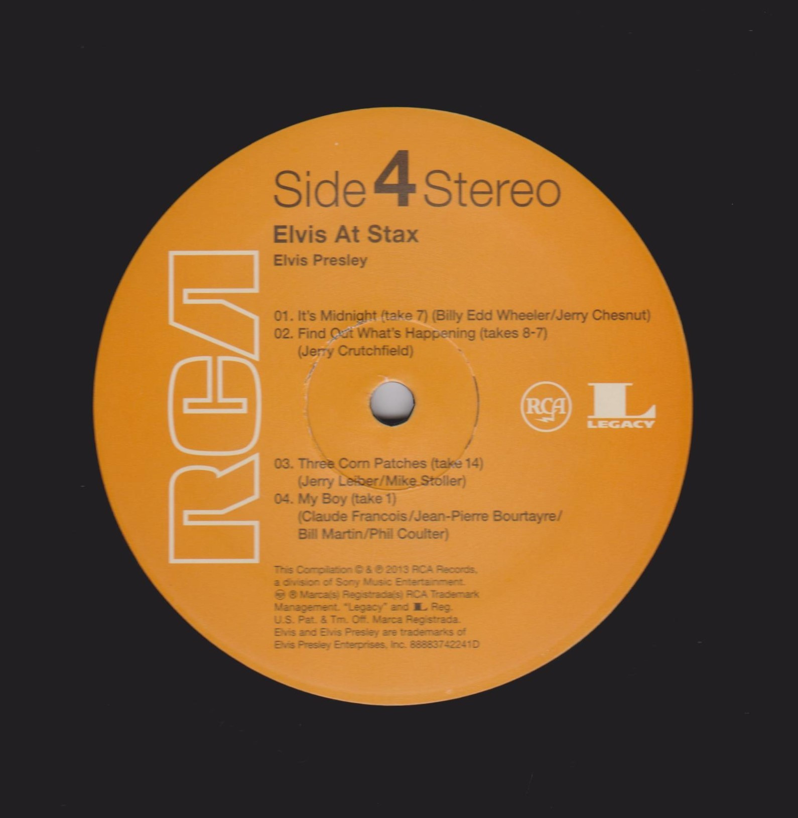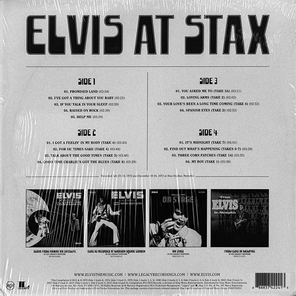 | Details : 2013 Reissue Front Cover : Photo of Elvis. Title to the left. Catalogue number on hype sticker. Rear Cover : Promoting 4 Elvis albums. Catalogue number bottom right. Label : Orange. Side 1 : Elvis At Stax Below Stereo. Side 2 : Elvis At Stax Below Stereo. Side 3 : Elvis At Stax Below Stereo. Side 4 : Elvis At Stax Below Stereo. Pressing Plant : United Record Pressing, Nashville Matrix Number Side 1 : 8888 - 3742241 - A KRGECA ? (Hand Etched) Matrix Number Side 2 : 8888 - 3742241 - B KRGECA ? (Hand Etched) Matrix Number Side 3 : 8888 - 3742241 - C KRGECA ? (Hand Etched) Matrix Number Side 4 : 8888 - 3742241 - D KRGECA ? (Hand Etched) *NOTE* 2 LP set. 2 Hype sticker. One states "40th Anniversary Of Elvis' Classic Recordings At Legendary Stax Studios". Second one states "Newbury Comics Exclusive". This release is on Half Black / Half Gold vinyl with a Limited number of 1000. This copy is No 00200. No insert with release. Came with a new bar code catalogue number on rear cover 8-88751-27861-5-3. |