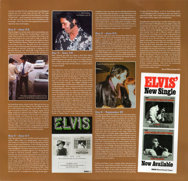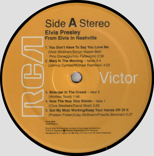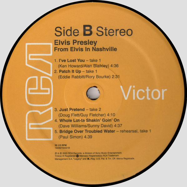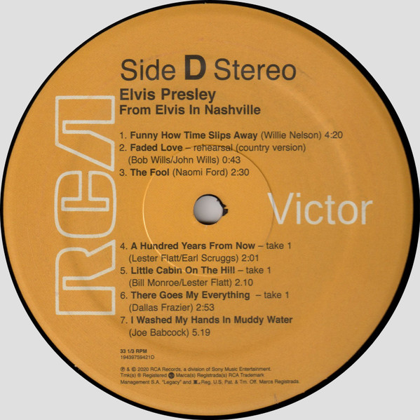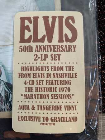 D : Phonographic Copyright ℗ – RCA Records Two LP distillation of the From Elvis In Nashville compact disc set. 50th anniversary of the 1970 "Marathon Sessions". Gatefold cover. Includes some previously released tracks newly mixed. Includes digital download coupon. Runouts are stamped except "A3",