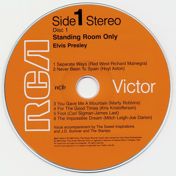 ROOM ONLY Side A: Seperate Ways/ Never Been To Spain/ You Gave Me A Mountain/ For The Good Times/ Fool/ The Impossible Dream Side B: Burning Love/ Always On My Mind/ It's A Matter Of Time/ It's Over/ It's Impossible/ Where Do I Go From Here/ An American Trilogy Side C: Always On My Mind (Take 2)/ Burning Love (Takes 3 & 4)/ Seperate Ways (Undubbed - Takes 1-5, 11-13, 20 & 21)/ For The Good Times (Takes 1 & 2)/ Where Do I Go From Here (Take 6) Side D: Fool (Take 1)/ It's Matter Of Time (Takes 1-4)/ Burning Love (Take 2)/ For The Good Times (Take 3)/ Where Do I Go From Here (Takes 7 & 8 )/ Always On My Mind (Take 4) Released: July 10, 2009 Cat.-No.: LSP-4762 (88697-484441) Format: 12'' / 33 ? rpm (2 Record Set) |