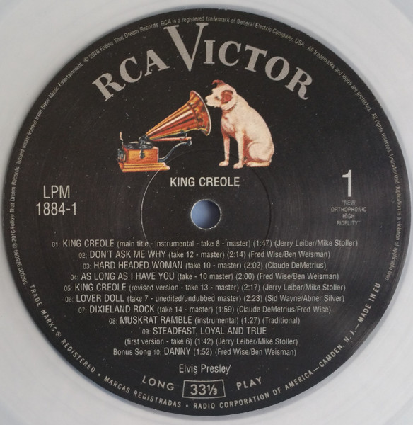 CREOLE - THE MONO MONITOR MIXES Side A: King Creole (Main Title - Instrumental - Take 8 - Master)/ Don’t Ask Me Why (Take 12 - Master)/ Hard Headed Woman (Take 10 - Master) - As Long As I Have You (Take 10 - Master) - King Creole (Revised Version - Take 13 - Master)/ Lover Doll (Take 7 - Unedited - Undubbed Master)/ Dixieland Rock (Take 14 - Master)/ Muskrat Ramble (Iinstrumental)/ Steadfast, Loyal And True (First Version - Take 6) Bonus Song: Danny Side B: New Orleans (Take 5 - Master)/ Young Dreams (Take 8 - Master)/ King Creole (First Version - Take 3)/ As Long As I Have You (Long Version - Take 8)/ Trouble (Take 5 - Master)/ Crawfish (Take 7 - Unedited Master)/ King Creole (First Version - Take 18)/ Steadfast, Loyal And True (Undubbed Record Master)/ Lover Doll (Master - With Jordanaires Overdub) Released: February 2016 Cat.-No.: LPM-1884-1 (506020-975099) (Clear Vinyl) Format: 12'' / 33 ? rpm (Long Play) |