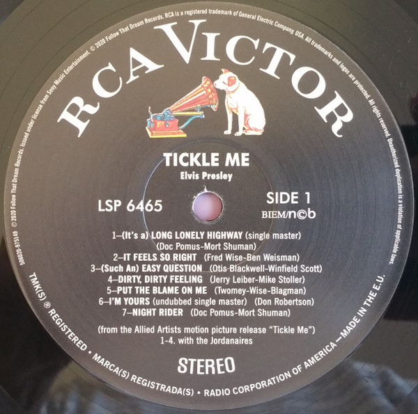 TICKLE ME Side A: (It’s A) Long Lonely Highway (Single Master)/ It Feels So Right/ (Such An) Easy Question/ Dirty, Dirty Feeling/ Put The Blame On Me/ I´m Yours (Undubbed Single Master)/ Night Rider Side B: I Feel That I´ve Known You Forever/ Slowly But Surely Bonus Songs: Just For Old Time Sake/ Gonna Get Back Home Somehow/ There´s Always Me/ Make Me Know It/ Something Blue/ Allied Artists Radio Spot (Version 1) Side C - Outtakes: (Such An) Easy Question (Take 1)/ Night Rider (Remake - Take 5)/ Put The Blame On Me (Take 1 & 2)/ Dirty, Dirty Feeling (Take 1)/ It Feels So Right (Take 2)/ I Feel That I´ve Known You Forever (Take 3)/ Slowly But Surely (Take 1)/ Allied Artists Radio Spot (Version 2) Side D - Mono Masters: US EP (Side 1): I Feel That I´ve Known You Forever/ Slowly But Surely US EP (Side 2): Night Rider/ Put The Blame On Me/ Dirty, Dirty Feeling UK EP - Volume 2 - (Side 1): It Feels So Right/ (Such An) Easy Question UK EP - Volume 2 (Side 2): (It’s A) Long Loney Highway (Single Master)/ I´m Yours (Undubbed Single Master) Released: June 2020 Cat.-No.: LSP-6465 Format: 12'' / 33 ? rpm (2 Record Set) |