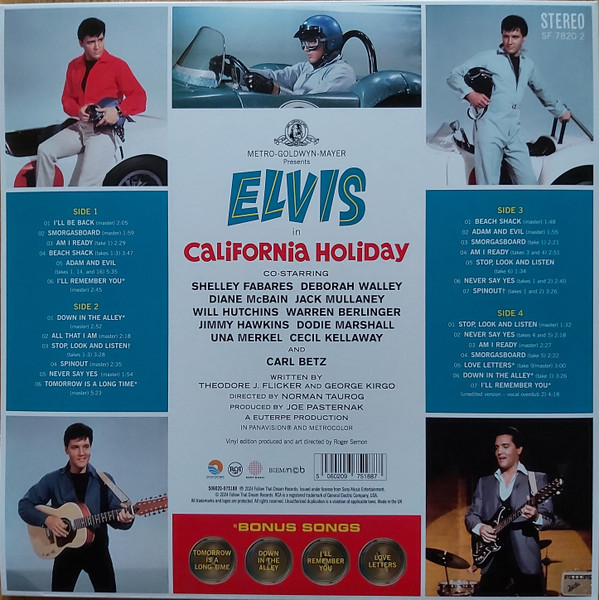 (AKA Spinout) Label: Follow That Dream Records – 506020-975188, RCA Victor – SF-7820-2 Format: 2 x Vinyl, LP, Album, Limited Edition, Special Edition, Stereo Country: Europe Released: 2024 Side A: 01: I'll Be Back (Master) 02: Smorgasboard (Master) 03: Am I Ready (Take 1) 04: Beach Shack (Takes 1-3) 05: Adam And Evil (Takes 1, 14, 16) 06: I'll Remember You (Master) Side B: 01: Down In The Alley (Master) 02: All That I Am (Master) 03: Stop, Look And Listen (Takes 1-3) 04: Spinout (Master) 05: Never Say Yes (Master) 06: Tomorrow Is A Long Time (Master) Side C: 01: Beach Shack (Master) 02: Adam And Evil (Master) 03: Smorgasboard (Take 1) 04: Am I Ready (Takes 3, 4) 05: Stop, Look And Listen (Take 6) 06: Never Say Yes (Takes 1, 2) 07: Spinout (Takes 1, 2) Side D: 01: Stop, Look And Listen (Master) 02: Never Say Yes (Takes 4, 5) 03: Am I Ready (Master) 04: Smorgasboard (Take 5) 05: Love Letters (Take 9/Master) 06: Down In The Alley (Take 1) 07: I'll Remember You (Unedited Version - Vocal Overdub) Design, Artwork – Jimmy Carpenter (2) Producer [Vinyl Edition], Art Direction – Roger Semon180g Heavyweight Vinyl Barcode: 5060209751887 |