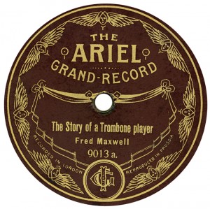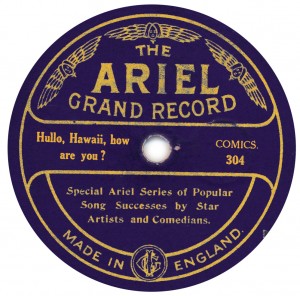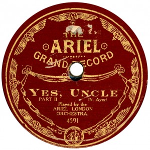 been found as Winners with Ariel paste-overs, from the early 1920s. As far as dance music is concerned, in the early 1920s, Ariel was using Zonophone masters and some sides by "Jack Hylton's Jazz Band" may be found, along with others of a similar period, with a 2000 catalogue series, often anonymous. Generally, apart from this, almost all dance records are labelled as by "Ariel Dance Orchestra".In the later 1920s, was a 1000 series, again from Zonophone issued sides by the various Bert Firman groups (see picture 1.) Overlapping with this, Ariel used masters from Parlophone from about 1924 until 1938, using a 4000 series Catalogue number, later prefixed with a "Z". This included many American masters from OKeh records. Although Ariel has not been entirely catalogued, I have not found any using masters not already issued on Parlophone, though it is possible, especially as Parlophone did not use all the masters sent to them by OKeh.The label design changed little over the years as can be seen by the pictures here. There were also Classical series of "Ariel Celebrity Records" in a 10¾" size. The blue example shown here, is a rare "paste-over" Ariel of a different colour. This one was pasted over a Bell or Winner.Finally, the Ariel Concert is a 12" issue. |