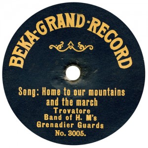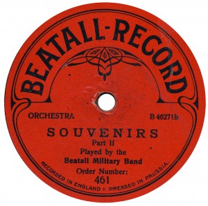 | A rare label. It is believed that the proprietor was a dealer named Lloyd Thomas. They date from about 1913 & 1914. Several sources of masters are known: Bel Canto, Invicta, ILCO and Operaphone – all German concerns. Your attention is drawn to the oddity that the face number on the label is a combination of the catalogue number with the master number embedded in it. E.g. on Beatall 451, we have cat no. 451 and master 3243 and end up with: 4532431. The source of master 3243 is not known to us; but if there was a composite number like 4551996, the 5000 series number embedded in it would almost certainly indicate a Bel Canto master. | ||||