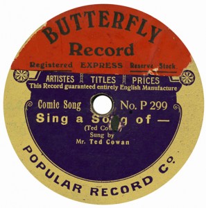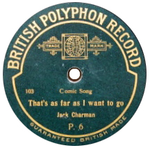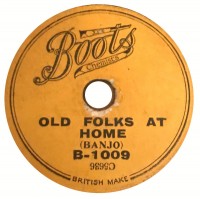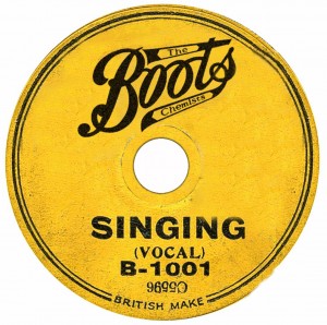 | In about 1922, Boots the Chemists, a manufacturing chemical company who also had (& still do) a huge nationwide chain of pharmacies, had records made for them by the Universal Music Company – often loosely referred to as ‘Vocalion’. They were small discs, and came in two sizes: 5.375" (13.5cm) and 6.5" (16.5cm). It is not known which came first. 6.5" is a most unusual diameter for ‘mini-discs’; possibly unprecedented. They were double sided. They are hardly ever seen, so the venture probably didn’t last very long. Indeed originally, the very few known, all had the Boots logo defaced, and this gave rise to the theory that they may never have been put on sale, and may have been given out as ‘freebies’ once the Boots mark had been obliterated. | ||||