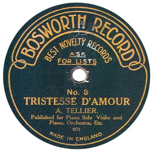 | Bosworth were music publishers. In order to promote their works, in about 1916 or 1917 they had records made for them. They were derived from the Guardsman masters of the Invicta Record Co., and were pressed by Crystalate. The label bears the slogan ‘Best Novelty Records – ask for list’. Few people can have done so, for this type of Bosworth record is incredibly rare. Whether or not the Invicta Co. recordings were custom made for Bosworth, or were simply derived from Bosworth publications already recorded by Invicta is not known. Surely the former would be more likely? This ‘Tristesse d’Amour’ was issued on Guardsman 769 as National Citizen Orchestra. Later, Bosworths had another label which acted both as a sampler for their scores, and also for ‘Library Music’. | ||||