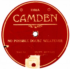 | We believe that underneath these Australian Camden labels, we will find a British Vocalion. In 1927, Vocalion introduced their 8"Broadcast label, having given up making 10" discs. Remaining stocks of the latter were jobbed off and exported to Australia, where Camden labels were affixed. So some Camdens will be electrically recorded, and some by the old mechanical system. It is the latter that qualifies them to appear on this page. There was also a light blue label of the same design with dark blue printing. | ||||