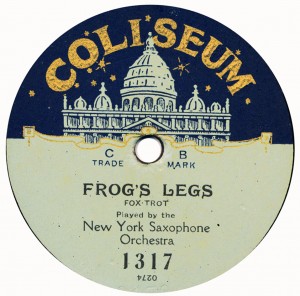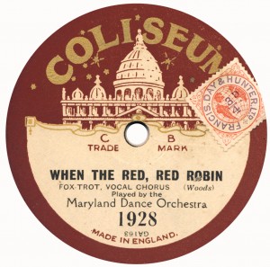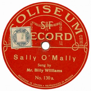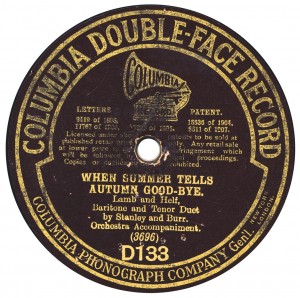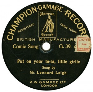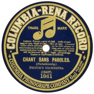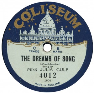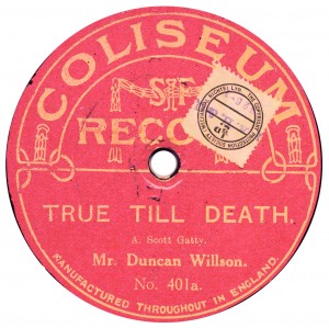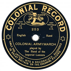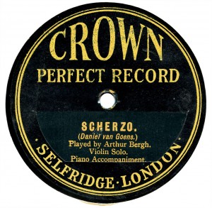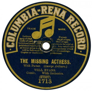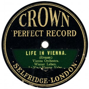 (sometimes just the title) on the original Columbia label underneath. The discs were recorded not later than 1905. Frank Andrews informed Arthur that single-sided Columbia were all deleted in 1908, so you may surmise that Selfridges bought some – or all – of the remaining stocks and stuck their own labels on them. Seven examples turned up together, but Arthur had never seen one before, thus making this label exceptionally scarce. Also we can also show another type, which differs by having only a ‘half-label’. Thus, Selfridge’s are not mentioned, and the disc actually displays not only the original Columbia catalogue number, but also the rightful maker. Obviously, we wonder which sort came first? Well, many early single-sided Columbias carried a ‘back sticker’ – a printed label listing patent numbers, resale price maintenance &c. (one type of these – there were several versions – may be seen under Columbia, above). Reports state that the ‘back sticker’ on one of these discs have been covered up with black paper. This must have been tedious, not to mention the cutting out of variously-shaped slots in the full Crown Perfect label. Accordingly, it is suggested that this ‘fiddly’ procedure was employed first; and that later, Selfridges abandoned it, settling for the half-label, either with or without the approval of Columbia. (26710 has no ‘back sticker’ anyway; its use was eventually abandoned by Columbia – another indicator that the half label is later?) |
